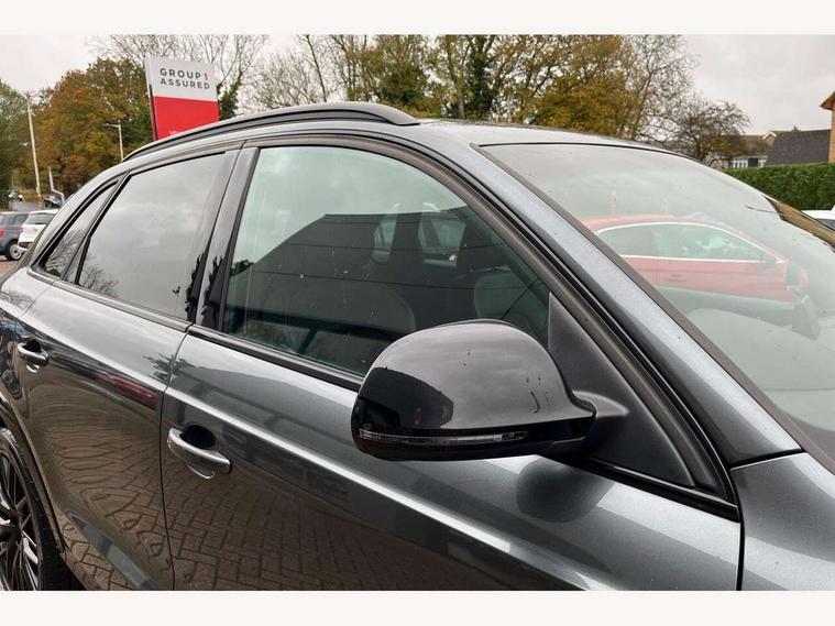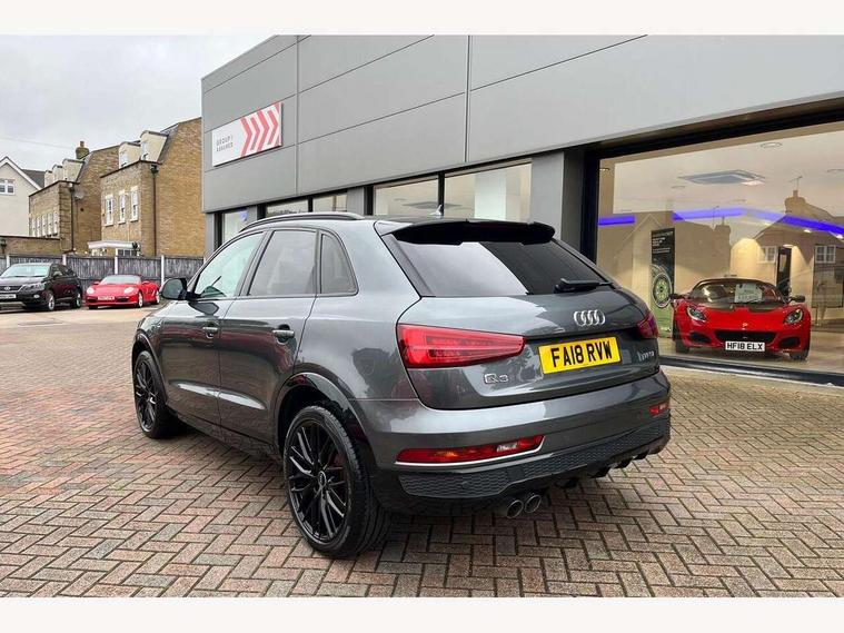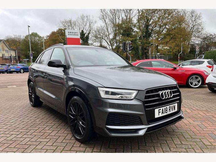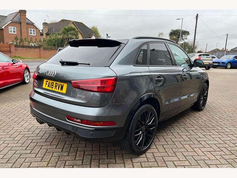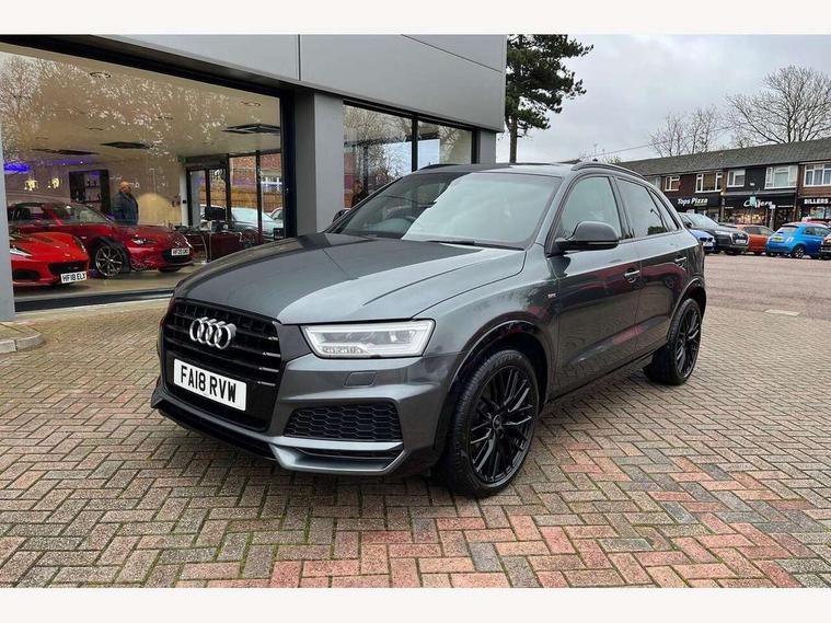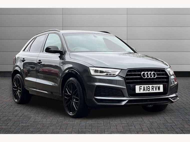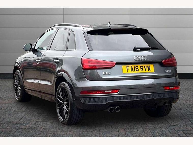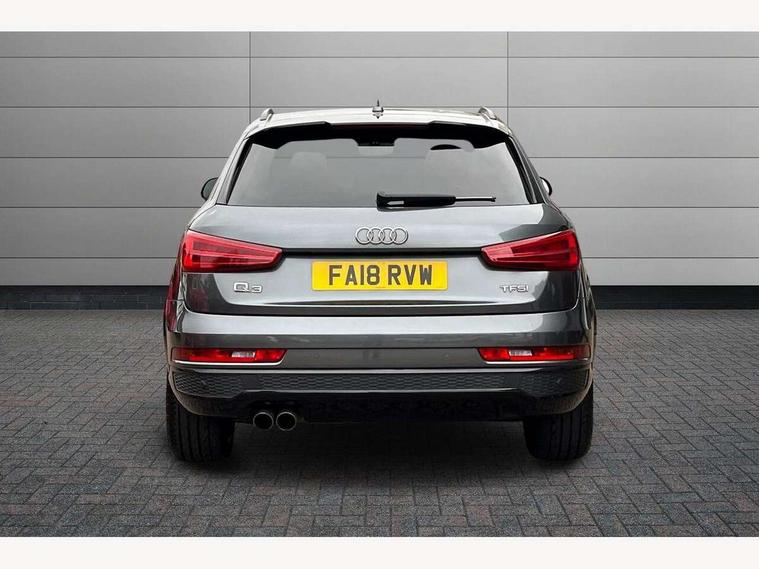 6.5" colour display screen, Audi drive select, Cruise control, Electro-mechanical PAS, Low washer fluid indicator, MMI - Multi Media Interface control system, On board computer, Remote electric boot opening/closing, Service interval indicator, Voice control system, Sports suspension, Audi music interface, BOSE sound system, DAB digital radio module, Acoustic windscreen, Aluminium window surround, Auto dimming rear view mirror, Black exhaust tailpipes, Black high gloss door mirrors, Black roof rails, Coming home function, Door mirror integrated indicators, Front and rear electric windows, Front fog lights, Front lip spoiler, Heated windscreen washer jets, High Gloss Black Contrast Bumpers, High Gloss Black rear spoiler, LED daytime running lights, LED headlights with headlight washers, LED rear lights, Light and rain sensor for auto activation of lights and windscreen wipers, Loading sill protector in stainless steel, Privacy glass, Rear diffuser with platinum insert, Rear wiper, S Line body styling, Sunband for windscreen, 12V socket in rear centre console, 3 spoke flat bottom multi-function perforated leather steering wheel with contrast stitching and aluminium gearshift paddles, Aluminium door sill trims, Aluminium gear knob, Black cloth headlining, Door sill trim strips, Dual zone climate control, Electric front lumbar adjustment, Front and rear headrests, Front and rear velour floor mats, Front centre armrest with storage compartment and angle adjustment, Front sports seats, Height/reach adjust steering wheel, ISOFIX on front passenger and rear outer seats, Jack and tool kit, Retractable luggage cover, Reversible boot floor, Split fold rear seat, Stainless steel pedals, Storage compartment and 12V socket, Under floor storage in luggage area, Audi Exclusive black styling pack - Q3, LED interior light pack - Q3, 3x3 point rear seatbelts, ABS+Electronic Brake force Distribution, Curtain airbags, Driver and passenger airbags, Driver and passenger side airbags, EDL + ASR, Electrically operated child locks on rear doors, Electromechanical parking brake, ESP, First aid kit, Front passenger airbag deactivation, Head airbags, Seatbelt warning light, Tyre pressure monitoring system, Warning triangle, Locking wheel bolts, Remote central locking, Thatcham category 1 alarm + immobiliser, Piano black finish inlay,