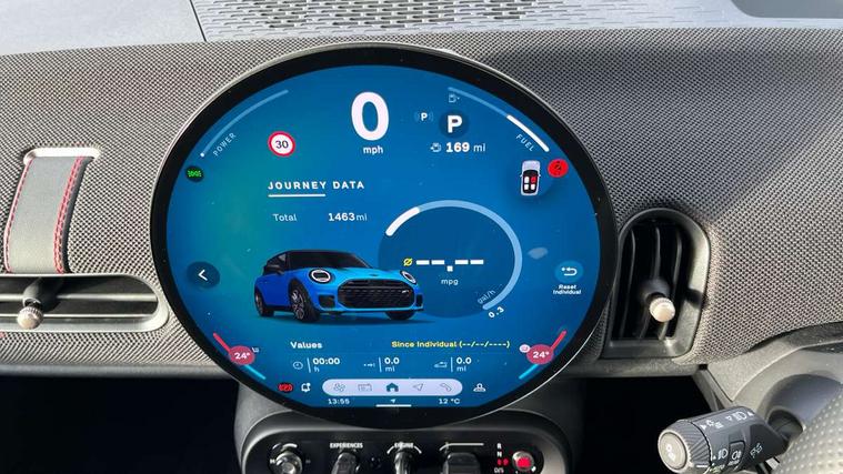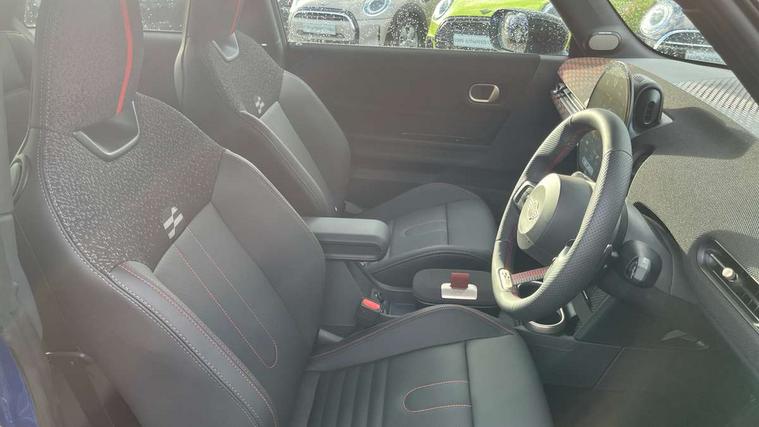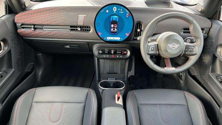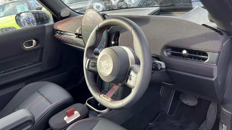 Central toggle bar, Circular OLED Screen, Compatible mobile phone bluetooth with audio streaming, Cruise control, Digital instrument cluster, Electro-mechanical speed dependant steering assistance, Emergency call service, MINI Experience Modes, Mini navigation system, On board computer, Service interval indicator, Tailgate, 7 speed steptronic transmission with double clutch, Adaptive suspension, DAB Digital radio, Personal eSim, Adaptable light signatures, Auto headlights, Electric adjustable heated door mirrors, Electric front windows, Front and rear apron, Heated rear window, Heated windscreen washer jets, High gloss black wheel arches, High gloss hexagonal patterned grille surround, JCW body kit, LED 3rd brake light, LED daytime running lights, LED indicator lights, LED rear lights, Rain sensor window wipers, Rear fog lights, Rear roof spoiler with airblades, Rear window wiper, 2 seat bench in second row, 2 zone automatic air conditioning, 60/40 rear seat bench, Ambient lighting, Black lower band in high gloss, Cupholders, Dark headliner, Front and rear head restraints, Front compact armrest, Front floor mats, Heated steering wheel, Height adjustable passenger seat, Lidded storage box in Black/Red knit, Luggage compartment lighting, Partially perforated vescin steering wheel with red accent, black/red decorative strap, Single front passenger seat, Steering wheel paddle shift, Sunvisors with vanity mirrors, Vescin/Cord combination JCW upholstery includes dash knit in black with red accents, Driving assistant pack - Cooper Hatchback, Level 1 pack - Mini Hatchback, Park assistant pack - Cooper Hatchback, 3 point seatbelts on all four seats, 6 Airbags - front, side, head and seat belt tensioners, Anti-lock braking system (ABS), Brake caliper in Black with JCW badge, DSC - Dynamic Stability Control, Electronic parking brake, Front and rear disc brakes, Front ISOFIX (iSize), Front passenger airbag deactivation, JCW Sport Brakes, Traction control, Tyre pressure monitoring system, Alarm, Immobiliser, Remote central locking, Black/Red decorative dash strap, Tyre repair kit,