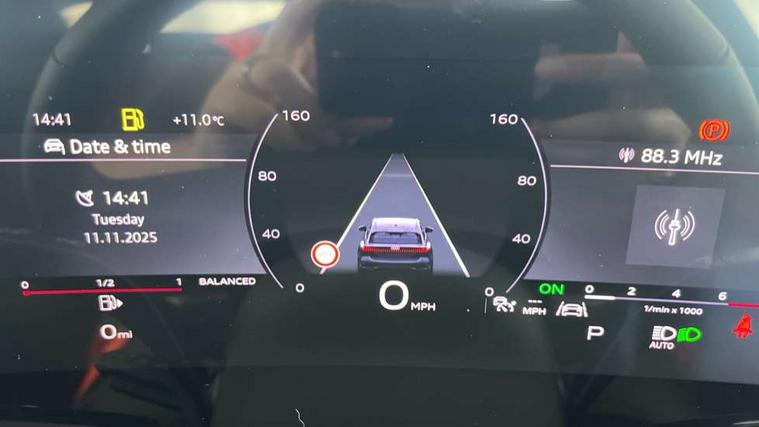 Adaptive cruise control, Advanced driver attention and fatigue montior, Audi application store, Audi assistant, Audi connect emergency call and service, Audi drive select, Audi smartphone interface, Audi virtual cockpit plus with 11.9" OLED colour display, Automatic start/stop system with coasting functionality, Camera based traffic sign recognition, Intersection assist, Lane departure warning, MMI navigation plus with high resolution 14.5" OLED touchscreen colour display, Park assist plus, Parking system plus with 360 display, Progressive steering with servotronic, Rear view camera, Swerve assist and turn assist, Traffic sign based speed limiter, Comfort suspension, 2 USB-C ports in both the front and rear, Audi sound system impressive sound with 10 loudspeakers including centre speaker and subwoofer, 6-channel amplifier with a total output of 180 watts, DAB digital radio reception, Smartphone compartment with wireless charging, Aluminium roof rails, Aluminium window trims, Auto dimming rear view mirror, Body colour door mirrors, Door mirrors - electrically adjustable, heated, folding and auto dimming on both sides, Front and rear electric windows, Front door sill trims with aluminium inlays, illuminated, High beam assist, LED headlights Plus incl. digital daytime running lights, turning light, all-weather light, motorway light, manouevring light and intersection light, LED rear lights pro incl. dynamic rear indicators and illuminated light strip with animated coming and leaving home function, LED third brake light, Rear and side windows with heat insulating glass, Rear side wing doors, Rear wash/wipe, Sport bumpers, radiator grille and diffuser in scandium grey and diffuser insert in matt selenite silver, White rhombus logo projection light in exterior mirrors, Windscreen with acoustic glazing, 3 rear headrests, 3 seat rear bench, 3-zone automatic climate control, 40:20:40 split folding rear seat bench with centre armrest and cup holders, Comfort front centre armrest, Front and rear floor mats, Front seats with manual adjustment for position and 4-way electric lumbar support, Front sport seats with integrated head reastrains, Heated front seats, i-Size child seat mounting on the front passenger side and outer rear seats, i-Size and top tether on the outer rear seats, Luggage compartment lid, electrically opening and closing, Manual steering column height and depth adjustment, Rock grey cloth headlining, Single front passenger seat, Twin leather upholstery, Twin spoke leather steering wheel with multi-function buttons with touch control, shift paddles and trim in chrome look, Ambient lighting package plus - A5, 3x3 point rear seat belts, Driver airbag, Electric child safety locks, First aid kit with warning triangle and vests, Front emergency brake assist, Front passenger airbag, Front passenger airbag deactivation, Front side airbags with head airbag system and front interaction airbag, Hill hold assist, Seat belt monitoring with rear seat occupant reminder, Tyre pressure loss indicator, Anti theft alarm, Anti-theft wheel bolts, Keyless Go, Accent surfaces and control buttons in gloss black, Black dashboard with contrast stitching, Inlays in matt brushed aluminium, silver, Softwrap in leatherette with contrast stitching, Upper and lower interior elements in leatherette, Tyre repair kit,