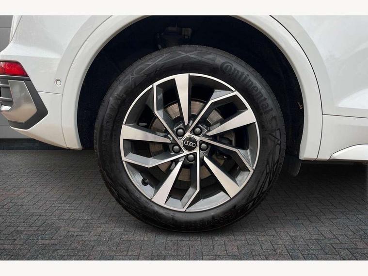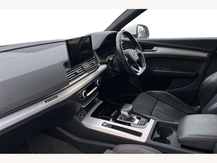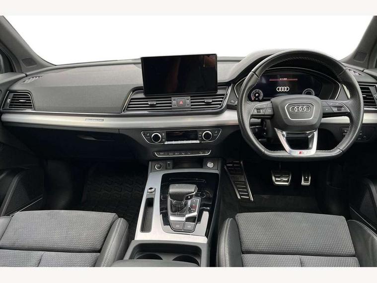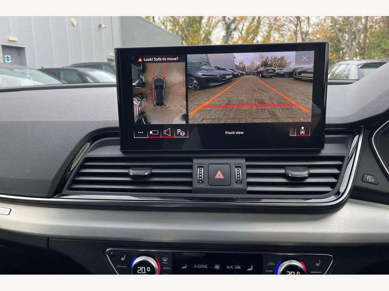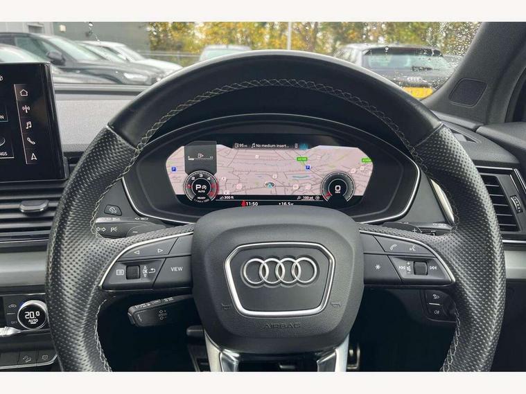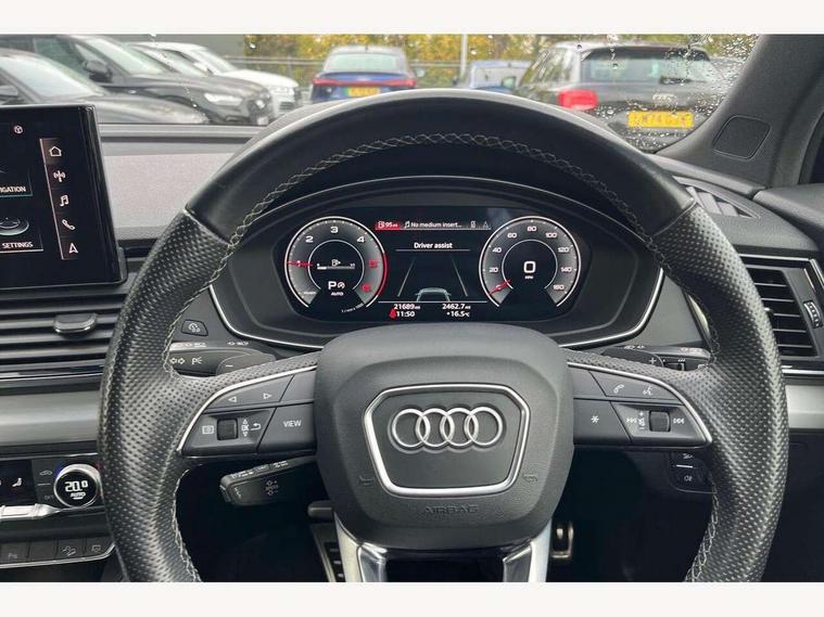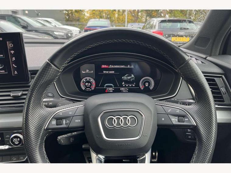 Audi connect safety and service (e-call), Audi connect with Amazon Alexa Integration, Audi drive select, Audi virtual cockpit plus with 12.3" screen and three different layout designs, Audi wireless smartphone interface, Automatic start-stop system with coasting functionality and efficiency programme, Bluetooth interface, Electro - mechanical power assisted steering, MMI navigation plus with 10.1" touch screen, Power tailgate, Reversing camera, Service interval indicator, Voice control system with Audi hotword activation "Hey Audi", Diesel particulate filter, Quattro on demand, S line sports suspension, 2 x USB charging port with aux input socket, DAB Digital radio, Acoustic windscreen, Aluminium roof rails, Audi matrix LED headlights with dynamic front and rear indicators, Auto dimming door mirrors, Auto dimming rear view mirror, Automatic headlights and windscreen wipers, Body colour door mirrors, Body colour rear diffuser with matt aluminium silver surrounds, Body colour underbody protection, Chrome plated exhaust trims, Daytime running lights, Door sills in Selenite silver, Electric adjustable/heated/folding door mirrors, Front air inlet surrounds in aluminium, Front and rear electric windows, Front radiator grille in honeycomb design, Headlight washers, High level LED brake light, Lower bumpers painted in contrast Manhattan grey, Rear chrome trim strip below lights, Rear privacy glass and rear side windows, Rear side wing doors, Rear wiper, Roof bars, S Line badges on the front wings, S Line front and rear bumpers, S Line rear spoiler, S Line side skirts, 3 rear headrests, 40:20:40 split folding 3 rear bench seat in 2nd row with rear centre armrest, Black cloth headlining, Comfort front centre armrest, Contrast stitching on seats, steering wheel and gear lever gaiter, Deluxe 3 zone electronic climate control, Front head restraints, Front/rear floor mats, Gear lever in black leather, Heated front seats, Height/reach adjustable steering column, Illuminated door sill trims with S logo, ISOFIX child seat mounting and top tether, Manual seat adjustment with 4-way electric lumbar support, Removable luggage compartment floor, Single front passenger seat, Stainless steel pedals, Sunvisors with vanity mirrors, Trunk roller cover, High gloss pack - Q5, LED interior light pack - Q5, 3 point seatbelts on all seats, 6 airbags - Driver, front passenger, curtain and side airbags, Electrically operated child locks on rear doors, Electromechanical parking brake, Electronic stabilisation control including ABS, ASR and EDL, Front passenger airbag deactivation, Hill descent control, Hill hold assist, Multi collision brake assist, Pop-up bonnet for pedestrian protection, Pre sense city, Seat belt force limiter, Seatbelt monitoring, Tyre pressure warning, Warning triangle and first aid kit, Anti theft alarm, Anti-theft wheel bolts, Keyless Go access/ignition system, Remote central locking, Matt brushed aluminium inlays,