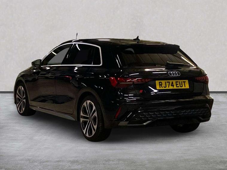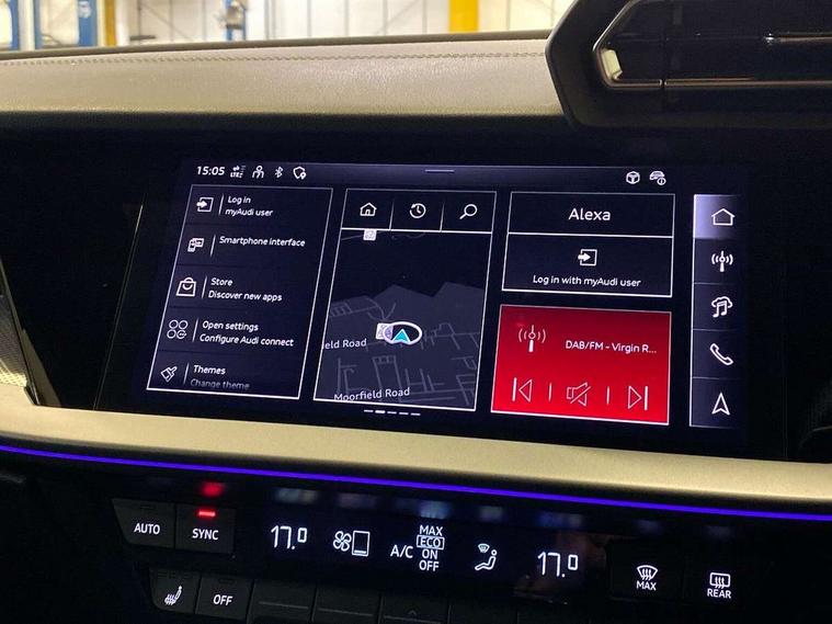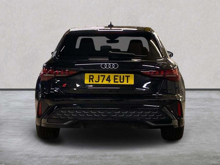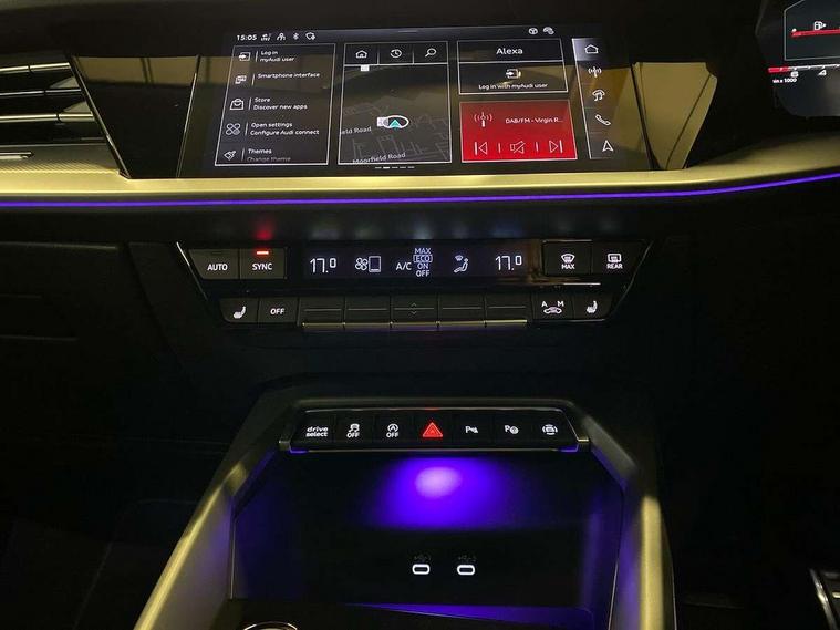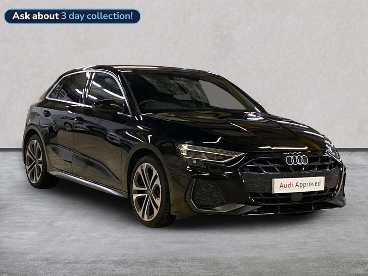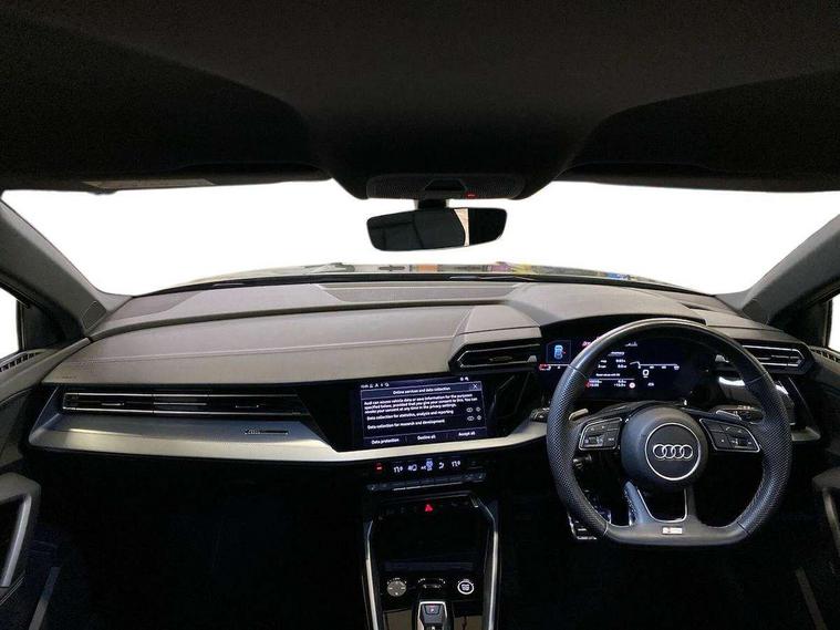 Adjustable speed limiter, Audi drive select, Audi smartphone interface with app store includes wireless Apple carplay, Android auto and Amazon alexa integration, Audi virtual cockpit plus - 12.3" full HD resolution dynamic digital instrument cluster, Automatic start/stop system with recuperation, Bluetooth interface, Camera based traffic sign recognition, Collision avoidance assistant, Cruise control, Distraction and Fatigue warning, e-Call (emergency call), Electromechanical power speed sensitive steering, Lane departure warning system, MMI Navigation Plus with high resolution 10.1" colour touch screen display, Park Assist with parking system Plus, Service indicator, Tailgate, Trip computer, Voice control system with natural language interaction, Sports suspension, Audi Phonebox light with wireless charging, Audi sound system - 10 loudspeakers including centre loudspeaker and subwoofer, DAB Digital radio, USB ports with charging function in the rear, Acoustic glass windscreen, Aluminium window trim, Auto dimming frameless rear view mirror, Body colour exterior mirrors, Chrome exhaust tailpipes, Electrically adjustable/heated/folding/auto dimming door mirrors with integrated LED indications + kerb view function for passenger side, Exterior model badging, Front and rear side air inlets in grained matt black with dark liquid chrome frame, Front electric windows, Front radiator grill in high gloss dark chrome, Heat insulating glass windscreen, Illuminated door sills with aluminium inserts at the front with S logo, LED 3rd brake light, LED daytime running lights, LED headlights with LED rear lights and dynamic rear indicators, Light and rain sensors, Privacy glass - dark tinted rear window, rear door and side windows, Rear diffuser and grill in grained matt black with inlay in dark liquid chrome, Rear electric windows, Rear side wing doors, Rear wiper, S line bumpers, S roof spoiler, Side S line emblems on front wings, Side sill trim in dark liquid chrome, 12V socket and storage compartment in front centre console, 3 seat bench in 2nd row, 3 spoke flat bottomed leather multifunction sport steering wheel with gear shift paddles, 3-zone deluxe automatic air conditioning, 4 way electrically adjustable lumbar support for driver and front passenger, 40/20/40 split folding rear seat bench, Black cloth headlining, Front and rear centre armrest in artificial leather, Front and rear headrests, Front/rear floor mats, Heated front seats, Height and reach adjustable steering wheel, Manual boot compartment lid, Manually adjustable front seats, Rear cup holders, S badging on the steering wheel, Seat side bolsters, Single front passenger seat, Stainless steel pedals and front footrest in black, Twin leather upholstery with front sports seats S embossed logo, Aluminium interior elements pack - A3 Sportback, Multi-coloured LED interior lighting package - A3, 3x3 point rear seat belts, Driver and front passenger airbag with passenger airbag deactivation, Electronic Stabilisation Control (ESC) including ABS, ASR and EDL, First aid kit with warning triangle and 2 safety vests, Front side airbags with head airbags and interaction airbag, Hill hold assist, Pre-sense front with pedestrian and cyclist detection, Seatbelt monitoring, Tyre pressure loss indicator, Anti theft alarm, Anti-theft wheel bolts, Electronically operated child locks, Immobiliser, Remote central locking with safelock, Dash & door Inlay in dark aluminium Spectrum,