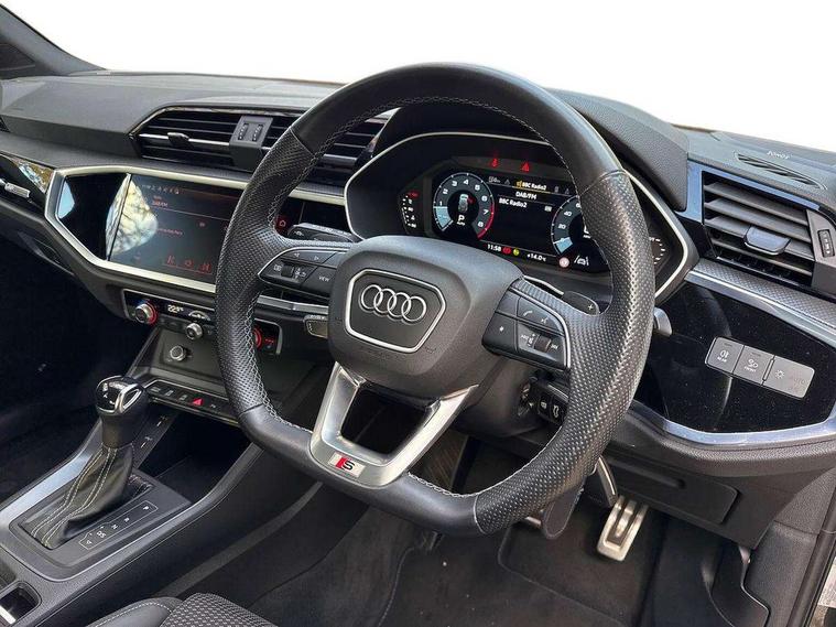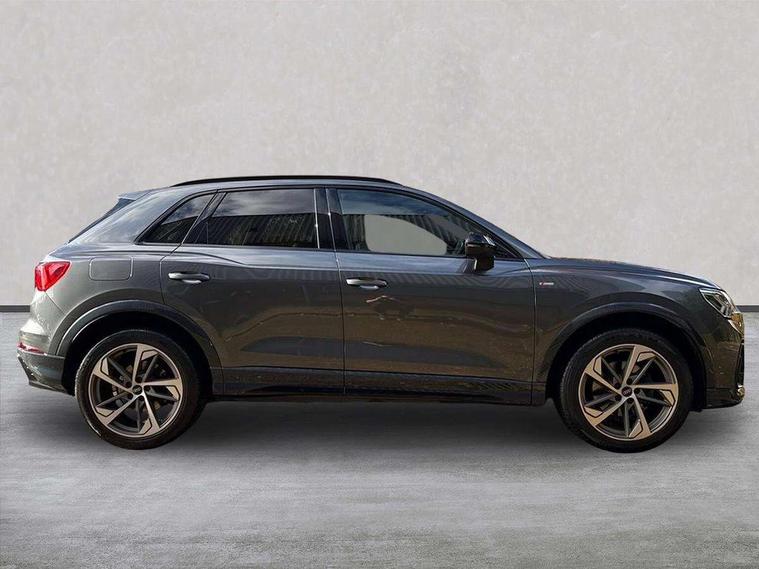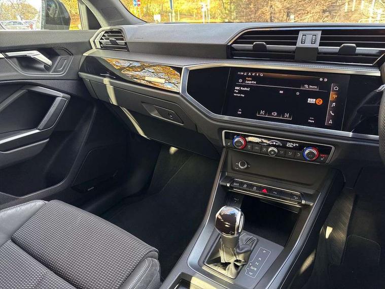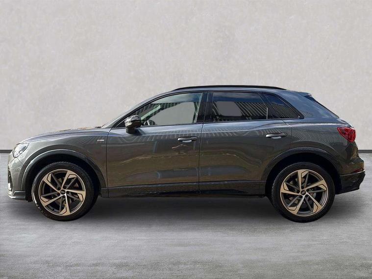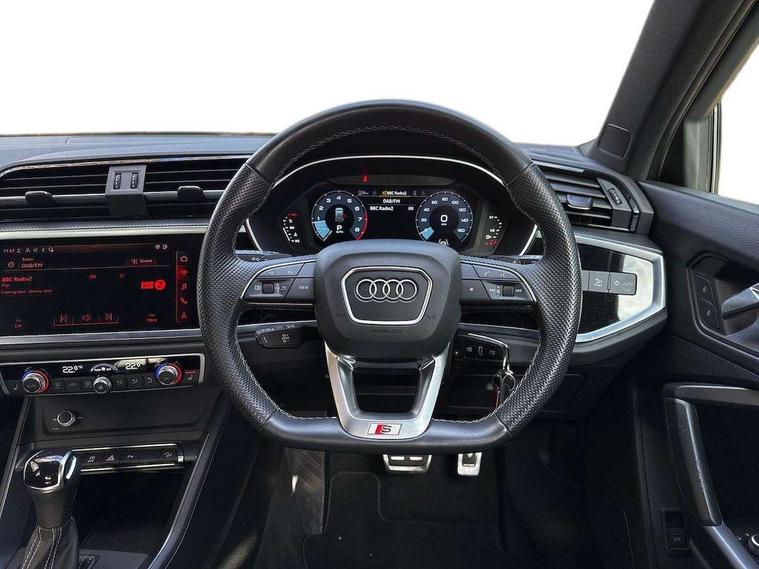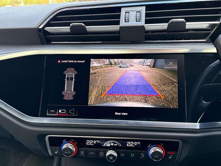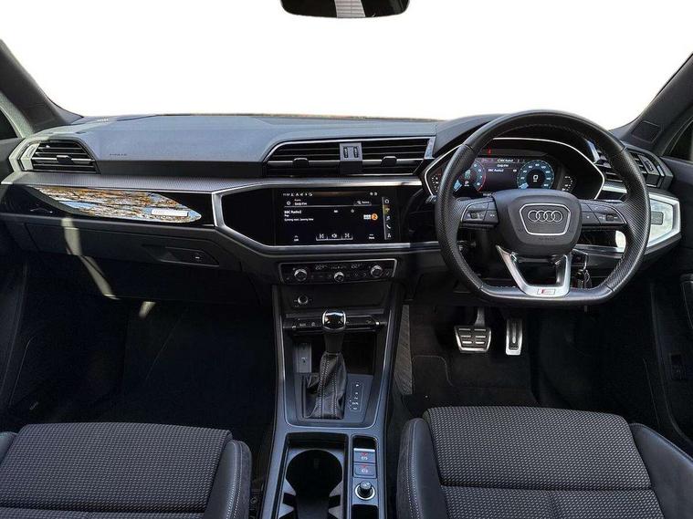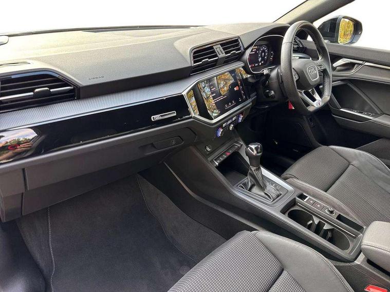 Amazon alexa Integration, Audi connect safety and service (e-call), Audi drive select, Audi lane departure warning, Audi Virtual Cockpit - 10.25" display, Bluetooth interface, Camera based traffic sign recognition, Cruise control + speed limiter, MMI Navigation Plus with high resolution 10.1 inch touchscreen colour display, Power operated tailgate, Progressive steering, Rear parking sensors, Service interval indicator, Smartphone interface includes wireless Apple carplay/Android Auto, Start stop system with recuperation, Voice control system with natural language interaction, 48V Mild hybrid technology, Sports suspension, 2 USB-C ports with charge and data functions, 6 passive loudspeakers, DAB digital radio module, Acoustic windscreen, Auto dimming frameless rear view mirror, Black roof rails, Electrically folding, adjustable and heated door mirrors with integrated LED side indicators and kerb view function for passenger side, Front and rear electric windows, Front fog lights, Grille vertical bars in aluminium silver/Matt, High gloss black finish B and C pillars, LED headlights with LED daytime running lights and dynamic rear indicator, LED rear lights, Privacy glass dark tinted rear and rear-side windows (from B-pillar backwards), Rain and light sensors, Rear diffuser strip in matt titanium black, S line bumpers in contrasting Manhattan grey, 12V socket in rear centre console, 3 spoke flat bottomed high multi-function leather sport steering wheel with gearshift paddles, 40:20:40 folding with manual adjustment for 60:40 forwards/backwards position and backrest angle, Adjustable rear seat bench/backrest with centre armrest and cupholder, Black cloth headlining, Dual zone electronic climate control, Front and rear black floor mats with contrast stitching in rock grey, Front and rear headrests, Front and rear roof module including reading lights, Front centre armrest, Glove compartment lighting, Height and reach adjustable steering wheel, Illuminated door sill trims with S logo, ISOFIX child seat mounting for front passenger with airbag deactivation and outer rear seat including top tether attachment point for outer rear seats, Luggage compartment light, Manual front seats with height adjustment, Perforated leather gearknob, Stainless steel luggage compartment sill finisher, Stainless steel pedals, Black styling pack - Q3, Non smoking pack - Q3, 3x3 point rear seatbelts, 6 airbags - Driver, front passenger, curtain and side windows, Audi pre-sense front with pedestrain and cyclist recognition, Electrically operated child locks on rear doors, Electromechanical parking brake, Electronic stabilisation control including ABS, ASR and EDL, Hill descent control, Hill hold assist, Pre sense basic, Seatbelt monitoring, Tyre pressure warning, Warning triangle and first aid kit, Anti theft alarm, Anti theft wheel bolts, Remote central locking, Detail dashboard around MMI touch colour display in glass look, black with surround in aluminium look, Leatherette door armrest, Piano black inlay, Tool kit, Tyre repair kit,
