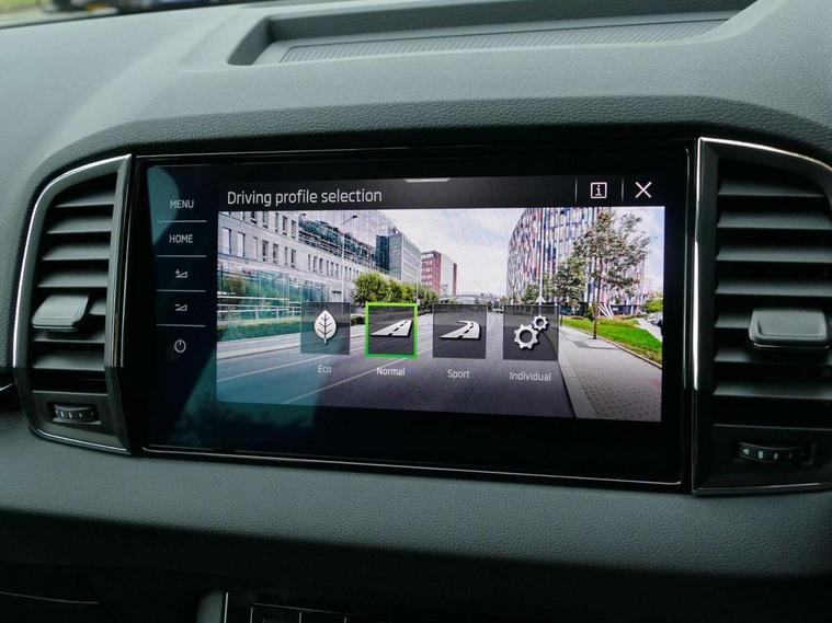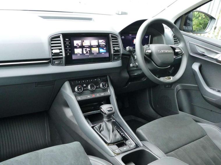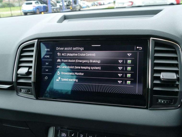 Advanced driver attention and drowsiness monitor, Drive Mode Selection including ECO function, Electro-mechanical PAS, Emergency services call system, Outside temperature gauge, Sensor for driver assistance systems, Service interval indicator, SmartLink wireless for Apple and wired for Android, Start/stop system with regenerative braking, Traffic sign recognition, USB C Port x 2 in front centre console, Virtual Cockpit - 10.25" digital display, Virtual pedal with electrically operated boot door, Wireless smartphone charging, DAB radio with Bluetooth, USB connection, Acoustic glass, Aero front windscreen wipers with intermittent function, Auto dimming rear view mirror with light and rain sensors, Black electric window control buttons, Body colour door mirrors and handles, Electric front and rear windows with child proof lock, Extended rear roof spoiler, Heated rear windscreen, LED daytime running lights, LED rear lights with high functionality welcome effect and dynamic indicators, Light assistant (coming/leaving home/tunnel light), Plastic scuff plates in door apertures, Privacy glass, Rear side wing doors, Rear window wiper with washer system and intermittent control, Safety reflectors on front doors, Third brake light, Unique dark chrome design logo on alloy wheels, 1.5 litre bottle holders in driver and front passenger door panels, 12V socket in boot, 12v socket in front centre armrest with storage compartment and rear air vents, 2 spoke leather heated multifunction steering wheel with DSG paddles, 2 x Tablet holder, 3 rear height adjustable headrests, 3 seat bench in 2nd row, 4 foldable roof handles with rear coat hooks, Black floor carpet, Cargo elements in boot, Chrome inner door handles, Decorative door sills with KAROQ badging, Foldable hooks in the boot, Front head restraints, Height adjustable front three point seats belts with tensioners, Height/reach adjust steering wheel, Ice scraper, Illuminated glovebox, Illuminated luggage compartment, Interior noise suppression, Isofix child seat preparation for front passenger seat, Isofix child seat preparation outer rear, Manual lumbar support for front seats, Pearl grey interior ceiling, Pen holder, Pollen filter, Rear boot cover, Rear package tray, Rear reading lights, Rubbish bin door, Safety vest holder, Single front passenger seat, Skoda lettering on steering wheel, Storage box in upper central dashboard closed, Sunvisors with illuminated vanity mirrors, Textile floor mats, Ticket holder, Columbus pack - Karoq, Design Pack - Karoq, Non Smokers pack, Parking pack - Karoq, Automatic door unlocking in case of crash, Automatic fuel cut off in case of crash, Driver airbag, Electronic parking brake with auto hold function, Emergency rear braking signal, ESC (incl. ABS+MSR+ASR+EDS+HBA+DSR+RBS+MKB), Front side airbags, Head airbags, Hill hold control, Knee airbags, Passenger airbag with switch-off function, Pedestrian monitor, Power operated child safety locks, Seatbelt reminder signalisation and pretensioner for all seats, Three point seatbelts rear, Two tone horn, Tyre pressure monitor, Alarm with interior monitoring, back up horn and tilt sensor with safe function, Electronic engine immobiliser, Keyless entry and start/stop, Remote central locking with 2 remote folding keys, Black centre console, Chrome framed air vents, Satin black dashboard, Anti-theft wheel bolts protection, Breakdown and tool kit,