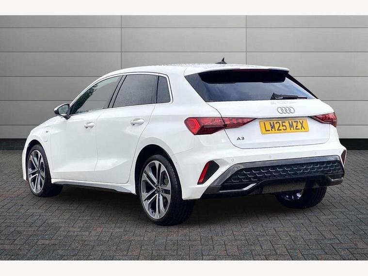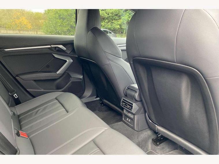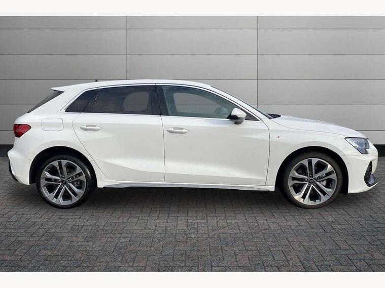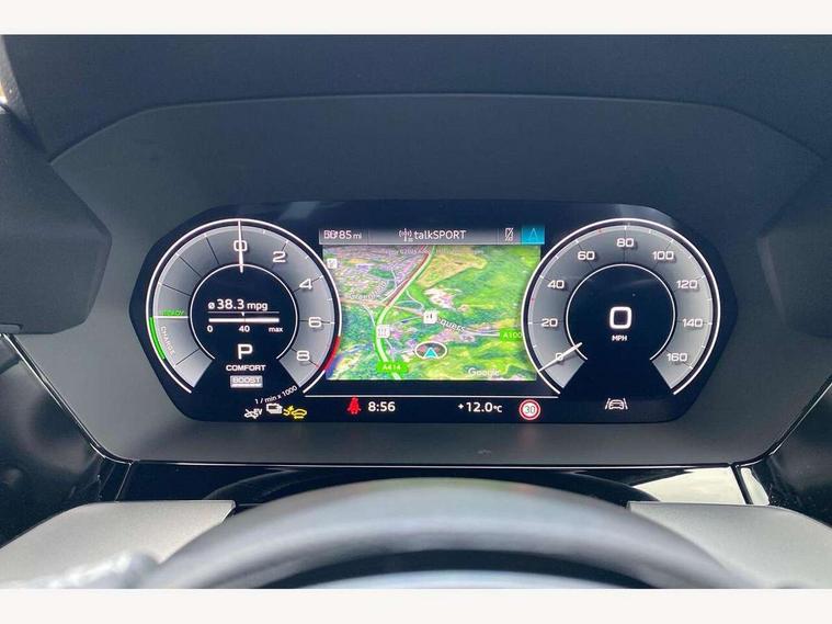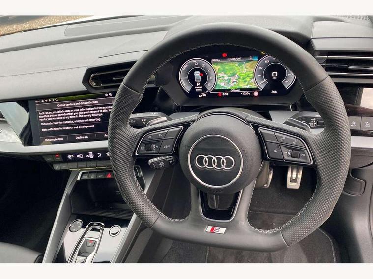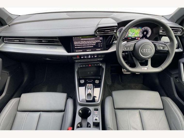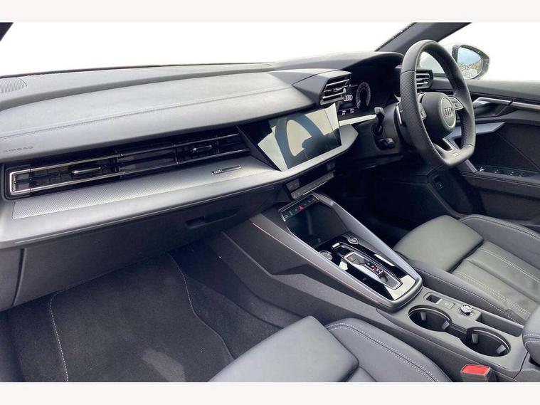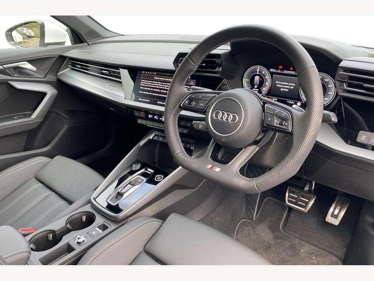 Adjustable speed limiter, Audi drive select, Audi smartphone interface with app store includes wireless Apple carplay, Android auto and Amazon alexa integration, Audi virtual cockpit plus - 12.3" full HD resolution dynamic digital instrument cluster, Automatic start/stop system with recuperation, Bluetooth interface, Camera based traffic sign recognition, Collision avoidance assistant, Cruise control, Distraction and Fatigue warning, e-Call (emergency call), Electromechanical power speed sensitive steering, Emergency assist, Lane departure warning system, MMI Navigation Plus with high resolution 10.1" colour touch screen display, Park Assist with parking system Plus, Service indicator, Trip computer, Voice control system with natural language interaction, 3 pin 10 amp domestic charging cable, CCS socket for DC charging, Charging cable for public charging, mode 3 (type 2), 32 A, Compact charging system, Industrial connector CEE 32 A, 230 V, length 1.6 m, Standard suspension, Type 2 socket for AC charging, Audi Phonebox light with wireless charging, Audi sound system - 10 loudspeakers including centre loudspeaker and subwoofer, DAB Digital radio, USB ports with charging function in the rear, Acoustic glass windscreen, All weather light, Aluminium window trim, Auto dimming frameless rear view mirror, Automatic dynamic range control, Body colour exterior mirrors, Chrome exhaust tailpipes, Dipped beam, main beam, position light and turning light, Electrically adjustable/heated/folding/auto dimming door mirrors with integrated LED indications + kerb view function for passenger side, Exterior model badging, Front and rear side air inlets in grained matt black with dark liquid chrome frame, Front electric windows, Front radiator grill in high gloss dark chrome, Heat insulating glass windscreen, Illuminated door sills with aluminium inserts at the front with S logo, Intersection light, LED 3rd brake light, LED brake lights, LED daytime running x3, LED headlights with LED rear lights and dynamic rear indicators, LED rear number plate lights, LED reverse light, LED tail lights, Light and rain sensors, Manoeuvring light, Motorway light, Privacy glass - dark tinted rear window, rear door and side windows, Rear diffuser and grill in grained matt black with inlay in dark liquid chrome, Rear electric windows, Rear side wing doors, Rear wiper, S line bumpers, S roof spoiler, Side S line emblems on front wings, Side sill trim in dark liquid chrome, Static Cornering lights, 12V socket and storage compartment in front centre console, 3 seat bench in 2nd row, 3 spoke flat bottomed leather multifunction sport steering wheel with gear shift paddles, 3-zone deluxe automatic air conditioning, 4 way electrically adjustable lumbar support for driver and front passenger, 40/20/40 split folding rear seat bench, Black cloth headlining, Black front and rear floor mats, Convenience auxiliary air conditioning, Front and rear centre armrest in artificial leather with contrasting stitching on armrests and instrument panel, Front and rear headrests, Heated front seats, Height and reach adjustable steering wheel, Manual boot compartment lid, Manually adjustable front seats, Rear centre armrest with cupholder, S badging on the steering wheel, Seat side bolsters, Single front passenger seat, Stainless steel pedals and front footrest in black, Twin leather upholstery with front sports seats S embossed logo, Aluminium interior elements pack - A3, Multi-coloured LED interior lighting package with Multi-coloured contour lighting of instrument panel - A3, 3x3 point rear seat belts, Acoustic vehicle alerting system, Driver and front passenger airbag with passenger airbag deactivation, Electronic Stabilisation Control (ESC) including ABS, ASR and EDL, First aid kit with warning triangle and 2 safety vests, Front side airbags with head airbags and interaction airbag, Hill hold assist, Pre-sense front with pedestrian and cyclist detection, Seatbelt monitoring, Tyre pressure loss indicator, Anti theft alarm, Anti-theft wheel bolts, Electronically operated child locks, Immobiliser, Remote central locking with safelock, Black dashboard, Inlay in dark aluminium spectrum, Tyre repair kit,