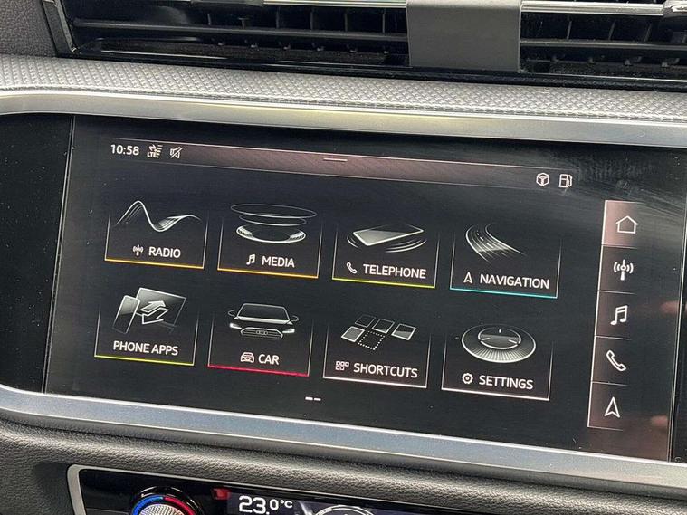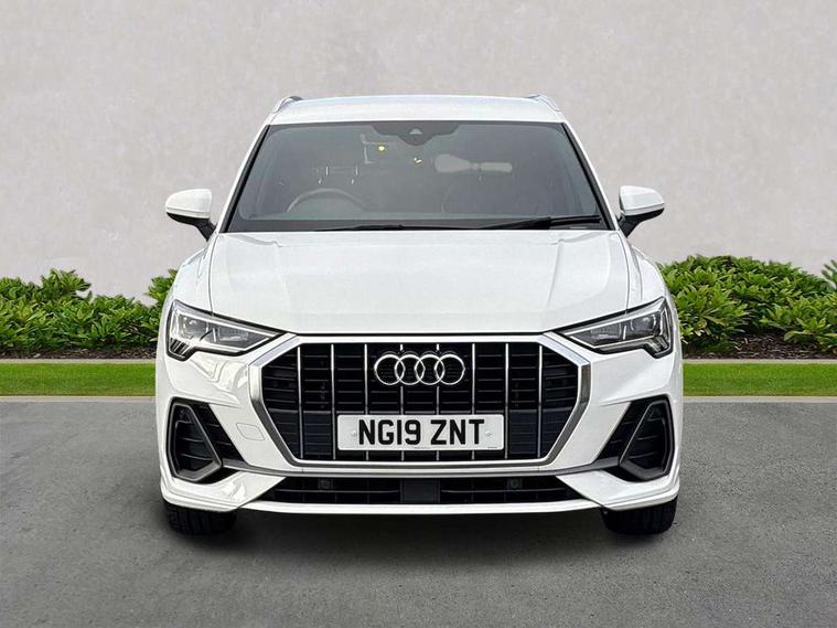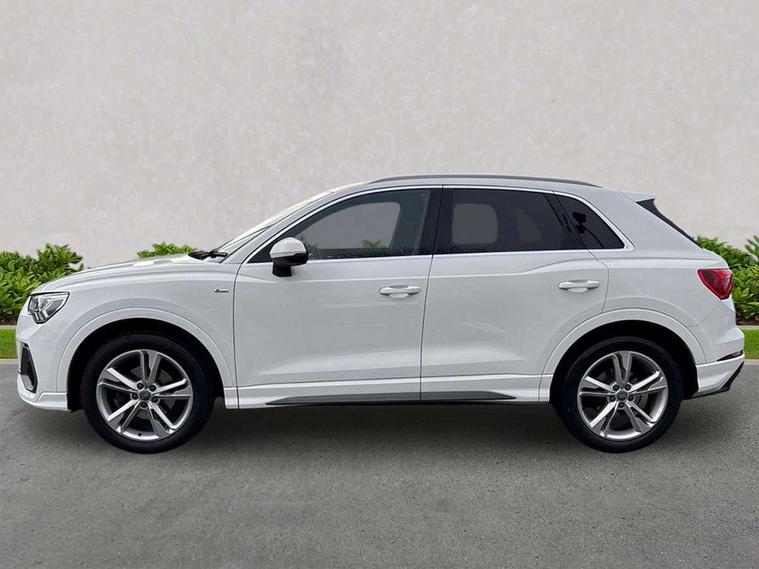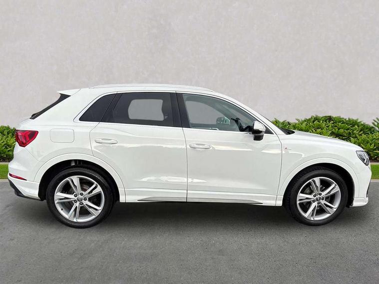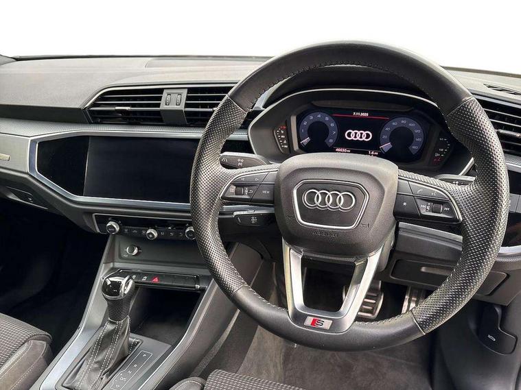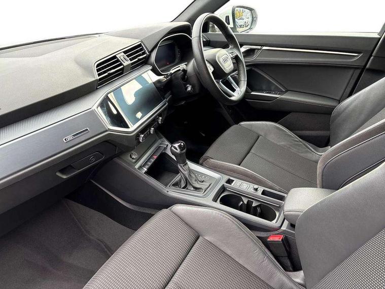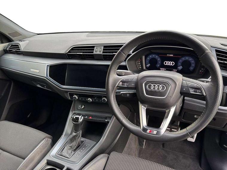 Dark matt brushed aluminium inlay, MMI touch colour display in gloss black with aluminium surround, Non smoking pack - Q3, Tyre repair kit, Anti theft alarm, Anti theft wheel bolts, Audi pre-sense front with pedestrain and cyclist recognition, Remote central locking, 1 x USB type C and 1 USB type A charging points, 6 speakers, DAB digital radio module, 3x3 point rear seatbelts, 6 airbags - Driver, front passenger, curtain and side windows, Electrically operated child locks on rear doors, Electromechanical parking brake, Electronic stabilisation control including ABS, ASR and EDL, Hill hold assist, Pre sense basic, Seatbelt monitoring, Tyre pressure warning, Warning triangle and first aid kit, Acoustic windscreen, Aluminium roof rails, Aluminium window trim, Auto dimming rear view mirror, Body coloured bumpers, Diffuser in matt Platinum grey, Electrically adjustable and heated door mirrors with integrated LED side indicators, Front and rear electric windows, Front fog lights, Front side air inlets in matt platinum grey, Front spoiler blade in matt platinum grey, Grille vertical bars in aluminium silver/Matt, High gloss black finish B and C pillars, LED headlights with LED daytime running lights and dynamic rear indicator, LED rear lights, Privacy glass, Rain and light sensors, Rear diffuser strip in matt titanium black, S Line badge on wings, S Line front and rear bumpers, Side skirt insert in matt Platinium grey, Titanium black radiator grille, 12V socket in rear centre console, 40:20:40 split folding rear seat, Adjustable rear seat bench/backrest with centre armrest and cupholder, Aluminium door sill trims, Black cloth headlining, Dual zone climate control, Front and rear black floor mats with contrast stitching in rock grey, Front and rear headrests, Front centre armrest with storage compartment and angle adjustment, Illuminated door sill trims with S logo, ISOFIX child seat mounting and Top Tether with front passenger airbag deactivation, Manual front seats with height adjustment, Perforated leather gearknob, Stainless steel luggage compartment sill finisher, Stainless steel pedals, Tool kit, Audi connect safety and service (e-call), Audi drive select, Audi lane departure warning, Audi side assist, Audi smartphone interface, Bluetooth interface, Camera based traffic sign recognition, MMI navigation plus with MMI touch, Power opening/closing tailgate, Progressive steering, Rear parking sensors, Service interval indicator, Stop/start system, Voice control system, Sports suspension,