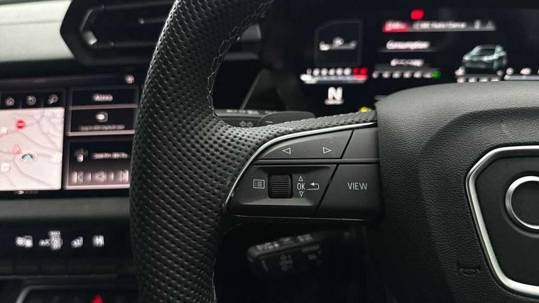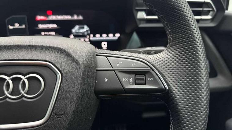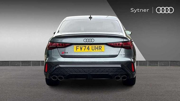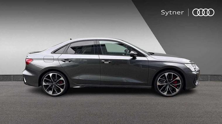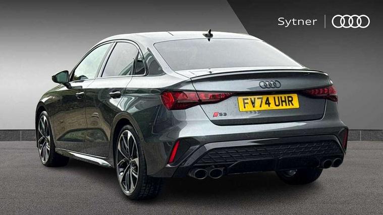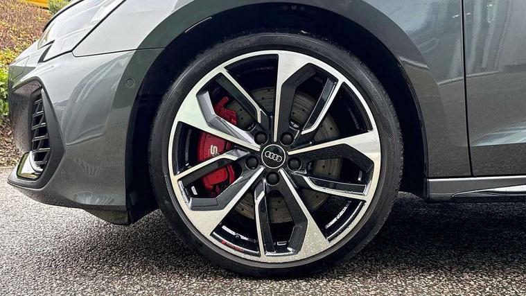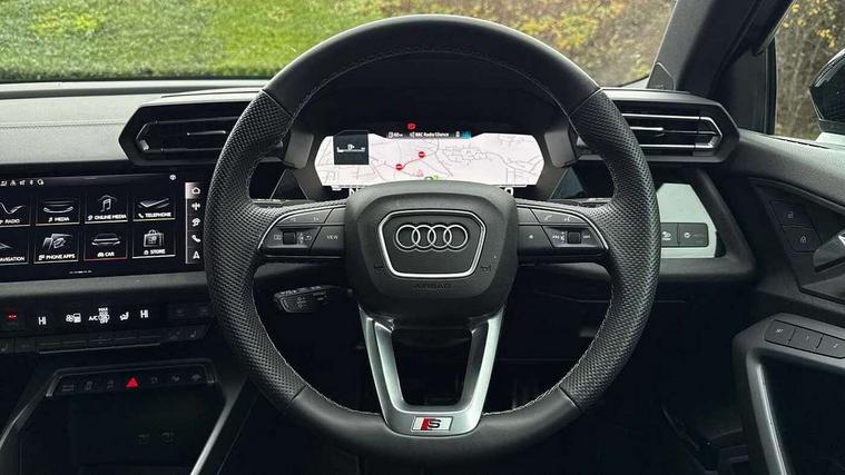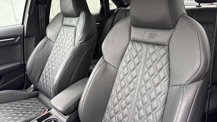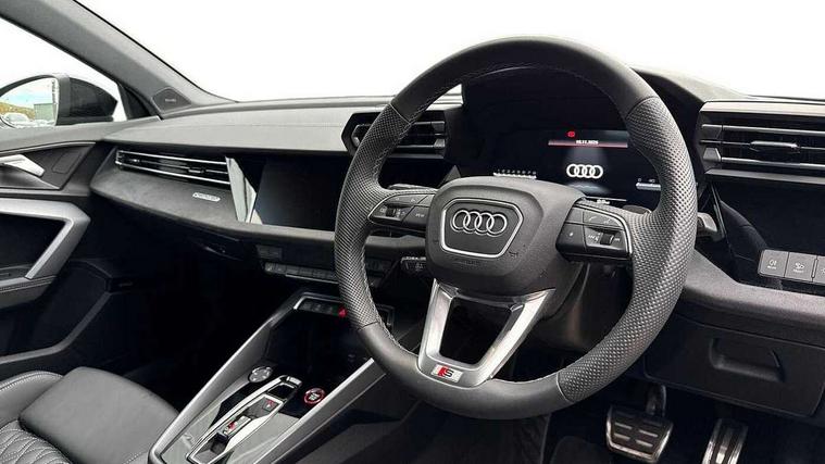 Adjustable speed limiter, Audi drive select, Audi smartphone interface with app store includes wireless Apple carplay, Android auto and Amazon alexa integration, Audi virtual cockpit plus - 12.3" full HD resolution dynamic digital instrument cluster, Automatic start/stop system with recuperation, Bluetooth interface, Camera based traffic sign recognition, Collision avoidance assistant, Distraction and Fatigue warning, e-Call (emergency call), Electromechanical power speed sensitive steering, Lane departure warning system, MMI Navigation Plus with high resolution 10.1" colour touch screen display, Park Assist with parking system Plus, Progressive steering, Service indicator, Trip computer, Voice control system with natural language interaction, S sport suspension with spring damper adjustment and lowering by 15mm, Audi Phonebox light with wireless charging, DAB Digital radio, USB ports with charging function in the rear, Anthracite grey Audi rings (front and rear), Audi Beam uses LEDs to project the rhombus S logo onto the ground as you exit your S3, Auto dimming frameless rear view mirror, Black accents front and rear bumpers including air inlets, Black accents in front grille and frame, Black accents window trims strips, Electrically adjustable/heated/folding/auto dimming door mirrors with integrated LED indications + kerb view function for passenger side, Exterior model badging, Front electric windows, Headlight washers, Heat insulating glass windscreen, Illuminated door sills with aluminium inserts at the front with S logo, LED 3rd brake light, LED daytime running lights, LED headlights with LED rear lights and dynamic rear indicators, Light and rain sensors, Privacy glass - dark tinted rear window, rear door and side windows, Rear boot, Rear electric windows, Rear side wing doors, S grille, S3 front bumper with S specific air intake grilles, 12V socket and storage compartment in front centre console, 3 seat bench in 2nd row, 3 spoke flat bottomed leather multifunction sport steering wheel with gear shift paddles, 3-zone deluxe automatic air conditioning, 4 way electrically adjustable lumbar support for driver and front passenger, 40/20/40 split folding rear seat bench, Black cloth headlining, Fine Nappa leather upholstery with front sports seats S embossed logo, Front and rear centre armrest in artificial leather, Front and rear headrests, Front/rear floor mats, Heated front seats, Manual boot compartment lid, Manually adjustable front seats, Rear cup holders, S badging on the steering wheel, Seat side bolsters, Single front passenger seat, Stainless steel pedals and front footrest in black, Aluminium interior elements pack - A3, Extended ambient lighting package Pro - S3 Black edition, Storage package - A3 Saloon, Technology package - A3, 3x3 point rear seat belts, Driver and front passenger airbag with passenger airbag deactivation, Electronic Stabilisation Control (ESC) including ABS, ASR and EDL, First aid kit with warning triangle and 2 safety vests, Front side airbags with head airbags and interaction airbag, Hill hold assist, Pre-sense front with pedestrian and cyclist detection, Seatbelt monitoring, Tyre pressure loss indicator, Anti theft alarm, Anti-theft wheel bolts, Electronically operated child locks, Immobiliser, Remote central locking with safelock, Inlays in black dynamica microfibre, Tyre repair kit,