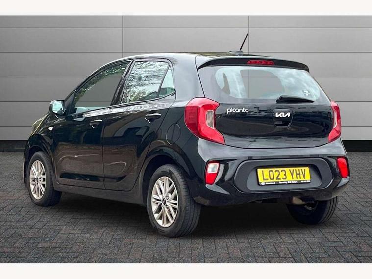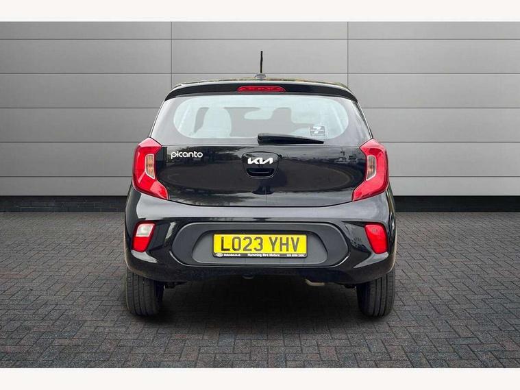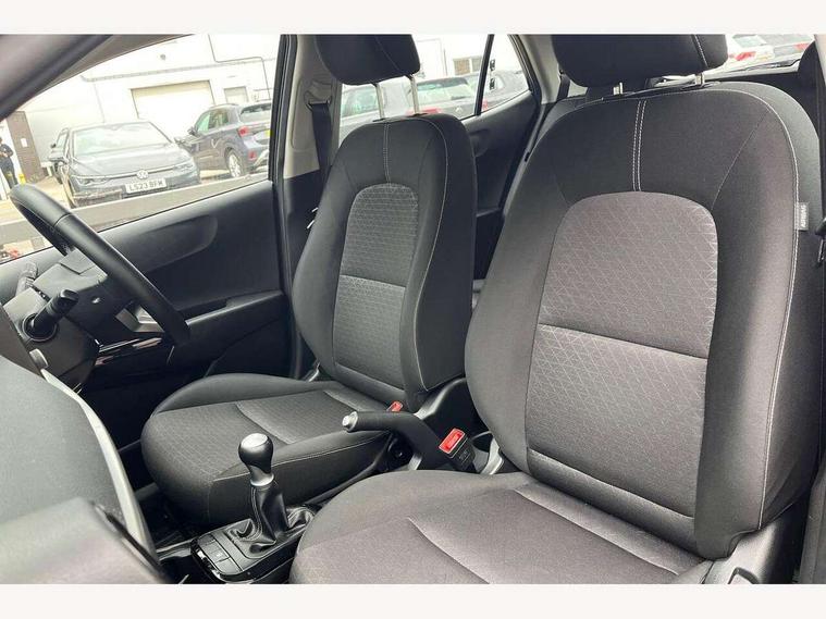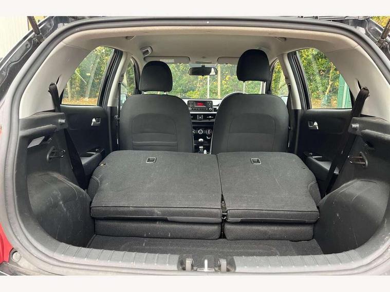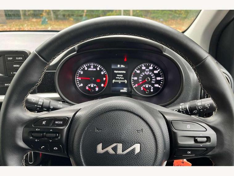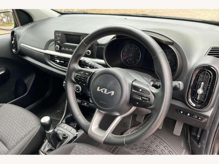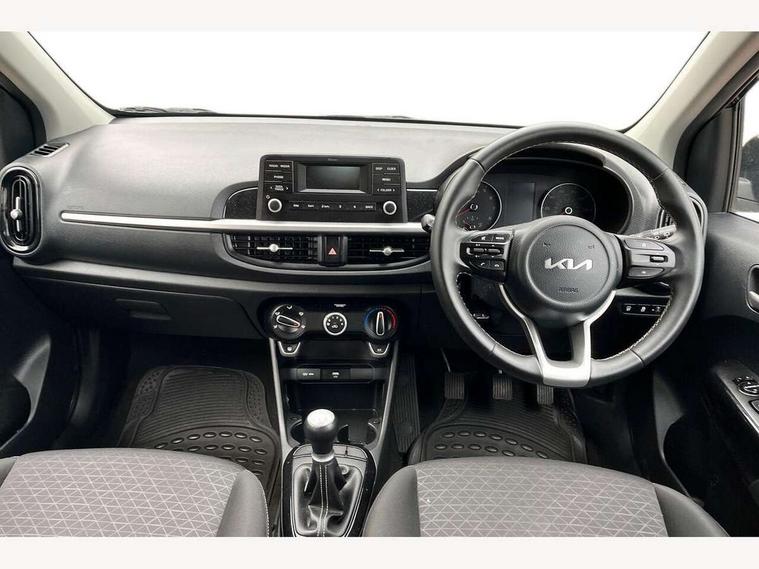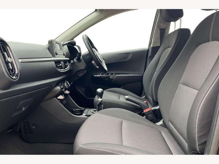 3.8" monochrome audio display with RDS and DAB, 4.2" supervision monochrome cluster display, Emergency call service, Emergency stop signalling system, External temperature gauge, Forward Collision-Avoidance Assist (FCA) - City, Motor driven power steering, Tachometer, Tailgate, Trip computer, 4 speaker audio system, Bluetooth with music streaming, Steering wheel mounted controls, USB ports for connection of a media device, Automatic headlight control system, Black radiator grille with chrome surround, Body colour bumpers, Body colour mirrors and door handles, Day/night rear view mirror, Daytime running lights, Electric adjustable heated door mirrors, Front and rear electric windows with drivers's auto up/down function, Headlamp levelling, Heated rear window, High mount brake light, MFR - Multi Focus Reflector halogen headlights with black bezel, Rain sensor, Rear fog lights, Rear side wing doors, Rear wash/wipe, Speed variable front wipers, Tinted glass, Visible VIN plate, Welcome and follow-me home light functionality, 1 x rear coat hook, 12V power point front, 2 seat bench in 2nd row, 3 x passenger assist grips, 60/40 split/folding 2nd row of seats, All round height adjustable headrests, Cupholders in centre console, Driver and front passenger sunvisor with vanity mirror, Driver seat height adjust, Front cabin lights, Glovebox, High gloss lower centre fascia trim, door armrest and air vents, ISOFIX Child seat top tethers and anchor fixings, Leather trimmed steering wheel and gearshift, Luggage area light, Luggage area parcel shelf, Manual air conditioning, Passenger front seatback pockets, Premium cloth upholstery, Silver paint finished interior door handles, Single front passenger seat, Slide/reclining front seats, Tilt adjustable steering wheel, Advanced Driver Assistance Pack - Picanto, 2 x 3-point rear seatbelts, ABS/EBD, Automatic unlocking of doors in case of impact, ESC + BAS + VSM + HAC, Front passenger airbag cut-off switch, Front seatbelt height adjusters, Front seatbelt pretensioners, Hill hold control, Hill start assist control (HAC), Knee airbags, Rear child proof door locks, Seatbelt warning, Side impact protection, Torque vectoring brake based and straight line stability (SLS), Traction control, Twin curtain airbags, Twin front airbags, Twin front side airbags, Tyre pressure monitoring system, Anti theft alarm, Engine immobiliser, Folding key, Locking wheel nuts, Remote central door locking, 14" alloy wheels, Tyre mobility kit,