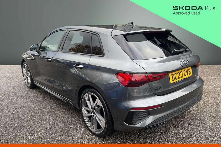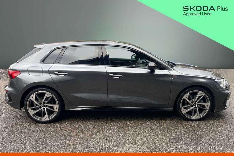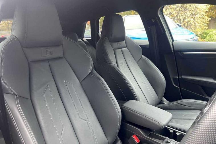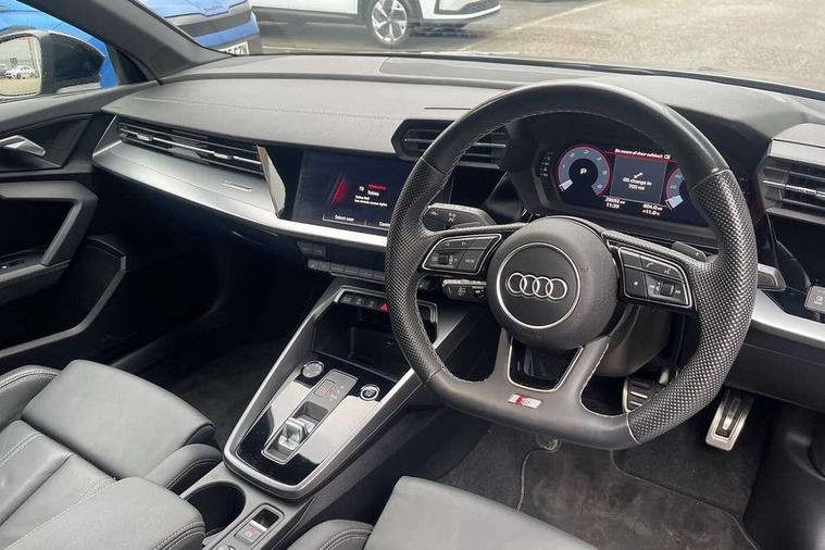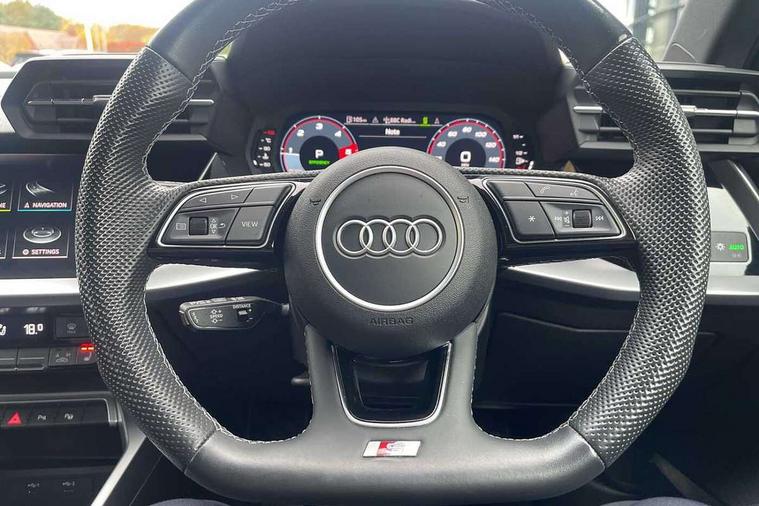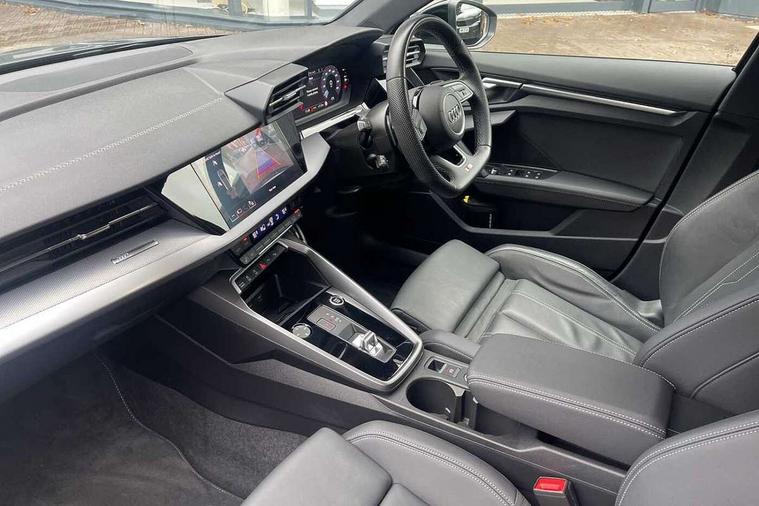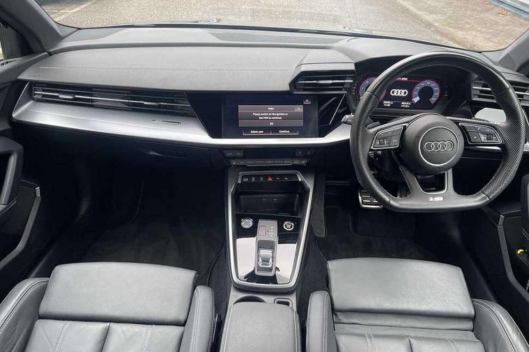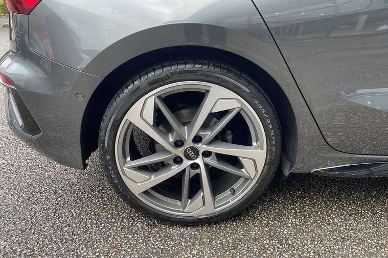 Audi drive select (Auto, Comfort, Dynamic, Efficiency and Individual), Audi smartphone interface, Audi Virtual Cockpit - 10.25" digital and colour instrument cluster, Automatic start/stop system with recuperation, Bluetooth interface, Camera based traffic sign recognition, Collision avoidance assistant, e-Call (emergency call), Electromechanical power speed sensitive steering, Lane departure warning system, MMI Navigation Plus with high resolution 10.1" colour touch screen display, Service indicator, Trip computer, Voice control system with natural language interaction, Sports suspension, 2xUSB-C connection with data and charging functions, 6 passive loudspeakers, DAB Digital radio, 3rd brake light, Acoustic glass windscreen, Audi beam uses LEDs to project the Audi logo onto the ground as you exit your A3, Auto dimming frameless rear view mirror, Electrically adjustable/heated/folding/auto dimming door mirrors with integrated LED indications + kerb view function for passenger side, Front electric windows, Illuminated door sills with aluminium inserts at the front with S logo, LED daytime running lights, LED headlights with LED rear lights and dynamic rear indicators, Light and rain sensors, Privacy glass - dark tinted rear window, rear door and side windows, Rear electric windows, Rear side air outlets in grained matt black, Rear side wing doors, Rear wiper, S roof spoiler, 12V socket and storage compartment in front centre console, 3 seat bench in 2nd row, 4 way electrically adjustable lumbar support for driver and front passenger, 60/40 split folding rear seat bench, Black cloth headlining, Dual zone electronic climate control, Front and rear centre armrest in artificial leather, Front and rear headrests, Front/rear floor mats, Height and reach adjustable steering wheel, Interior lighting - glove compartment light and right hand side, Luggage compartment floor covering, Manual boot compartment lid, Seat side bolsters, Single front passenger seat, Stainless steel pedals and front footrest in black, Twin leather upholstery with front sports seats S embossed logo, Aluminium interior elements pack - A3 Sportback, Black styling pack - A3 Sportback/Black edition, LED interior lighting pack - A3 Sportback, 3x3 point rear seat belts, Driver and front passenger airbag with passenger airbag deactivation, Electronic Stabilisation Control (ESC) including ABS, ASR and EDL, First aid kit with warning triangle and 2 safety vests, Front side airbags with head airbags and interaction airbag, Pre-sense front with pedestrian and cyclist detection, Seatbelt monitoring, Tyre pressure loss indicator, Anti theft alarm, Anti-theft wheel bolts, Electronically operated child locks, Immobiliser, Remote control central locking, Dark spectrum aluminium inlays, accent surfaces in the dashboard and centre console in platinum grey silk effect paint finish, 19" 5 arm trapezoid design alloy wheels in matt grey with diamond cut finish,