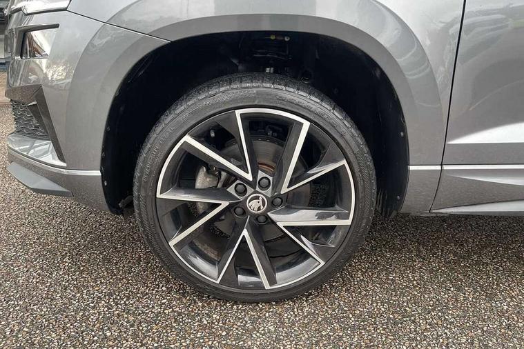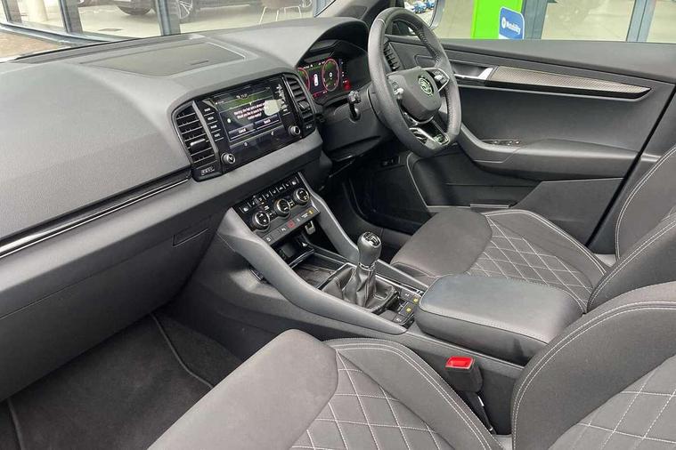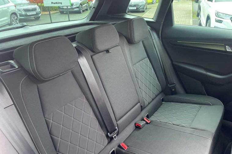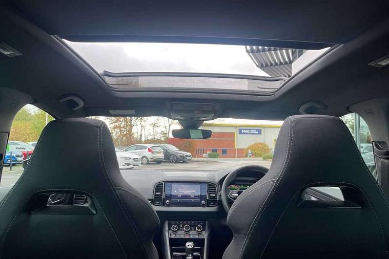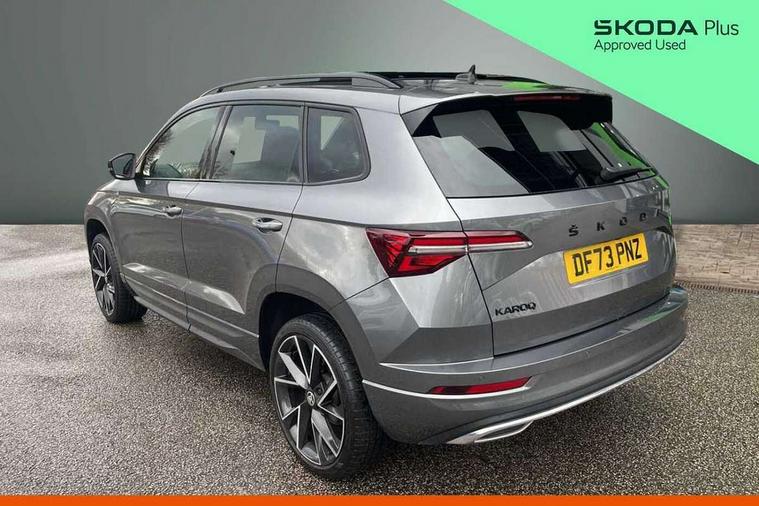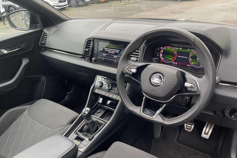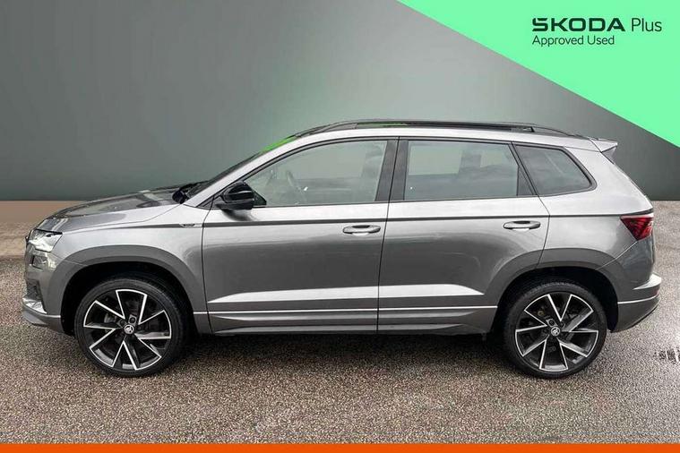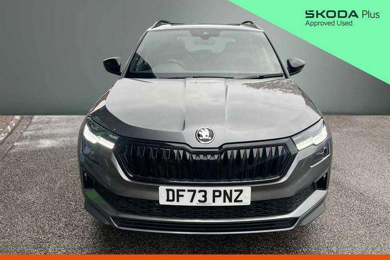 8" Digital display, Care connect, Driver fatigue sensor, Emergency services call system, Outside temperature gauge, Service interval indicator, SmartLink wireless for Apple and wired for Android, Start/stop system with regenerative braking, USB C Port x 2 in front centre console, Virtual cockpit, Virtual pedal with electrically operated boot door, 8 Speakers, DAB radio with Bluetooth, USB connection, Wireless charging without wireless aerial connection, Acoustic glass, Aero front windscreen wipers with intermittent function, Auto dimming rear view mirror with light and rain sensors, Black door mirrors, Black electric window control buttons, Black radiator grille, Black roof rails, Body colour door handles, Electric front and rear windows with child proof lock, Front door steps with SportLine logo, Heated rear windscreen, LED daytime running lights, LED rear lights with high functionality welcome effect and dynamic indicators, Light assistant (coming/leaving home/tunnel light), Panoramic sliding sunroof, Plastic scuff plates, Privacy glass, Protective door side sills in body colour, Rear diffuser, Rear side wing doors, Rear spoiler, Rear window wiper with washer system and intermittent control, Safety reflectors on front doors, Skoda lettering on tailgate in black, Sportline badge on front fender, Sportline decorative inserts with badging, Sports front and rear bumpers, 1.5 litre bottle holders in driver and front passenger door panels, 12V socket in boot, 12v socket in front centre armrest with storage compartment and rear air vents, 3 rear height adjustable headrests, 3 seat bench in 2nd row, 3 spoke leather sports multifunction steering wheel and silver stitching, 4 foldable roof handles with rear coat hooks, Black floor carpet, Black roof headlining, Chrome inner door handles, Double sided boot floor, Foldable hooks in the boot, Front head restraints, Height adjustable front three point seats belts with tensioners, Height/reach adjust steering wheel, Ice scraper, Illuminated glovebox, Illuminated luggage compartment, Isofix child seat preparation outer rear, Manual lumbar support for front seats, Pen holder, Pollen filter, Rear boot cover, Rear reading lights, Rear seats fixed folding and divided 60:40, Rubbish bin door, Safety vest holder, Single front passenger seat, Storage box in upper central dashboard closed, Sunvisors with illuminated vanity mirrors, Textile floor mats, Ticket holder, Titan black interior ceiling, Welcome animation with sportline logo, Boot pack - Karoq, Light Pack - Karoq, Parking pack - Karoq, Automatic door unlocking in case of crash, Automatic fuel cut off in case of crash, Child locks on rear doors, Driver airbag, Electronic parking brake with auto hold function, Emergency rear braking signal, ESC including ABS, MSR, ASR, EDS, HBA, DSR, RBS, MKB and traction control, Front side airbags, Hill hold control, Knee airbags, Passenger airbag with switch-off function, Pedestrian monitor, Seatbelt reminder signalisation and pretensioner for all seats, Three point seatbelts rear, Two tone horn, Tyre pressure display, Tyre pressure monitor, Alarm with interior monitoring, back up horn and tilt sensor with safe function, Electronic engine immobiliser, Keyless entry and start/stop, Remote central locking with 2 remote folding keys, Black air vent surround, Black centre console, Satin black dashboard, Satin black door trim, 19" Sagitarius anthracite alloy wheels with matt black aero inserts, Anti-theft wheel bolts protection, Matt black aero hub caps, Tool kit,