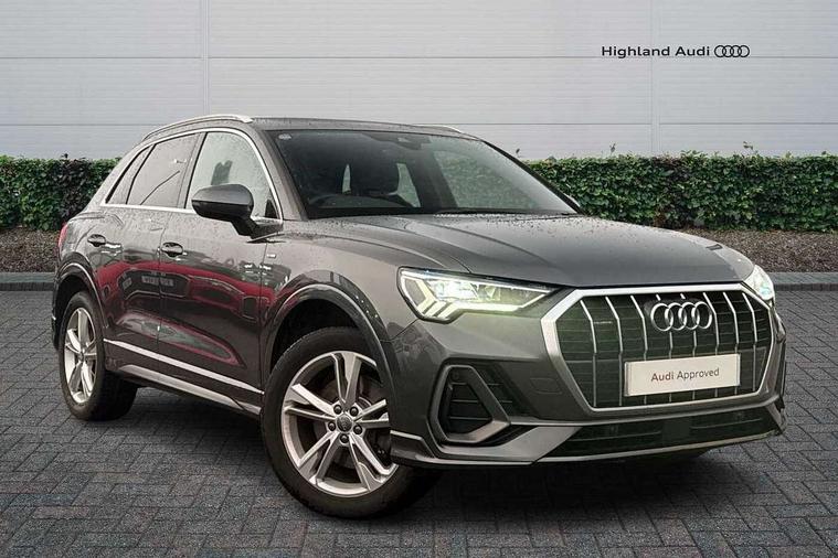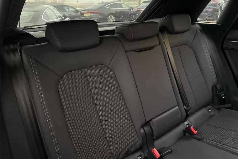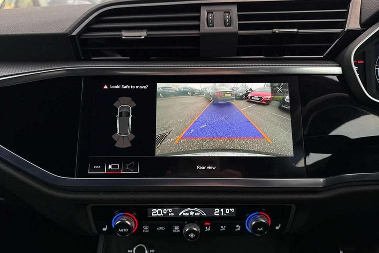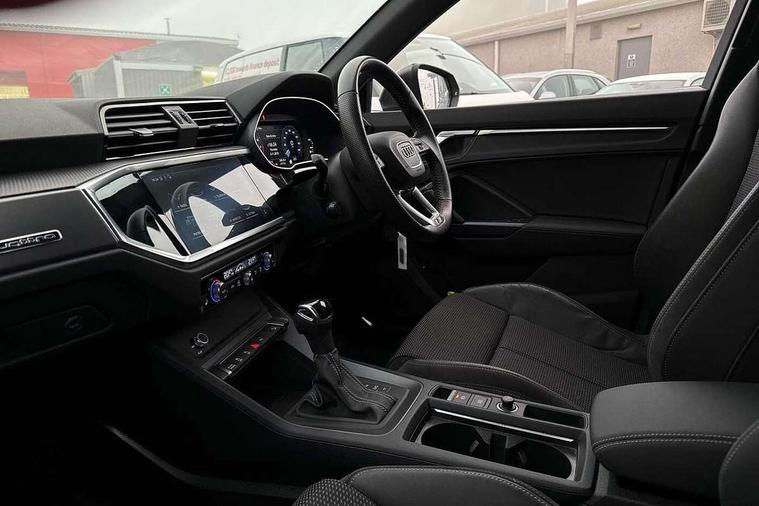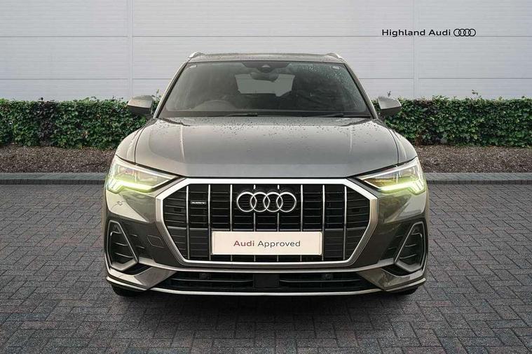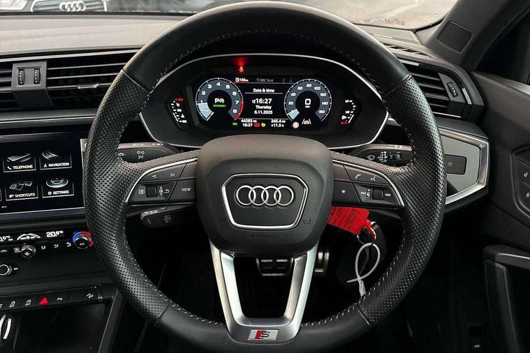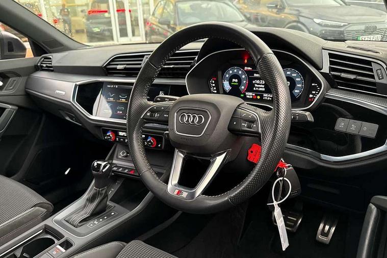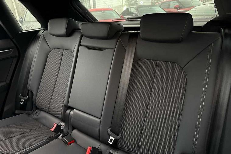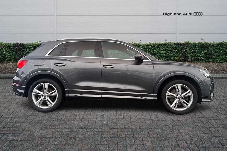 Audi connect safety and service (e-call), Audi drive select, Audi lane departure warning, Audi side assist, Audi Virtual Cockpit - 10.25" display, Bluetooth interface, Camera based traffic sign recognition, MMI Navigation Plus with high resolution 10.1 inch touchscreen colour display, Power operated tailgate, Progressive steering, Service interval indicator, Smartphone interface includes wireless Apple carplay/Android Auto, Start stop system with recuperation, Voice control system with natural language interaction, Sports suspension, 1 x USB type C and 1 USB type A charging points, 6 passive loudspeakers, DAB digital radio module, Acoustic windscreen, Aluminium roof rails, Aluminium window trim, Auto dimming frameless rear view mirror, Body coloured bumpers, Electrically folding, adjustable and heated door mirrors with integrated LED side indicators and kerb view function for passenger side, Front and rear electric windows, Front fog lights, Front side air inlets in matt platinum grey, Front spoiler blade in matt platinum grey, Grille vertical bars in aluminium silver/Matt, High gloss black finish B and C pillars, LED headlights with LED daytime running lights and dynamic rear indicator, LED rear lights, Privacy glass dark tinted rear and rear-side windows (from B-pillar backwards), Rain and light sensors, Rear diffuser strip in matt titanium black, S line badges on front wings, S Line front and rear bumpers, Side skirt insert in matt Platinium grey, Silver chrome grille surround, Titanium black radiator grille, 12V socket in rear centre console, 40:20:40 folding with manual adjustment for 60:40 forwards/backwards position and backrest angle, Adjustable rear seat bench/backrest with centre armrest and cupholder, Black cloth headlining, Dual zone electronic climate control, Front and rear black floor mats with contrast stitching in rock grey, Front and rear headrests, Front and rear roof module including reading lights, Front centre armrest, Glove compartment lighting, Height and reach adjustable steering wheel, Illuminated door sill trims with S logo, ISOFIX child seat mounting for front passenger with airbag deactivation and outer rear seat including top tether attachment point for outer rear seats, Luggage compartment light, Manual front seats with height adjustment, Perforated leather gearknob, Stainless steel luggage compartment sill finisher, Stainless steel pedals, Non smoking pack - Q3, 3x3 point rear seatbelts, 6 airbags - Driver, front passenger, curtain and side windows, Audi pre-sense front with pedestrain and cyclist recognition, Electrically operated child locks on rear doors, Electromechanical parking brake, Electronic stabilisation control including ABS, ASR and EDL, Hill descent control, Hill hold assist, Pre sense basic, Seatbelt monitoring, Tyre pressure warning, Warning triangle and first aid kit, Anti theft alarm, Anti theft wheel bolts, Remote central locking, Dark matt brushed aluminium inlay, Detail dashboard around MMI touch colour display in glass look, black with surround in aluminium look, Leatherette door armrest,
