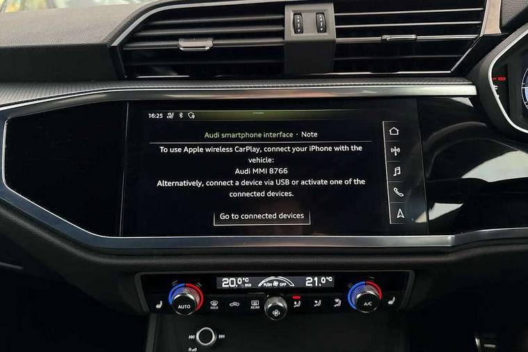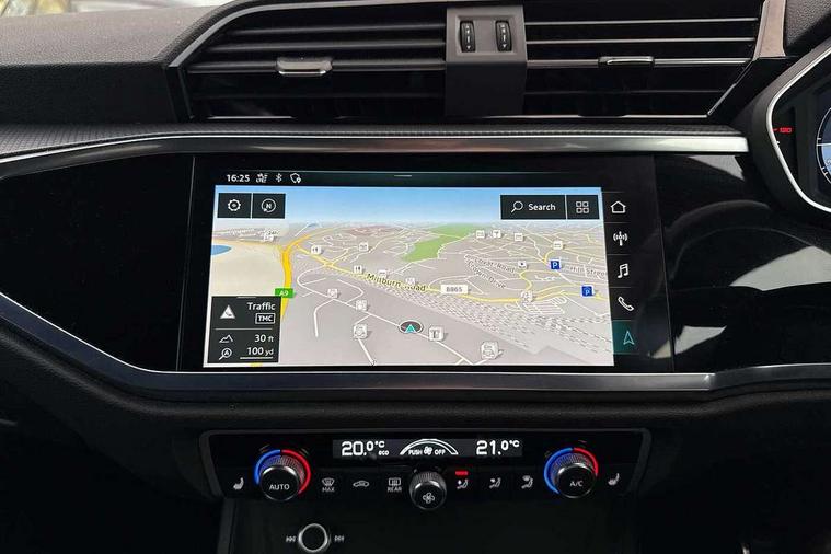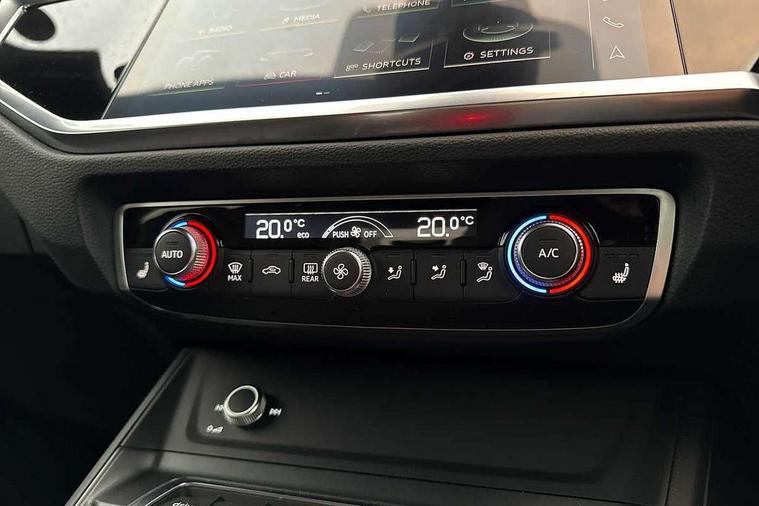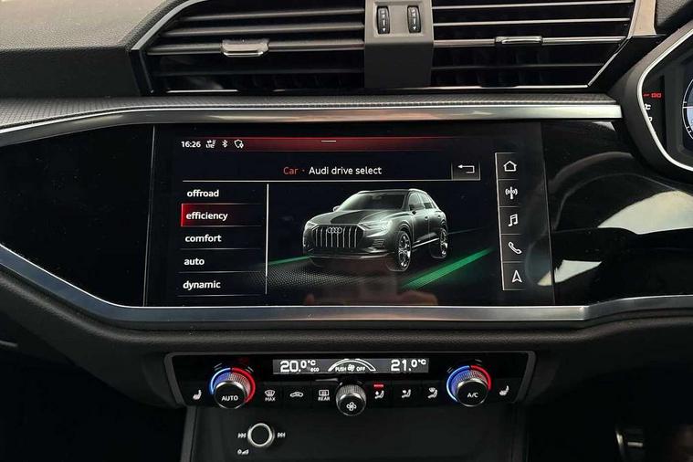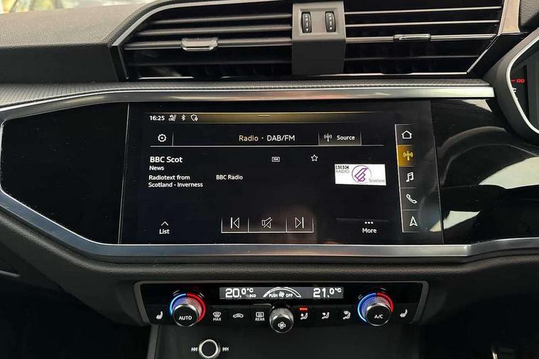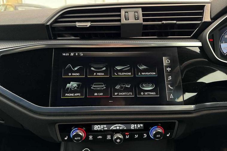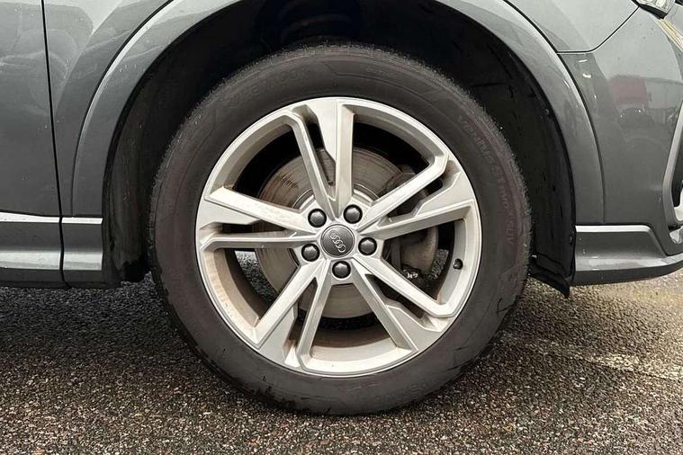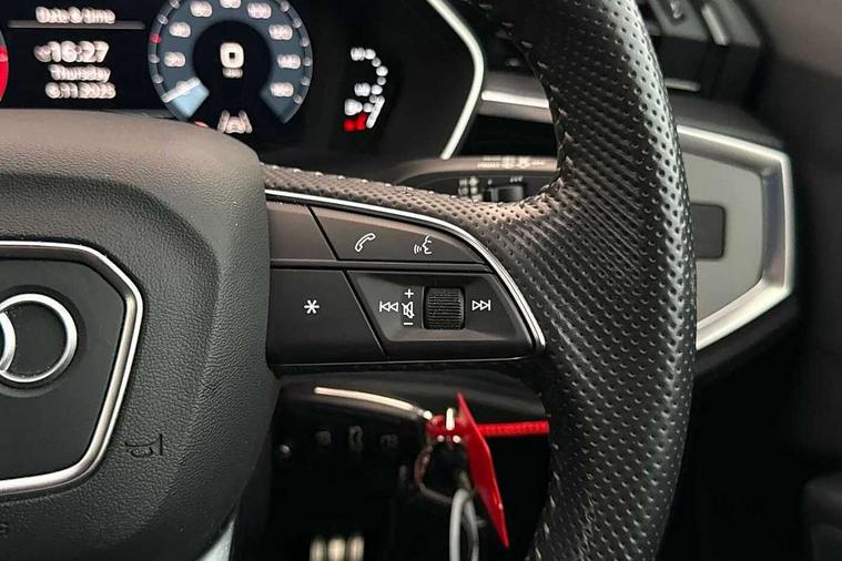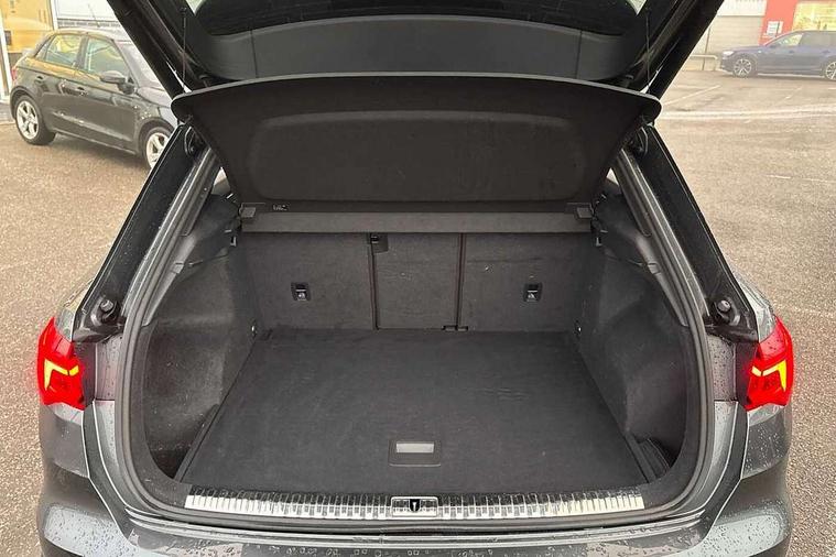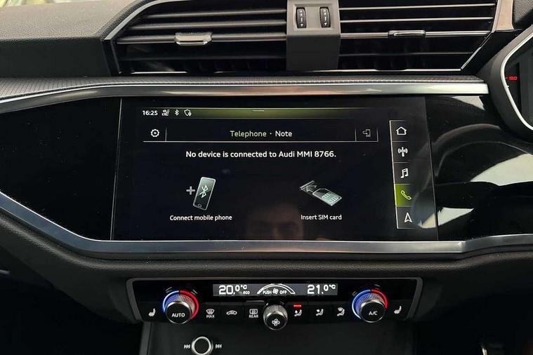 Audi connect safety and service (e-call), Audi drive select, Audi lane departure warning, Audi side assist, Audi Virtual Cockpit - 10.25" display, Bluetooth interface, Camera based traffic sign recognition, MMI Navigation Plus with high resolution 10.1 inch touchscreen colour display, Power operated tailgate, Progressive steering, Service interval indicator, Smartphone interface includes wireless Apple carplay/Android Auto, Start stop system with recuperation, Voice control system with natural language interaction, Sports suspension, 1 x USB type C and 1 USB type A charging points, 6 passive loudspeakers, DAB digital radio module, Acoustic windscreen, Aluminium roof rails, Aluminium window trim, Auto dimming frameless rear view mirror, Body coloured bumpers, Electrically folding, adjustable and heated door mirrors with integrated LED side indicators and kerb view function for passenger side, Front and rear electric windows, Front fog lights, Front side air inlets in matt platinum grey, Front spoiler blade in matt platinum grey, Grille vertical bars in aluminium silver/Matt, High gloss black finish B and C pillars, LED headlights with LED daytime running lights and dynamic rear indicator, LED rear lights, Privacy glass dark tinted rear and rear-side windows (from B-pillar backwards), Rain and light sensors, Rear diffuser strip in matt titanium black, S line badges on front wings, S Line front and rear bumpers, Side skirt insert in matt Platinium grey, Silver chrome grille surround, Titanium black radiator grille, 12V socket in rear centre console, 40:20:40 folding with manual adjustment for 60:40 forwards/backwards position and backrest angle, Adjustable rear seat bench/backrest with centre armrest and cupholder, Black cloth headlining, Dual zone electronic climate control, Front and rear black floor mats with contrast stitching in rock grey, Front and rear headrests, Front and rear roof module including reading lights, Front centre armrest, Glove compartment lighting, Height and reach adjustable steering wheel, Illuminated door sill trims with S logo, ISOFIX child seat mounting for front passenger with airbag deactivation and outer rear seat including top tether attachment point for outer rear seats, Luggage compartment light, Manual front seats with height adjustment, Perforated leather gearknob, Stainless steel luggage compartment sill finisher, Stainless steel pedals, Non smoking pack - Q3, 3x3 point rear seatbelts, 6 airbags - Driver, front passenger, curtain and side windows, Audi pre-sense front with pedestrain and cyclist recognition, Electrically operated child locks on rear doors, Electromechanical parking brake, Electronic stabilisation control including ABS, ASR and EDL, Hill descent control, Hill hold assist, Pre sense basic, Seatbelt monitoring, Tyre pressure warning, Warning triangle and first aid kit, Anti theft alarm, Anti theft wheel bolts, Remote central locking, Dark matt brushed aluminium inlay, Detail dashboard around MMI touch colour display in glass look, black with surround in aluminium look, Leatherette door armrest,