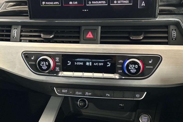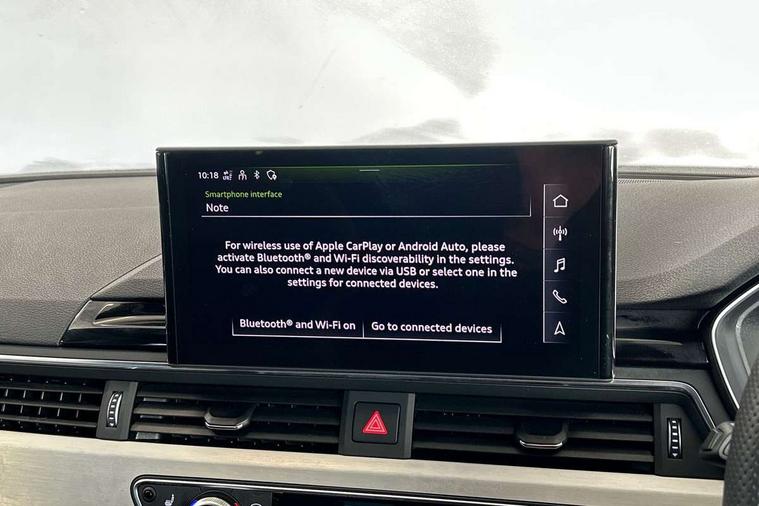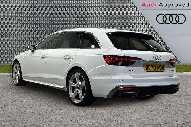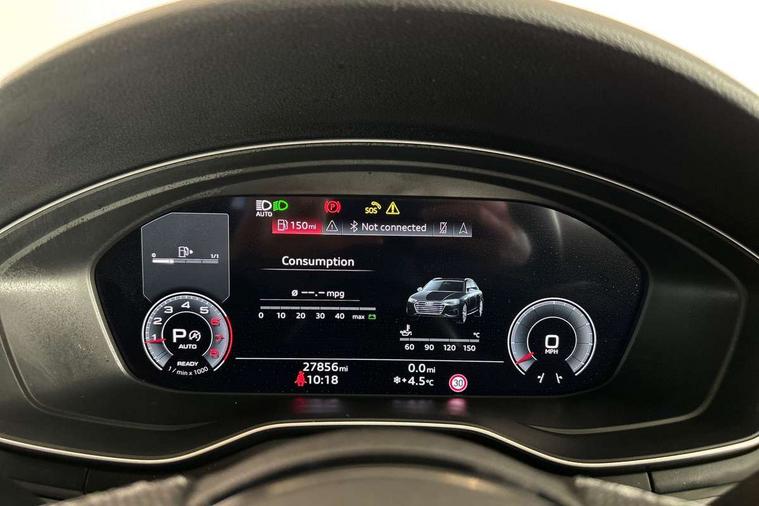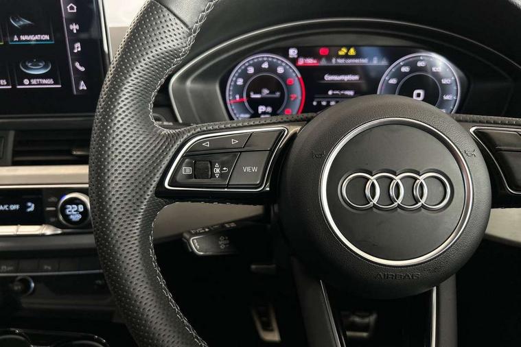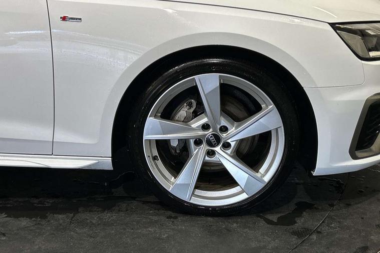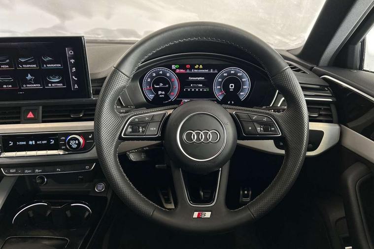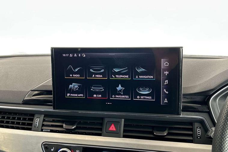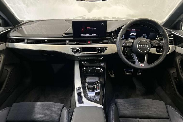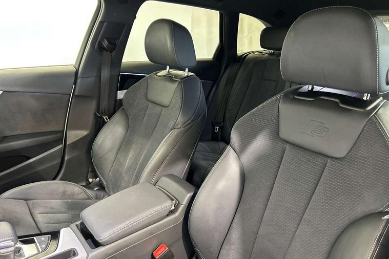 Audi connect safety and service (e-call), Audi drive select, Audi smartphone interface, Audi virtual cockpit, Automatic start-stop system with coasting functionality and efficiency programme, Bluetooth interface, Camera based traffic sign recognition, Electromechanical power steering, Email, calendar and text messages displayed via MMI, Front and rear parking sensors, Lane departure warning, MMI Navigation plus with MMI touch includes 10.1" high resolution colour MMI display, 3D map, Power operated tailgate, Rear view camera, Voice control system, 54 litre fuel tank, Sports suspension lowered by 23mm, 2 USB charging ports, 8 passive loudspeakers, DAB digital radio reception, Aluminium roof rails, Auto dimming rear view mirror, Body colour door handles, Body colour front spoiler lip, Body colour side sill trim, Body coloured door mirrors, Electric adjustable/heated/folding door mirrors with auto dimming, Grained matt black side air inlets with matt aluminium silver inlay, High beam assistant, Honeycomb structure radiator grille in grained matt black, LED headlights with LED rear lights + dynamic rear indicators + headlight adjustment and high beam, turning light + LED daytime running lights, LED third brake light, Matt aluminium silver tailpipe trim, Privacy glass, Rain and light sensors, Rear side wing doors, Rear wiper, S Line badges on the front wings, S line front and rear bumpers with side skirts, S Line rear diffuser in matt anthracite black with trim strip in matt aluminium silver, S Line roof edge spoiler, Variable intermittent front wash/wipe, Windscreen with acoustic glazing, 3 spoke high multi-function sports leather steering wheel grips in perforated leather with S badging including paddle shift, 4 way electric lumbar support for driver and front passenger, 40/20/40 split folding 3 rear seat bench in 3 parts with rear centre armrest, Black carpets, Black cloth headlining, Black perforated leather gearknob, Contrast stitching on seats, steering wheel and gear lever gaiter, Deluxe 3 zone electronic climate control, Electric load area cover, Front and rear head restraints, Front centre armrest, Heated front seats, Illuminated door sill trims with S logo, ISOFIX child seat mounting and top tether, Manual seat adjustment, Single front passenger seat, Stainless steel pedals and foot rest, High gloss package - A4, LED Interior light pack - A4/S4, 3 rear seatbelts, 6 airbags - Driver, front passenger, curtain and side windows, Attention and drowsiness assist, Electronic Stabilisation Control (ESC) including ABS, ASR and EDL, Hill hold assist, Multi collision brake assist, Pop-up bonnet for pedestrian protection, Pre sense city, Rear door child safety locks, Seatbelt monitoring, Warning triangle and first aid kit, Anti theft alarm, Anti theft wheel bolts, Central locking, Keyless Go, Matt brushed aluminium inlays, Tool kit, Tyre repair kit,