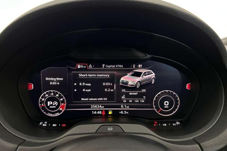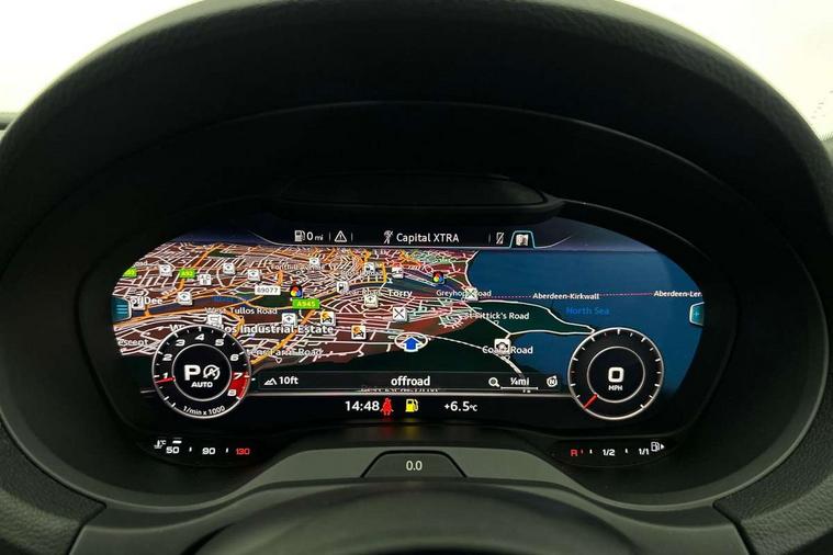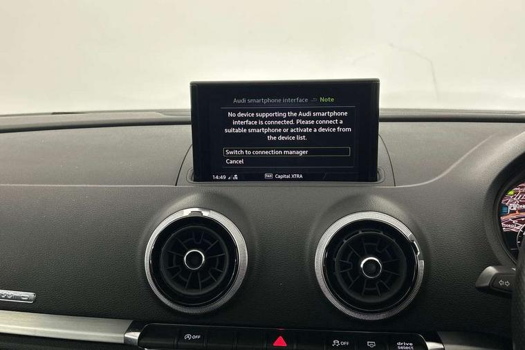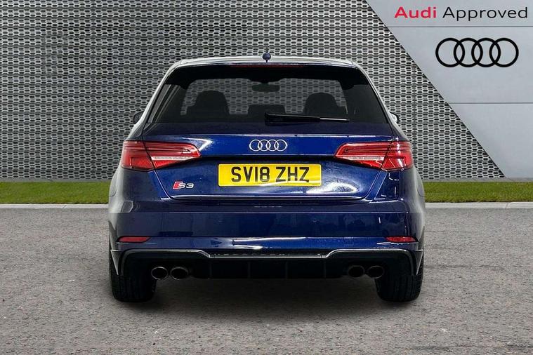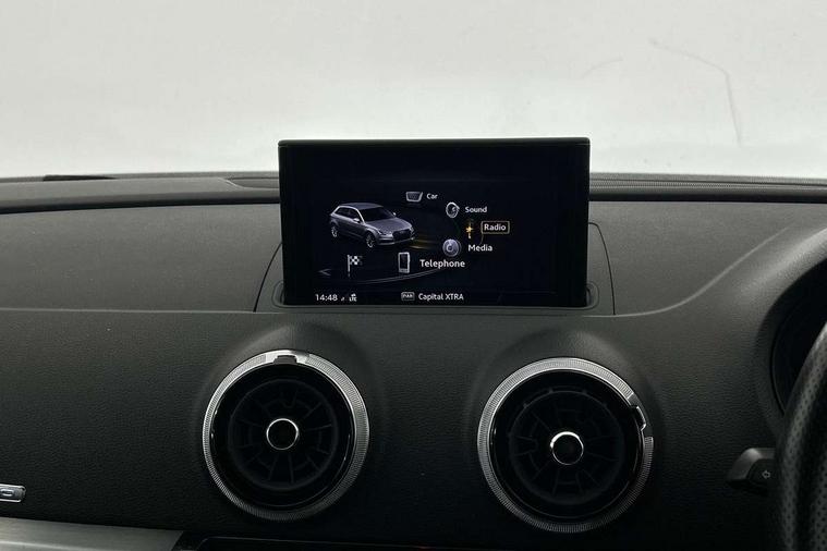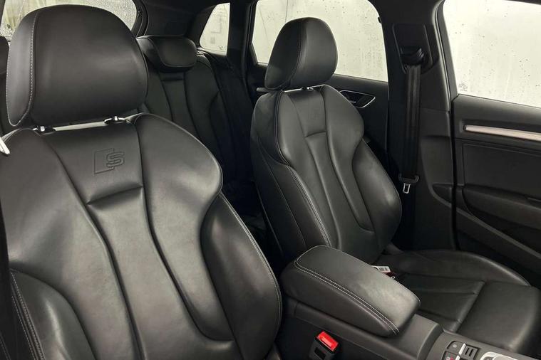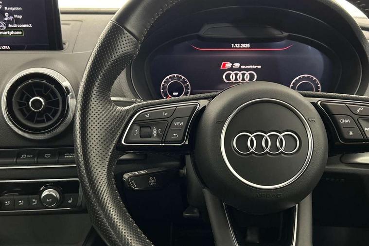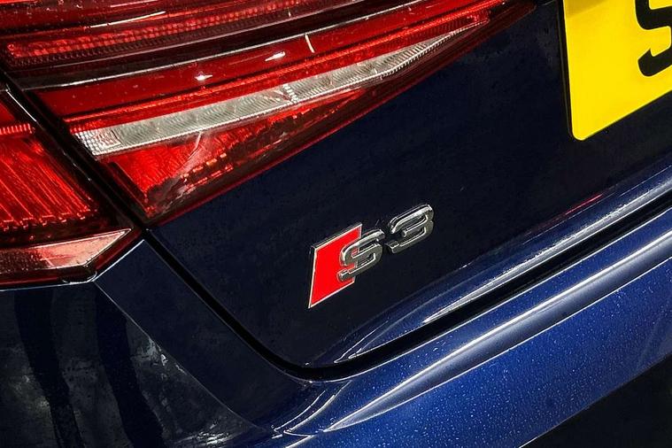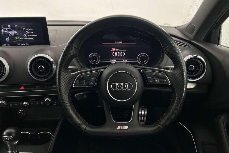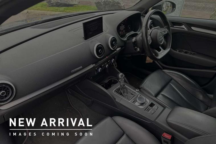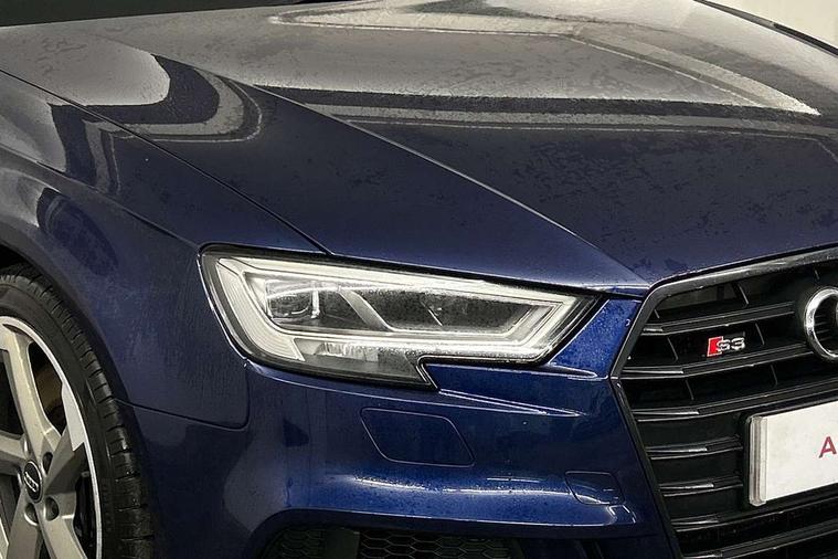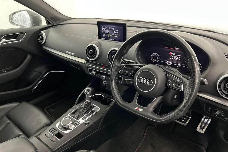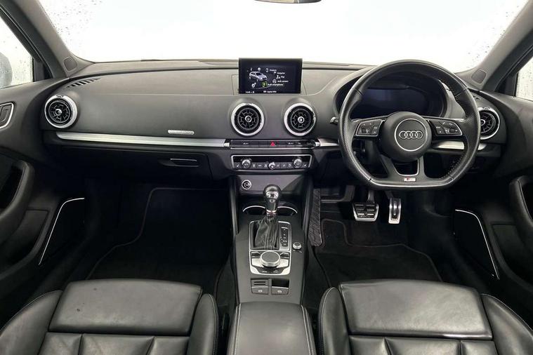 Audi connect, Audi drive select, Audi smartphone interface, Colour driver's information system display, HDD satellite navigation system radio single CD/DVD player MMI control system, Mobile telephone preparation - bluetooth interface, Progressive power assisted steering, Service interval indicator, Speed limit display, Voice control system, S sports suspension, 2 USB ports, Audi music interface, Auxiliary input socket, Bang + Olufsen advanced sound system, CD player, DAB Digital radio, MMI radio plus with 7" colour MMI screen and MMI controller, Auto dimming rear view mirror with light and rain sensors, Black door mirrors, Black window surrounds, Body colour bumpers with black insert, Body colour roof spoiler, Electric front windows, Electric operated/heated door mirrors, Electric rear windows, Headlight washers, Heated windscreen washer jets, LED daytime running lights, Matt black radiator grille, Platinum grey radiator grille with double chrome bars, Privacy glass, Rear wiper, S body styling, Twin oval chrome trimmed exhaust tailpipes, 3 adjustable rear headrests, 3 spoke flat bottomed multi-function leather steering wheel, 4 lashing points to secure luggage, Adjustable front armrest, Dual zone electronic climate control, Front and rear interior lights with delay, Front passenger seat isofix location point, Front/rear floor mats, Heated front seats, Height/depth adjustable steering column, Illuminated glovebox, ISOFIX child seat preparation+airbag deactivation, Jack and tool kit, Rock grey headlining, Stainless steel pedals, Steering wheel gearshift paddles, Storage compartment in centre console, Storage compartment under front seats, Storage compartments in doors, Black styling pack - A3/S3, LED interior light pack - A3/RS3, Non smoking pack - A3, Storage and luggage pack - A3/RS3, 3 point seatbelts on all seats, ABS/EBD, Active bonnet, Active front headrests, ASR, Curtain airbags, Driver and passenger side airbags, Driver/Front Passenger airbags, Drivers knee airbag, EDL, Electromechanical parking brake, ESC - Electronic Stability Control + traction control, Front passenger airbag deactivation, Hill hold assist, Manual rear child locks, Multi-Collision braking, Seatbelt warning, Tyre pressure warning, Warning triangle and first aid kit, Anti theft alarm, Anti-theft wheel bolts, Remote control central locking, Thatcham category 1 alarm + immobiliser, Aluminium air vent surrounds, Aluminium trim elements, Matt brushed aluminium inlays, Space saver spare wheel,
