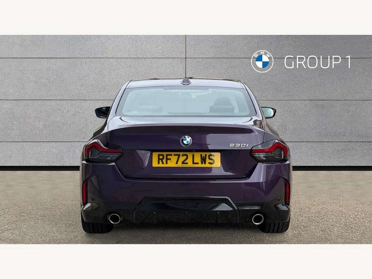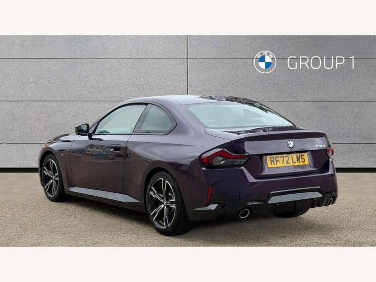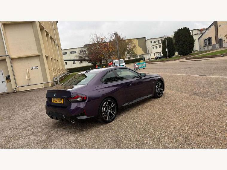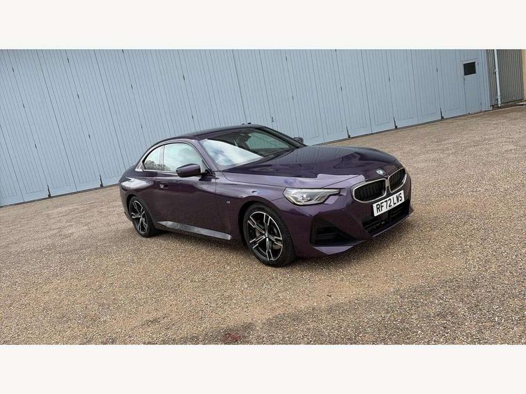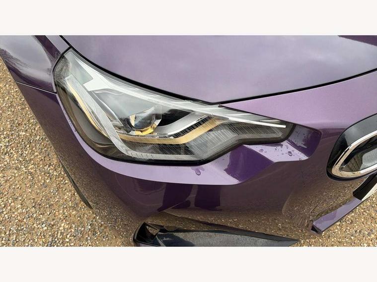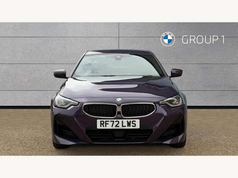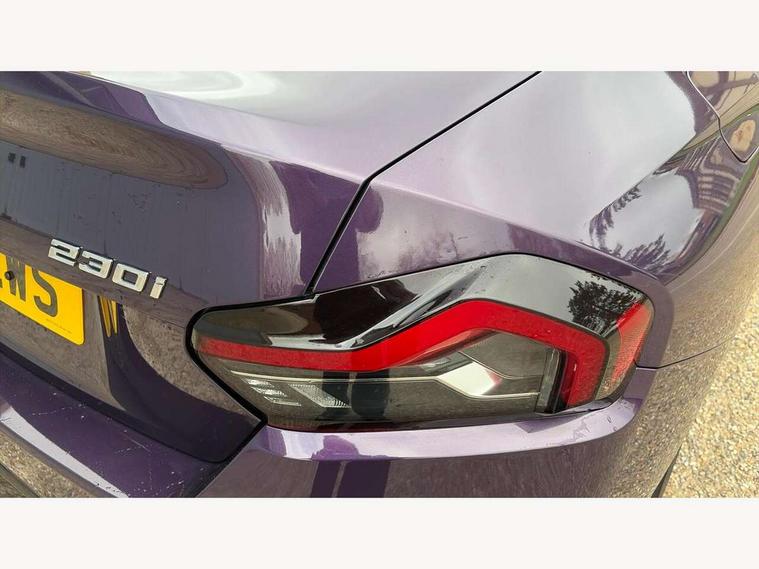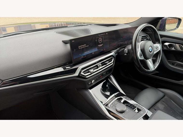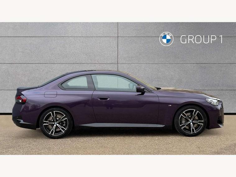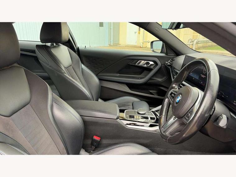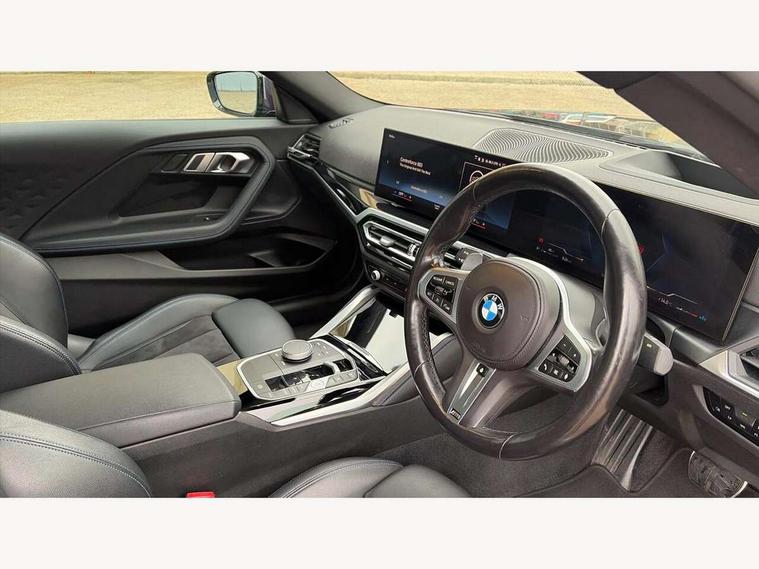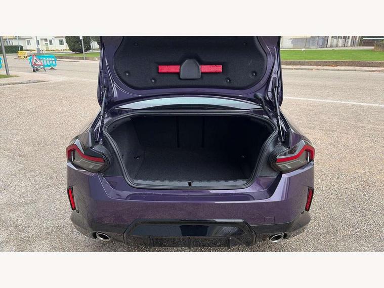 Attentiveness assist, Auto start-stop, Bluetooth, BMW ConnectedDrive online services, BMW Teleservices, Check Control warning system for monitoring of lights and door/luggage compartment open warning, Direct selection buttons, Drive off assistant, Eco pro mode, Electric power steering, Front and rear parking sensors, Front/rear Parking distance control, iDrive controller with turn and press function, Integrated owners handbook, Intelligent functions, Live cockpit plus with nav function 12.3" instrument cluster and 14.9" centre display, Oil sensor for level and grade, Optimum shift indicator, Personal Profile, Touch operation on control display, Variable sport steering, Widescreen multi-media display, Aluminium lightweight construction, Balancer shaft, BMW TwinPower Turbo four-cylinder petrol engine, Double VANOS, Drive performance control with ECO PRO comfort + sport mode, Electronic differential lock, High precision injection, M sport suspension, Petrol Particulate Filter, Sport automatic steptronic transmission with gearshift paddles, manual gearshift time display, launch control, coasting idle ECO PRO/COMFORT modes, Twin scroll turbocharger with Valvetronic, DAB tuner, Acoustic windscreen wipers for reduced driving noise, Adaptive LED Headlights, Automatic windscreen wipers and automatic headlight, Automatically dimming rear view mirror, Body colour door handles flush with door surface, Body colour door mirrors, Body colour front and rear bumpers, Daytime running lights, Electric windows - front and rear, with open/close fingertip control and trap release, Exhaust tailpipes x2 - 90mm in left and right, Fading support, Front and rear bumper system with replaceable deformation elements, Front door sill finishers in black plastic with BMW designation, Front windscreen wipers with integrated washer jets, Green tinted heat protection glazing, High beam assistant, High gloss shadowline exterior trim in mirror triangle cover, mirror cover panel, mirror bezel and window border, High level third brake light, Indicators integrated int mirror housing, LED registration plate light, LED technology rear tail lights, brake lights and turn indicators, Lightweight engineering, Model designation on right side of tailgate, One piece kidney grille with hight gloss chrome surround, Rear boot, Rear fog lights, Reversing light in rear light cluster, Shark fin antenna, Single part LED rear lights with smoked glass components, Trailer stabilisation logic, Visible VIN plate, 12V power socket in front centre console with blanking plug, 2 cupholders in front centre console, 3 zone automatic air conditioning, Ambient lighting, Compartment in front of cupholder, Conditioned based service, Driver seat backrest width adjustment, Front and rear side armrests integrated into door trim, Front armrest, Front door pockets, Front head restraints, Front sport seats, Heated front seats, Illuminated glove compartment with separate small compartment, M headliner Anthracite, M sport leather steering wheel, Manually adjustment steering wheel column, Rear seat backrest with manual 40:20:40 split folding, Rear seat centre foldable armrest with integrated cup holder, Single front passenger seat, Storage compartment between rear seats, Storage tray and compartment with cover in centre console, Sun visors with vanity mirrors and insert tab, Through loading system with 40/20/40 split folding 2 rear seat in 2nd row, Two folding rear seat headrests, Velour floor mats, Additional storage compartment pack without USB - 2 Series Coupe, Connected pack professional - 2 Series Coupe, Interior and exterior mirror pack - 2 Series Coupe, M Sport exterior styling aerodynamics pack - 2 Series Coupe, 2 tone horn, Anti lock braking system (ABS) with cornering brake control, Automatic Stability Control (ASC), BMW emergency call, Brake drying, Child seat ISOFIX attachment for the two outer rear seats, Crash sensor activating of airbags, Unlocking doors, hazard warning lights, interior light, safety battery terminal, Deactivation of fuel pump in the event of a crash, Driver and front passenger airbags, Driver and front passenger side airbags, integrated in the door side seat backrest bolsters for all seat variants, Dynamic brake control, Dynamic stability control + (DSC+), Dynamic Traction Control - DTC, Electrically operated hand brake including automatic hold function and automatic release when driving off, Front and rear disc brakes, Front passenger airbag deactivation, Head airbags for all 4 outer seats, Manual deactivation of front passenger airbag, Seat belt security check for driver and front passenger, Seatbelt warning, Side impact protection, Three point seat belts on 4 seats including front belt stopper, pyrotechnic belt tensioners and belt force limiters, Tyre pressure sensor, Warning triangle and first aid kit, Alarm system (Thatcham 1) with remote control and electronic engine immobiliser, Central locking switch for all doors, fuel filler cap and luggage compartment, Deadlocking function system to all doors, Drive away locking system on all doors and luggage compartment, Locking wheel bolts, Start/Stop button (illuminated) in centre console with keyless engine start and Auto Start-Stop deactivation button, Two remote control key with integrated key - one button for open and close doors/fuel flap/tailgate and separate button for unlock luggage compartment, BMW mobility tyre sealing system, Electrically powered 12V compressor, Reduced rolling resistance tyres,