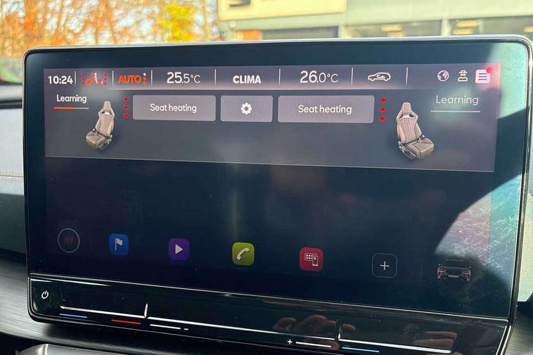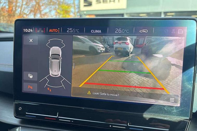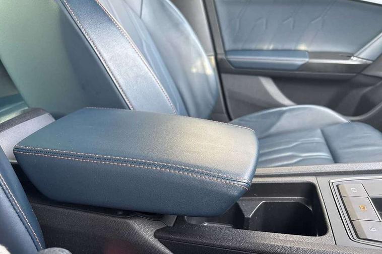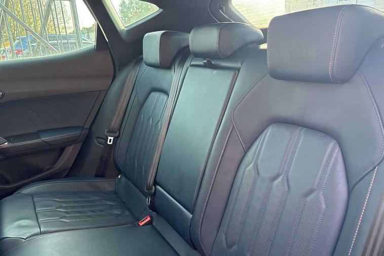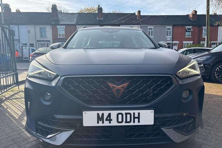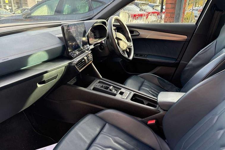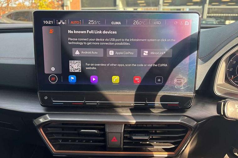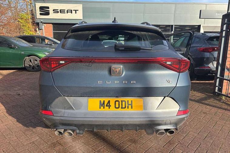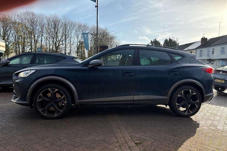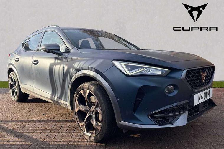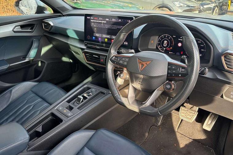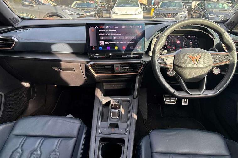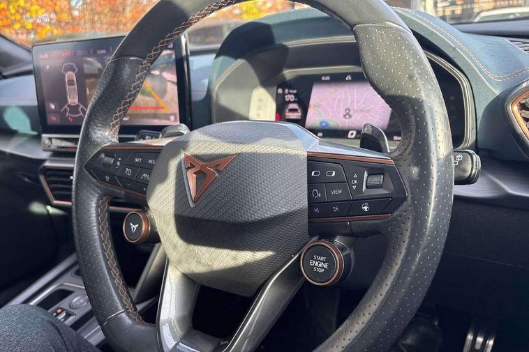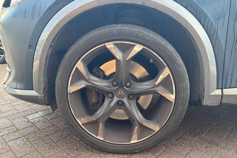 Digital cockpit and configurable dashboard, Driver alert system, Dynamic chassis control with driving profile selection (Comfort, Sport, CUPRA, Individual), E-call, Forward collision warning with automatic braking, Lane assist, Park assist (inc front/rear parking sensors), Predictive adaptive cruise control with speed limiter, RPM, trip computer, outside temp gauge, instrument light brightness, low fuel warning light, lights on reminder, gearshift indicator, Service interval indicator, Speed sensitive power steering, Start/stop system with regenerative braking, Virtual pedal and electric tailgate, Wireless apple carplay, Wireless phone charger, Electronic locking differential and dynamic traction support, Sports suspension with front shock absoption, 2 front and 2 rear USB type C sockets, Auxiliary input socket, DAB radio, Auto dimming rear view mirror, Body colour door handles, Body coloured bumpers, Dark grey wing mirror, Daytime running light with automatic headlight control and coming home feature, Dynamic headlight range control, Electric front/rear windows, Electrically adjustable heated and folding door mirrors with memory function, Front fog lamps with cornering function, Gloss black roof rails and window surrounds, LED Headlights, LED Taillights with dynamic indicator, Rain sensing wipers, Rear diffuser with twin exhaust pipe on each side, Rear side wing doors, Rear wash/wipe, Sports bumpers, Third brake light, Tinted rear windows, VZ logo rear badging, Welcome lights, 12v power supply in centre console, 12V socket, 12v socket in loadspace, 2 front and 2 rear reading lights, 230V socket, 3 seat bench in 2nd row, 60/40 split rear bench seat with armrest and mechanical seat release, Black headlining, Cupra sports pedals, Dust/pollen filter, Front and rear head restraints, Front centre armrest, Height/reach adjust steering wheel, Illuminated interior front door sills, Illuminated sunvisor with mirror, Isofix, Leather heated multi-function sports steering wheel with start stop, CUPRA mode button and gear shift paddles, Luggage tie-down hooks, Single front passenger seat, Three zone climate control with control panel in rear, Variable luggage/load compartment floor, Wraparound lighting, Genuine Nappa leather Pack - Cupra, Navigation system pack - Formentor, Safety and driving pack (XL) - Formentor, 3 point seatbelts on all rear seats, ABS, Brake control system - ESC and brake booster, Child proof door locks, Driver and front passenger airbags with front passenger airbag de-activation, Electronic parking brake, Front and rear disc brakes, Front side curtain airbags, Hill hold control, Seat belt reminder for front and rear seats, Tyre pressure monitoring system, Anti theft alarm system, Keyless entry and start system (KESSY), Locking wheel bolts, Copper and aluminium interior detailing, 19" 'Exclusive' machined sport matte black and silver alloy wheels, Space saver spare wheel,