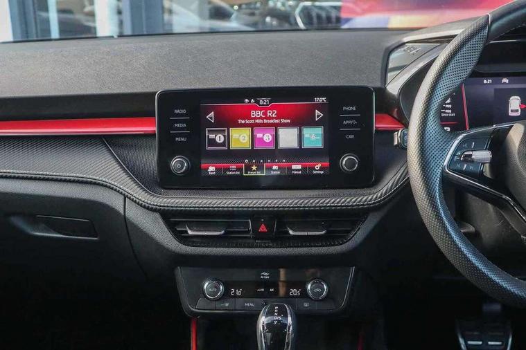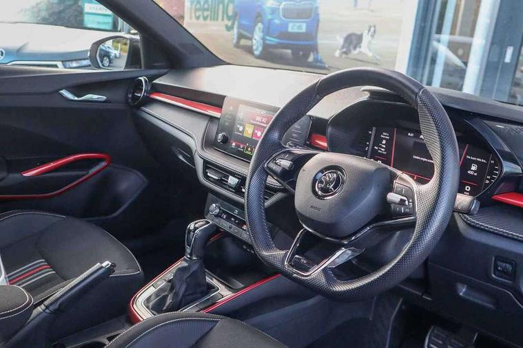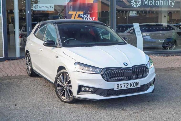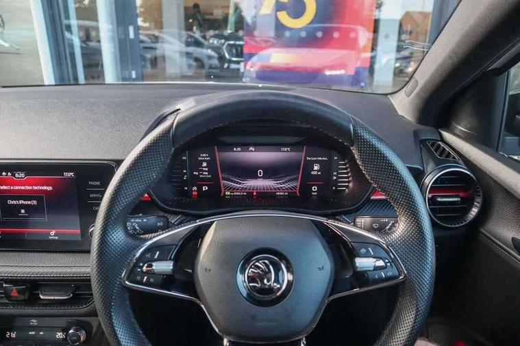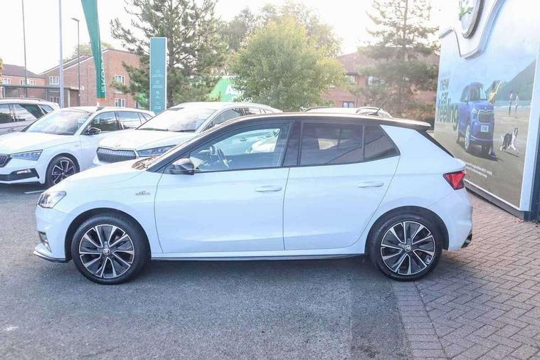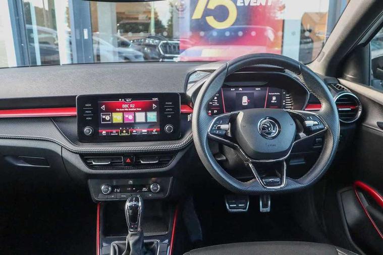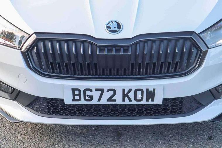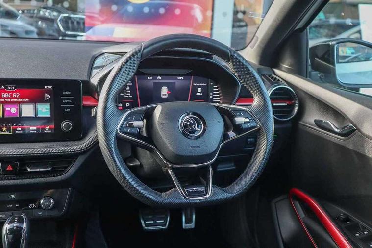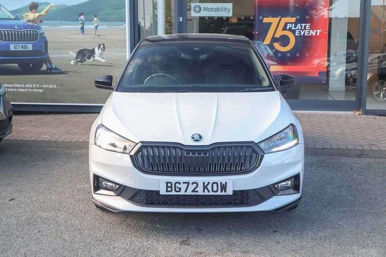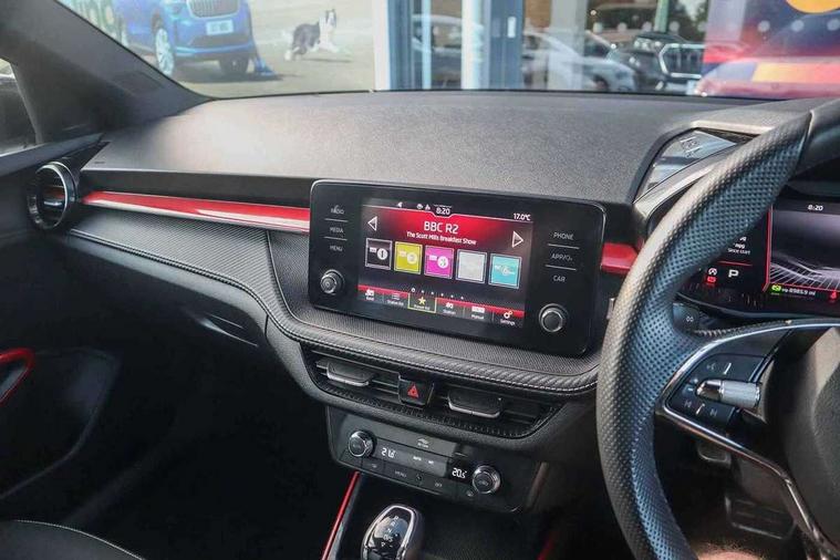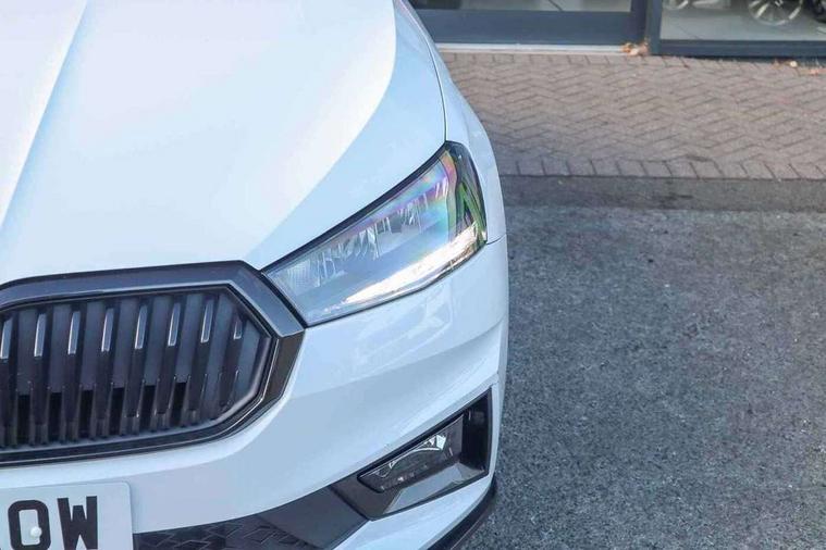 Bluetooth connection, Driver alert system - DAS, Electromechanical power steering, Exterior temperature gauge, Service interval indicator, 2x USB-C in the front (for data transmission and charging), 6 Speakers (4 in front and 2 in rear), Auxiliary socket for external MP3 player, Bolero radio with 8" colour display, DAB digital radio reception, Auto dimming rear view mirror, Basic rear lights, Black radiator grille, Body coloured bumpers, Door mirror integrated indicators, Electrically adjustable and heated door mirrors, Front and rear electric windows, Front window wiper intermittent control, Headlight range control - Automatic, Ice scraper in fuel cap, LED daytime running lights with coming and leaving home feature, Monte Carlo badging, Privacy glass, Rear LED fog light, Rear side wing doors, Rear window wiper with washing nozzles, Roof mounted spoiler, SKODA tailgate lettering in black, Sports bumpers, Third brake light, 3 rear headrests, Aluminium pedals, Backrest split and folding, Black headlining, Central console with removable cup holder and storage box, Chrome handbrake release button, Fabric/artificial leather upholstery, Front sports seats, Gearshift knob/handle in leather, Hand brake lever handle in leather, Height adjustable front headrests, Height adjustable steering wheel, ISOFIX and TopTether anchorage points to the outer rear seats, ISOFIX and TopTether on the front passenger seat, Luggage compartment lighting, Metallic painted red central console cover, Metallic red interior door handles, Monte Carlo door sills, Pollen filter, Rear seat bench unsplit, Single front passenger seat, Sun visors with mirror and airbag label on passenger side, Textile floor mats, Ticket holder, Umbrella in drivers door, Ambient lighting pack 2 - Fabia Hatchback, 3-point height adjustable front seats belts with pretensioner and force limiter, Automatic warning lights in case of crash, Driver and passengers airbag with switch off function, e-Call+, ESC including ABS, MSR, ASR, EDS, HBA and XDS, Front and rear seat belt warning, FRONT ASSIST (AEB City and AEB Inter Urban), Front side airbags, Head airbags, Hill hold assist, One tone horn, Pedestrian protection, Three rear 3-points safety seat belts with pretensioner and force limiter including stop function for outer rear seat belts, Tyre pressure monitoring system, Anti-theft alarm system including immobiliser, interior monitoring, backup horn, and towing protection, Carbon effect door and side trim panels, Carbon effect lower decorative trim with white stitching, Red metallic upper decorative trim, Anti-theft wheel bolts protection, Super-low rolling resistance tyres,