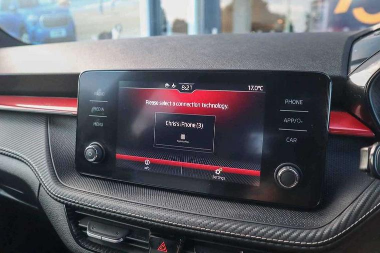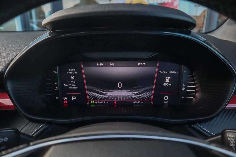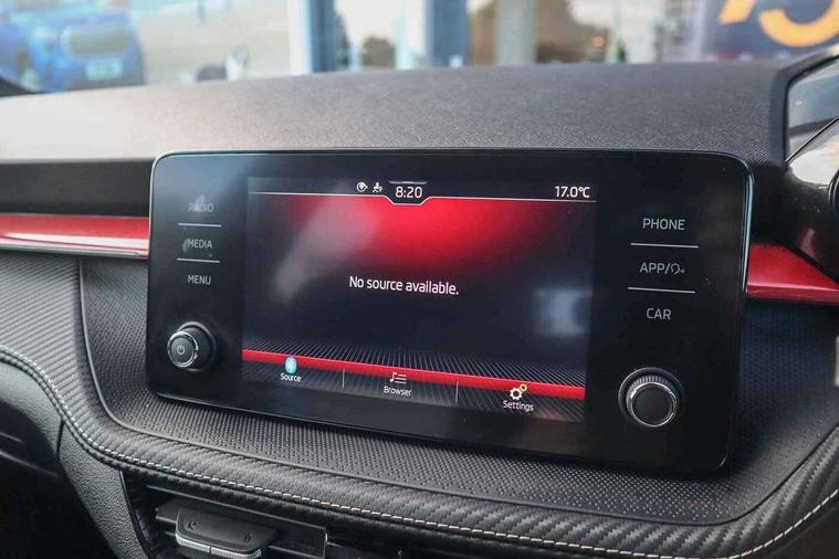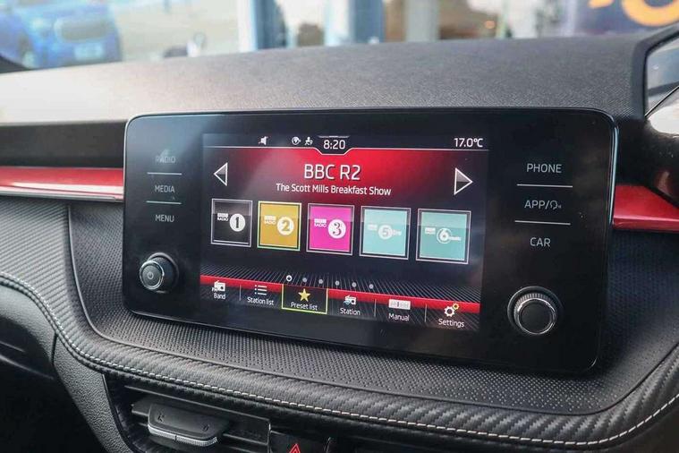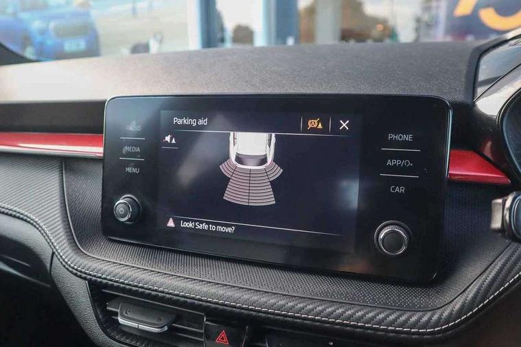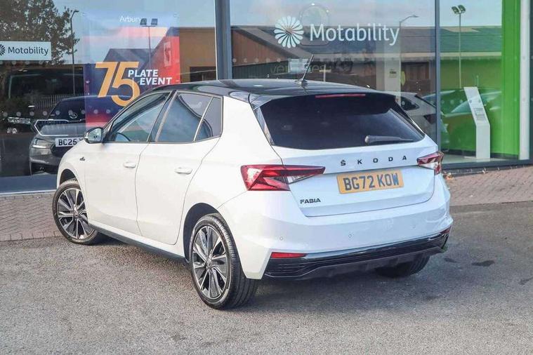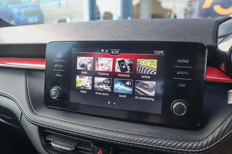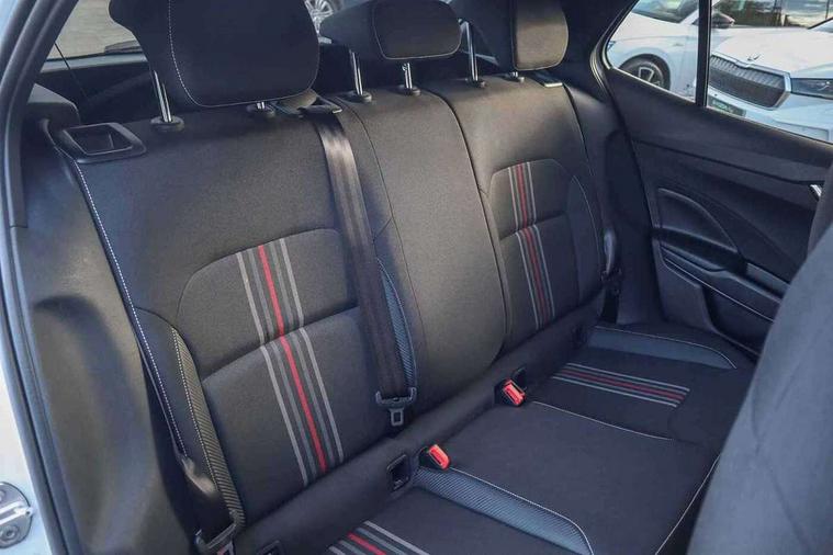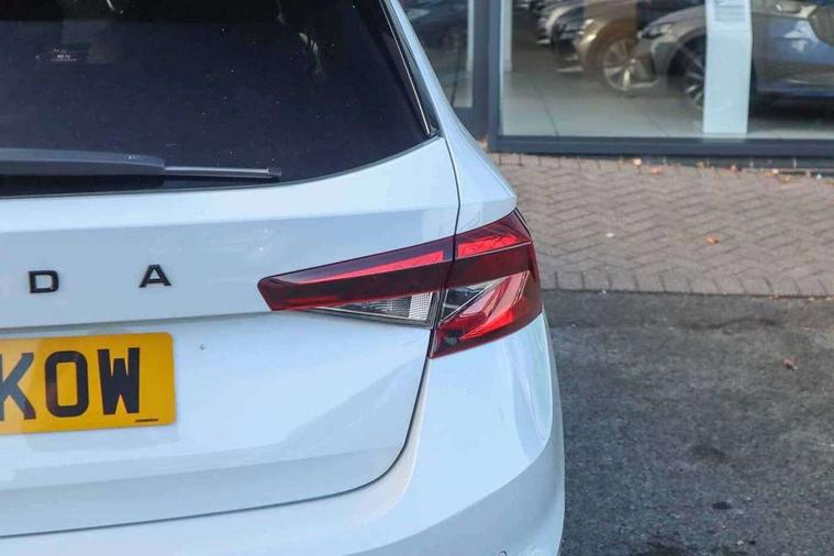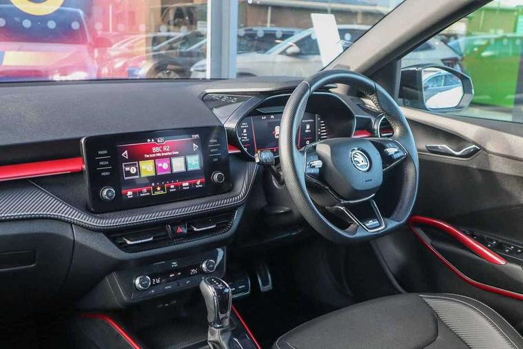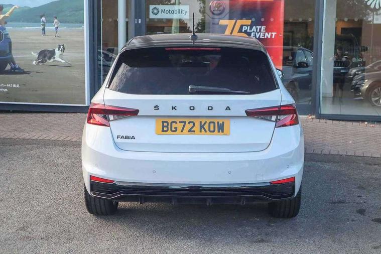 Bluetooth connection, Driver alert system - DAS, Electromechanical power steering, Exterior temperature gauge, Service interval indicator, 2x USB-C in the front (for data transmission and charging), 6 Speakers (4 in front and 2 in rear), Auxiliary socket for external MP3 player, Bolero radio with 8" colour display, DAB digital radio reception, Auto dimming rear view mirror, Basic rear lights, Black radiator grille, Body coloured bumpers, Door mirror integrated indicators, Electrically adjustable and heated door mirrors, Front and rear electric windows, Front window wiper intermittent control, Headlight range control - Automatic, Ice scraper in fuel cap, LED daytime running lights with coming and leaving home feature, Monte Carlo badging, Privacy glass, Rear LED fog light, Rear side wing doors, Rear window wiper with washing nozzles, Roof mounted spoiler, SKODA tailgate lettering in black, Sports bumpers, Third brake light, 3 rear headrests, Aluminium pedals, Backrest split and folding, Black headlining, Central console with removable cup holder and storage box, Chrome handbrake release button, Fabric/artificial leather upholstery, Front sports seats, Gearshift knob/handle in leather, Hand brake lever handle in leather, Height adjustable front headrests, Height adjustable steering wheel, ISOFIX and TopTether anchorage points to the outer rear seats, ISOFIX and TopTether on the front passenger seat, Luggage compartment lighting, Metallic painted red central console cover, Metallic red interior door handles, Monte Carlo door sills, Pollen filter, Rear seat bench unsplit, Single front passenger seat, Sun visors with mirror and airbag label on passenger side, Textile floor mats, Ticket holder, Umbrella in drivers door, Ambient lighting pack 2 - Fabia Hatchback, 3-point height adjustable front seats belts with pretensioner and force limiter, Automatic warning lights in case of crash, Driver and passengers airbag with switch off function, e-Call+, ESC including ABS, MSR, ASR, EDS, HBA and XDS, Front and rear seat belt warning, FRONT ASSIST (AEB City and AEB Inter Urban), Front side airbags, Head airbags, Hill hold assist, One tone horn, Pedestrian protection, Three rear 3-points safety seat belts with pretensioner and force limiter including stop function for outer rear seat belts, Tyre pressure monitoring system, Anti-theft alarm system including immobiliser, interior monitoring, backup horn, and towing protection, Carbon effect door and side trim panels, Carbon effect lower decorative trim with white stitching, Red metallic upper decorative trim, Anti-theft wheel bolts protection, Super-low rolling resistance tyres,