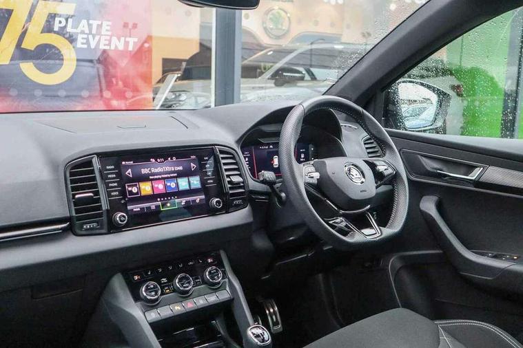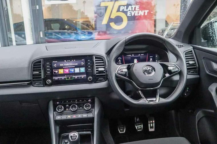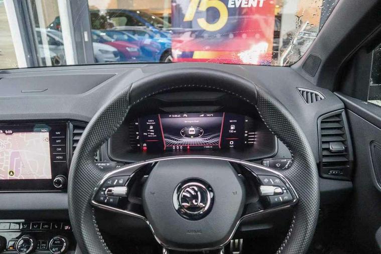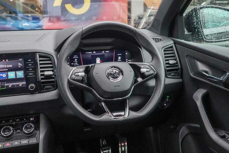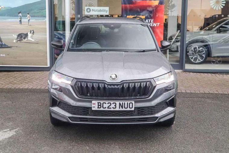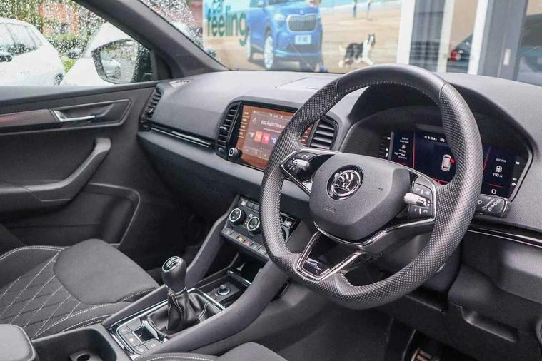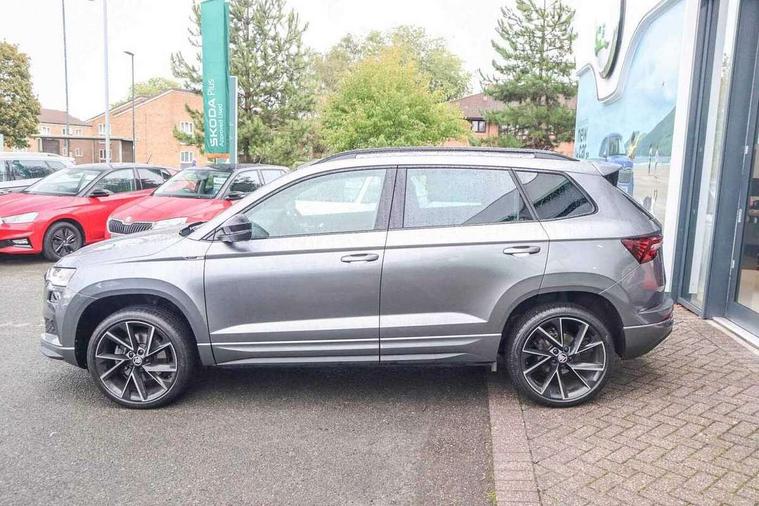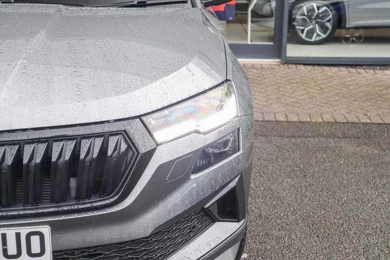 8" Digital display, Care connect, Driver fatigue sensor, Emergency services call system, Outside temperature gauge, Service interval indicator, SmartLink wireless for Apple and wired for Android, Start/stop system with regenerative braking, USB C Port x 2 in front centre console, Virtual cockpit, Virtual pedal with electrically operated boot door, 8 Speakers, DAB radio with Bluetooth, USB connection, Wireless charging without wireless aerial connection, Acoustic glass, Aero front windscreen wipers with intermittent function, Auto dimming rear view mirror with light and rain sensors, Black door mirrors, Black electric window control buttons, Black radiator grille, Black roof rails, Body colour door handles, Electric front and rear windows with child proof lock, Front door steps with SportLine logo, Heated rear windscreen, LED daytime running lights, LED rear lights with high functionality welcome effect and dynamic indicators, Light assistant (coming/leaving home/tunnel light), Panoramic sliding sunroof, Plastic scuff plates, Privacy glass, Protective door side sills in body colour, Rear diffuser, Rear side wing doors, Rear spoiler, Rear window wiper with washer system and intermittent control, Safety reflectors on front doors, Skoda lettering on tailgate in black, Sportline badge on front fender, Sportline decorative inserts with badging, Sports front and rear bumpers, 1.5 litre bottle holders in driver and front passenger door panels, 12V socket in boot, 12v socket in front centre armrest with storage compartment and rear air vents, 3 rear height adjustable headrests, 3 seat bench in 2nd row, 3 spoke leather sports multifunction steering wheel and silver stitching, 4 foldable roof handles with rear coat hooks, Black floor carpet, Black roof headlining, Chrome inner door handles, Double sided boot floor, Foldable hooks in the boot, Front head restraints, Height adjustable front three point seats belts with tensioners, Height/reach adjust steering wheel, Ice scraper, Illuminated glovebox, Illuminated luggage compartment, Isofix child seat preparation outer rear, Manual lumbar support for front seats, Pen holder, Pollen filter, Rear boot cover, Rear reading lights, Rear seats fixed folding and divided 60:40, Rubbish bin door, Safety vest holder, Single front passenger seat, Storage box in upper central dashboard closed, Sunvisors with illuminated vanity mirrors, Textile floor mats, Ticket holder, Titan black interior ceiling, Welcome animation with sportline logo, Boot pack - Karoq, Light Pack - Karoq, Parking pack - Karoq, Automatic door unlocking in case of crash, Automatic fuel cut off in case of crash, Child locks on rear doors, Driver airbag, Electronic parking brake with auto hold function, Emergency rear braking signal, ESC including ABS, MSR, ASR, EDS, HBA, DSR, RBS, MKB and traction control, Front side airbags, Hill hold control, Knee airbags, Passenger airbag with switch-off function, Pedestrian monitor, Seatbelt reminder signalisation and pretensioner for all seats, Three point seatbelts rear, Two tone horn, Tyre pressure display, Tyre pressure monitor, Alarm with interior monitoring, back up horn and tilt sensor with safe function, Electronic engine immobiliser, Keyless entry and start/stop, Remote central locking with 2 remote folding keys, Black air vent surround, Black centre console, Satin black dashboard, Satin black door trim, 19" Sagitarius anthracite alloy wheels with matt black aero inserts, Anti-theft wheel bolts protection, Matt black aero hub caps, Storage on wheel cover, Tool kit,