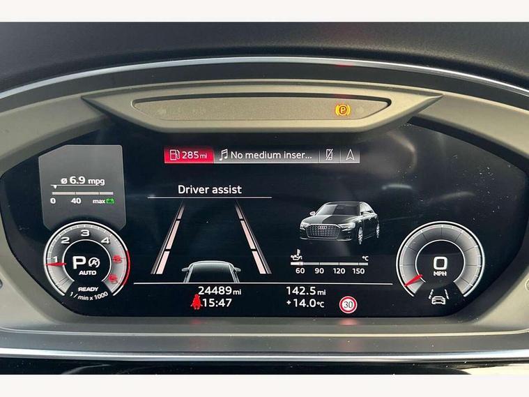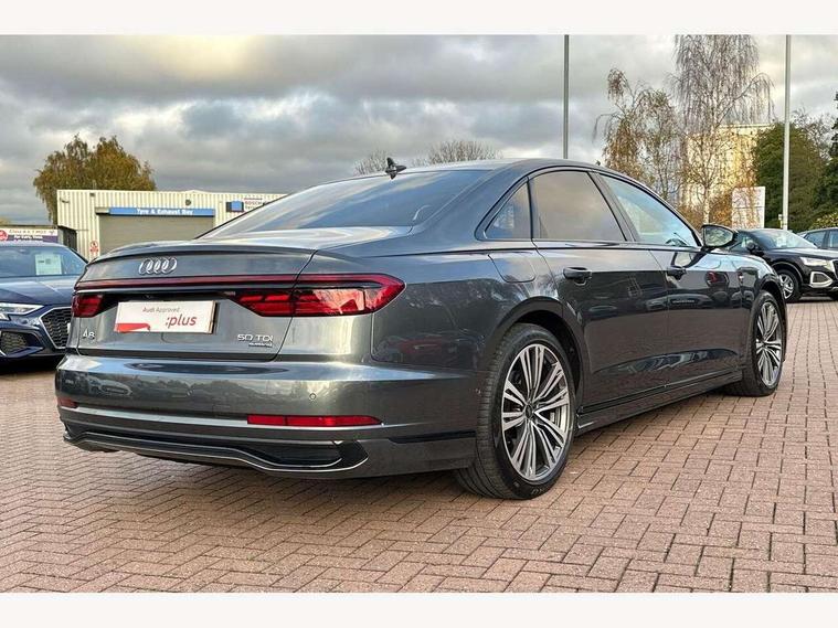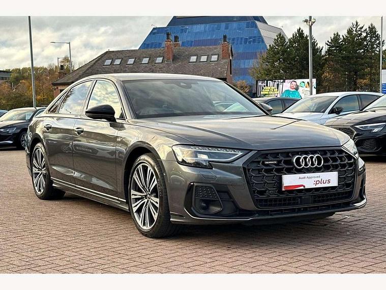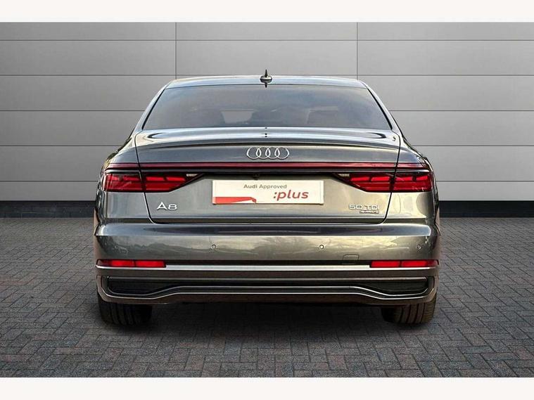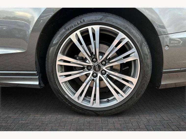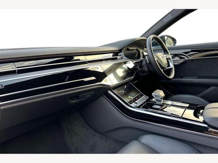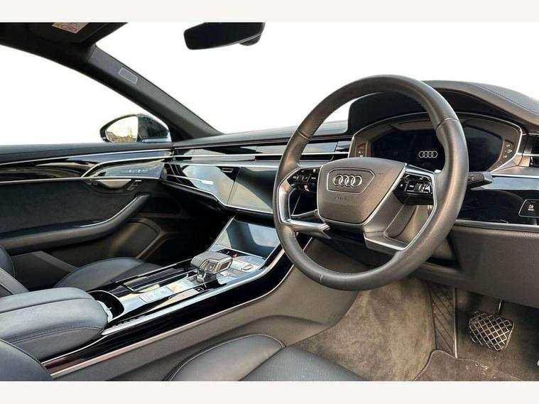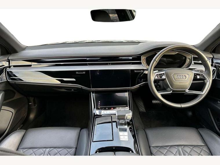'Lights On' Reminder warning buzzer, Adaptive cruise control with cruise assist, emergency assist, efficiency assist, swerve assist, turn assist and speed limiter, Audi connect safety and service (e-call), Audi drive select, Audi parking system plus with front and rear sensors, Audi phone box with wireless charging, Audi virtual cockpit, Audi wireless smartphone interface, Bluetooth interface, Camera based traffic sign recognition, Convenience key, Electro - mechanical power assisted steering, Head up Display, MMI navigation plus with MMI touch + Twin touch screens with haptic feedback, Operating buttons in black, glass look with haptic feedback including extended aluminium look, Power door closure, Power operated tailgate, Rear view camera, Remote fuel filler release, Service interval indicator, 24 litre AdBlue tank, 48V Mild hybrid technology, 8 speed transmission with hill hold assist, 82 litre fuel tank, Adaptive air suspension, Diesel particulate filter, Quattro all wheel drive with self locking centre differential, Audi music interface, Audi sound system, DAB digital radio module, DVD System, MMI radio plus, USB connection, Acoustic double glazing, Audi space frame, Auto dimming rear view mirror, Body colour bumpers, Body colour door handles, Body colour side protection with aluminium trim strips, Electric front windows, Electric rear windows with isolation switch, Electrically adjustable heated folding + automatically dimming exterior mirrors with memory function and integrated LED indicators, Headlight cleaning system, Heat insulating glass in side and rear windows, Heat insulating glass windscreen, Heated rear window, Heated windscreen washer jets, High beam assist, LED brake lights, LED daytime running lights, OLED rear lights with changeable rear light signature, Privacy glass, Rear boot, Rear side wing doors, Side skirts, Third brake light, 12V socket, 2 zone automatic air conditioning, 3 seat rear bench with centre armrest in 2nd row, 4 way electric lumbar support for driver and front passenger, Black cloth headlining, Centre console with cupholders, Comfort centre armrest, Door pockets with bottle holder, Driver and front passenger side sunvisors with illuminated vanity mirrors, Dust/pollen filters, Electric front seats with memory function, Electric sunblinds for rear window and rear door windows, Front floor mats, Glove compartment cooling, Heated front seats, Height/reach electric steering column with easy exit function, Isofix child seat mounting points on outer rear seats, Leather gearknob, Passenger footwell storage net, Reading lights, Rear floor mats, Rear headrests, Roof mounted sunglasses holder, Single front passenger seat, Valcona leather upholstery with front sports seats in diamond quilted, Black exterior styling pack - A8 Black Edition, Chrome exterior pack - A8, LED interior lighting pack - A8, 3 point seatbelts on all rear seats, ABS/EBD, Active front headrest system, ASR traction control, Audi pre sense basic, Audi pre sense front, Black brake calipers, Driver/Front Passenger airbags, EDL traction control, Electromechanical parking brake, ESP, Extended pedestrian protection measures, Front and rear disc brakes, Front and rear side airbags with head airbag system, Front passenger airbag deactivation, Rear child proof door locks, Seatbelt reminder + electric contact in buckle + advanced safety equipment, Tyre pressure loss indicator, Warning triangle and first aid kit, Anti theft alarm tow away protection, Anti-theft wheel bolts and wheel loosening detection, Remote central locking, Dark matt brushed aluminium lower inlays,