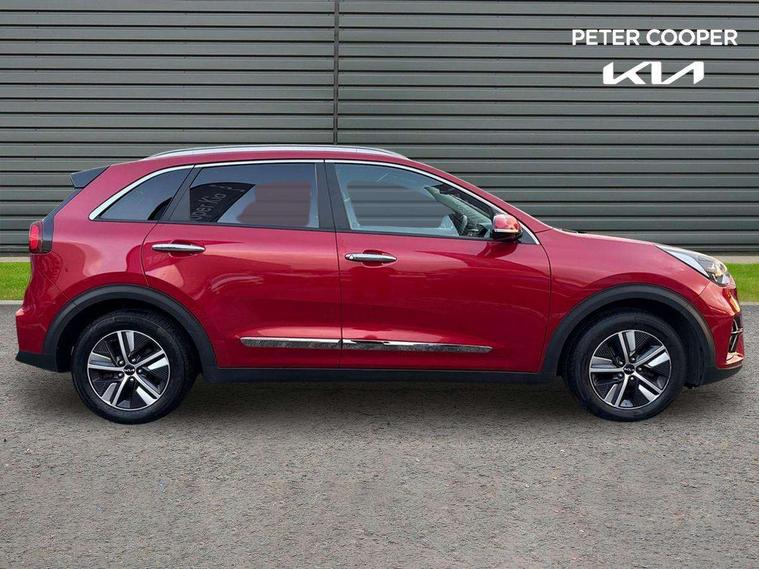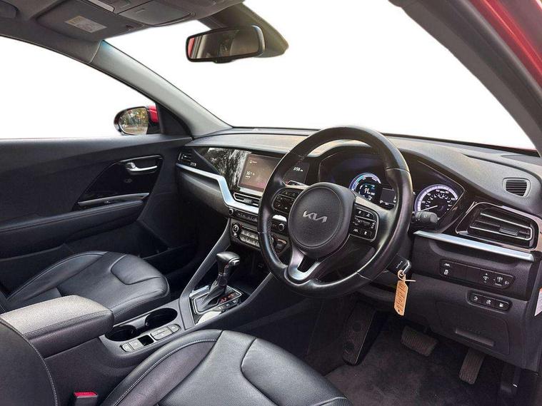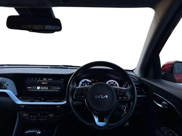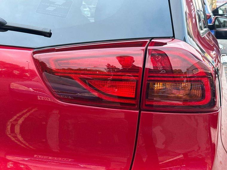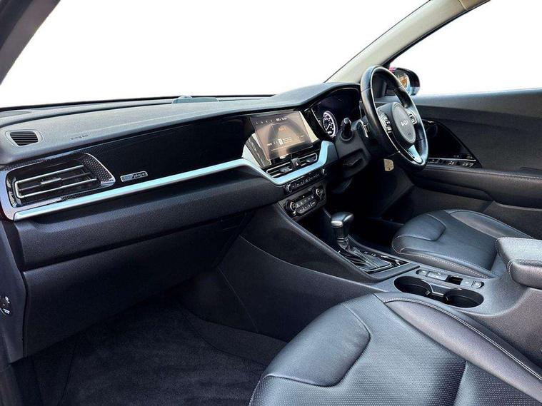 10.25" Touch screen satellite navigation with european mapping and traffic messaging channel, 7" full supervision cluster with TFT colour display, Adaptive smart cruise control function (SCC) with stop and go, Apple car play/Android Auto with voice control, Digital clock, Drive mode selector, Driver attention warning, Emergency stop signalling system, Forward collision avoidance assist, Front parking sensors, Kia connected services featuring TomTom live, Lane Following Assist (LFA), Lane keep assist, Motor driven power steering, Rear parking sensors, Reversing camera, Speed limiter, Trip computer with distance/fuel consumption/average speed, UVO connect, Wireless Smartphone charger, 'Shark fin' mobile antenna, 6 speakers, Bluetooth with music streaming, DAB Radio with MP3, Steering wheel mounted controls, USB connection located in centre console, USB port, All round electric windows with drivers and front passenger auto up/down function, Auto dimming rear view mirror, Automatic defog system, Automatic headlight control system, Black beltline mouldings, Black side sills, Black wheel arch mouldings, Body colour bumpers, Body coloured/high gloss door mirrors, Chrome door handles, Driver's side wide angle mirror, Electrically folding/adjustable/heated door mirrors with LED indicators, LED daytime running lights, LED fog lights, LED rear combination lights, Manual headlight levelling, Matt black radiator grille, Privacy glass - Rear windows and tailgate, Projector headlamps, Rain sensing front wipers, Rear spoiler, Rear wiper, Roof rails, Solar glass, Waistline chrome coating, Welcome and follow-me home light functionality, 3 x passenger assist grips, 60/40 split/folding 2nd row of seats, 8 way electric adjustable drivers seat, All-round height adjustable headrests, Aluminium door scuff plates, Bulb type overhead console lamp with sunglasses case, Centre console storage box, Centre room lamp, Cupholders in rear armrest, Driver/passenger sunvisors with illuminated vanity mirrors, Drivers seat power lumbar support, Dual zone automatic air conditioning, Front and rear door storage, Front/rear centre armrests, Headlining in Light grey, Heated front seats, Heated steering wheel, High gloss black lower console trim, High gloss black steering wheel trim, Illuminated ignition key hole, Interior door lock/unlock function, ISOFIX Child seat top tethers and anchor fixings, Leather trimmed door armrests, Leather trimmed steering wheel, Leather trimmed steering wheel and gearshift, Leather upholstery, Luggage area lamp, Luggage area load cover, Luggage net with hooks, Paddle shifts, Passenger seat height adjuster, Satin finish inner door handles, Seatback pocket - driver, Seatback pocket - front passenger, Tilt/telescopic adjustable steering wheel, Under floor storage box, Ventiliation ducts to rear compartment, Towing pack - Niro, 3 point seatbelts on all seats, ABS, Automatic unlocking of doors in case of impact, Drivers knee airbag, Electric parking brake with auto hold function, Electronic stability control, Front passenger airbag cut-off switch, Height adjustable front seatbelts, Hill start assist control (HAC), Traction control, Twin curtain airbags with roll over sensor, Twin front and side airbags, Tyre pressure monitoring system, Alarm system and engine immobiliser, Deadlocks, Locking wheel nuts, Remote central door locking with fold away key, Speed sensitive auto door locking, Visible vehicle identification number, High gloss black centre fascia, High gloss black door inserts, 16" alloy wheels, Tyre mobility kit,