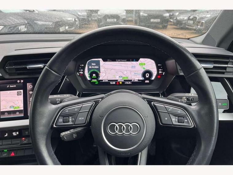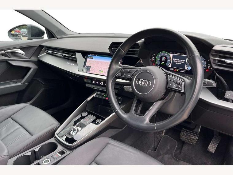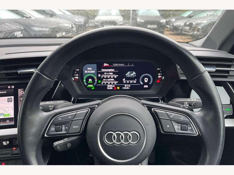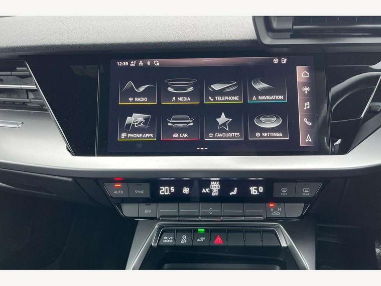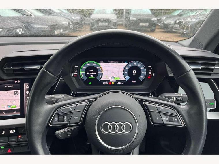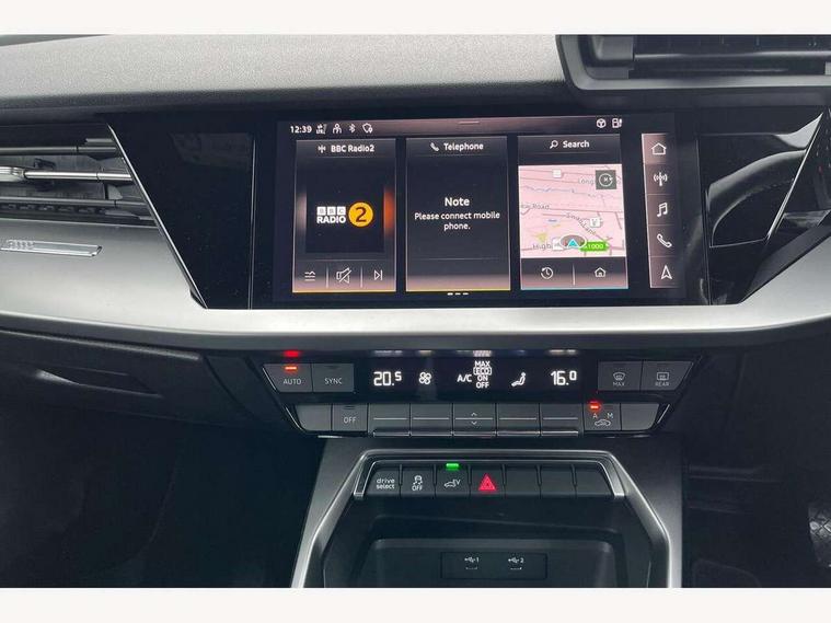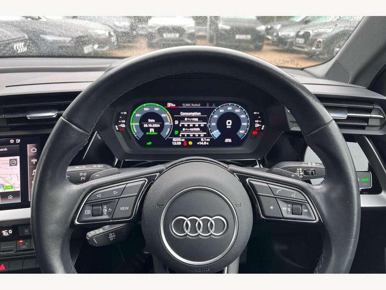 Audi connect emergency call and service, Audi drive select (Auto, Comfort, Dynamic, Efficiency and Individual), Audi smartphone interface, Audi Virtual Cockpit - 10.25" digital and colour instrument cluster, Automatic start/stop system with recuperation, Bluetooth interface, Collision avoidance assistant, Electromechanical power speed sensitive steering, Lane departure warning system, MMI Navigation Plus with high resolution 10.1" colour touch screen display, Service indicator, Trip computer, Voice control system with natural language interaction, 3 pin 10 amp domestic charging cable, Standard suspension, Type 2 mode 3 32 amp charging cable, Type 2 socket for AC charging, 2xUSB-C connection with data and charging functions, 6 passive loudspeakers, DAB Digital radio, Acoustic glass windscreen, Aluminium window trim, Auto dimming frameless rear view mirror, Body colour exterior mirrors, Body colour roof spoiler, Electrically adjustable/heated/folding/dimming door mirrors with kerb view includes integrated LED indications + kerb view function for passenger side, Front electric windows, LED daytime running lights, LED headlights and halogen rear lights, Light and rain sensors, Rear electric windows, Rear window, rear door windows and rear side windows in clear glass, Rear wiper, 12V socket and storage compartment in front centre console, 40/20/40 split folding rear seat bench with cupholder, Dual zone electronic climate control, Front and rear centre armrest, Front and rear headrests, Front door sill trims with aluminium inlay, Front/rear floor mats, Height and reach adjustable steering wheel, Interior lighting - Front and rear roof module including reading lights, glove compartment light and right hand side, Luggage compartment floor covering, Manual boot compartment lid, Manually adjustable front seats, Seat side bolsters, Steel grey cloth headlining, Tool kit, Twin leather upholstery, Aluminium interior elements pack - A3 Sportback, Sport styling pack - A3 Sportback, 3x3 point rear seat belts, Driver and front passenger airbag with passenger airbag deactivation, Electronic Stabilisation Control (ESC) including ABS, ASR and EDL, First aid kit with warning triangle and 2 safety vests, Front side airbags with head airbags and interaction airbag, Hill hold assist, Pre-sense front with pedestrian and cyclist detection, Seatbelt monitoring, Tyre pressure loss indicator, Anti theft alarm, Anti-theft wheel bolts, Electronically operated child lock, Immobiliser, Remote control central locking, Inlays with silk effect paint in platinum grey, Tyre repair kit,