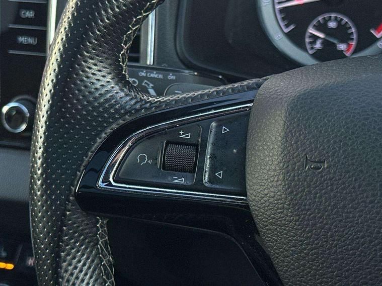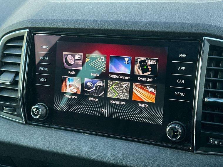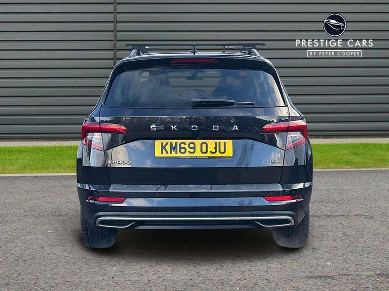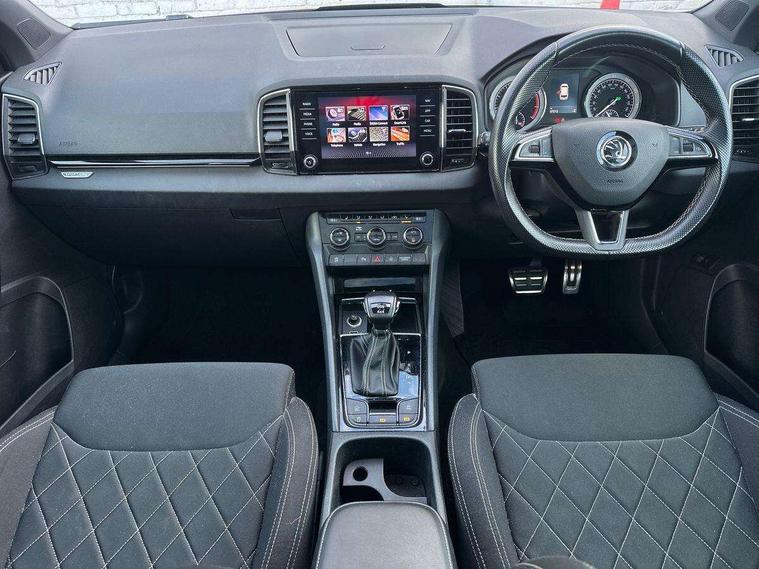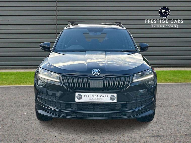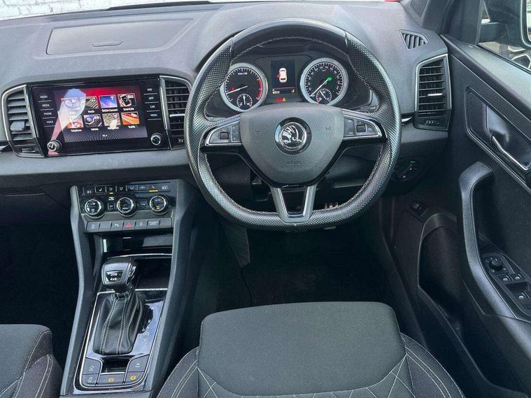 Drive mode selection with off road, Driver alert system, Driver fatigue sensor, Driver profile selection, Multifunction colour trip computer, Outside temperature gauge, Rear view camera, Service interval indicator, Start/stop system with regenerative braking, DAB radio with Bluetooth, SD card slot, USB connection, Acoustic glass, Aero front windscreen wipers with intermittent function, Automatic headlight control system, Black roof rails and door mirrors with radiator grille, Body colour door mirrors and handles, Chrome outside aluminium bar around the window, Electric front and rear windows with child proof lock, Electrically adjustable heated folding and auto dimming door mirrors with boarding spots, Front door steps with SportLine logo, Full LED headlights + adaptive front light system + LED daytime running lights and front cornering fog lights, Headlight washers, Heated rear windscreen, LED rear lights with high functionality, Light assistant (coming/leaving home/tunnel light), Panoramic sliding sunroof, Privacy glass, Protective door side sills in body colour, Rear diffuser, Safety reflectors on front doors, Sportline badge on front fender, Sportline decorative inserts with badging, Sports front and rear bumpers, Third brake light, 1.5 litre bottle holders in driver and front passenger door panels, 12V socket in boot, 12v socket in front centre armrest with storage compartment and rear air vents, 2 Folding hooks and nets in boot, 2 Front readings lights for driver and passenger, 3 rear height adjustable headrests, 4 foldable roof handles with rear coat hooks, 4 lashing points on luggage floor, Aluminium pedals, Backrest release, Black roof headlining, Cargo elements in boot, Chrome inner door handles, Driver and passenger seats height adjust, Dual zone climate control, Front seat and rear pockets, Height adjustable front three point seats belts with tensioners, Height/reach adjust steering wheel, Ice scraper, Illuminated and cooled glovebox, Illuminated luggage compartment, Isofix child seat preparation outer rear, Manual lumbar support for front seats, Net programme in boot, Pen holder, Pollen filter, Rear boot cover, Rear reading lights, Rear seats fixed folding and divided 60:40, Removable LED torch in the boot, Retractable parcel shelf attachable to tailgate, Safety vest holder, Storage box in upper central dashboard closed, Storage compartment below the passenger seat, Storage net on centre console passenger side, Sunvisors with illuminated vanity mirrors, Textile floor mats, Umbrella under passenger seat, Welcome animation with sportline logo, LED Interior lighting pack with Skoda welcome logo - Karoq, Airbags - Front side, head, knee and curtain, Automatic door unlocking in case of crash, Automatic fuel cut off in case of crash, Driver airbag, Electronic parking brake with auto hold function, Emergency rear braking signal, ESC including ABS, MSR, ASR, EDS, HBA, DSR, RBS, MKB and traction control, Front assist radar scanning of the space in front of the car with automatic braking, Hill hold control, Passenger airbag with switch-off function, Pedestrian monitor, Seatbelt reminder signalisation and pretensioner for all seats, Three point seatbelts rear, Two tone horn, Tyre pressure display, Tyre pressure monitor, Alarm with interior monitoring, back up horn and tilt sensor with safe function, Electronic engine immobiliser, Keyless entry and keyless start with safe system, Remote central locking with 2 remote folding keys, Chrome framed air vents, 19" Vega anthracite alloy wheels, Anti-theft wheel bolts protection, Storage on wheel cover,