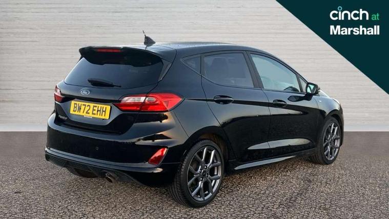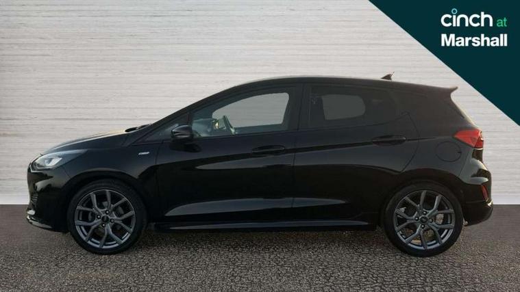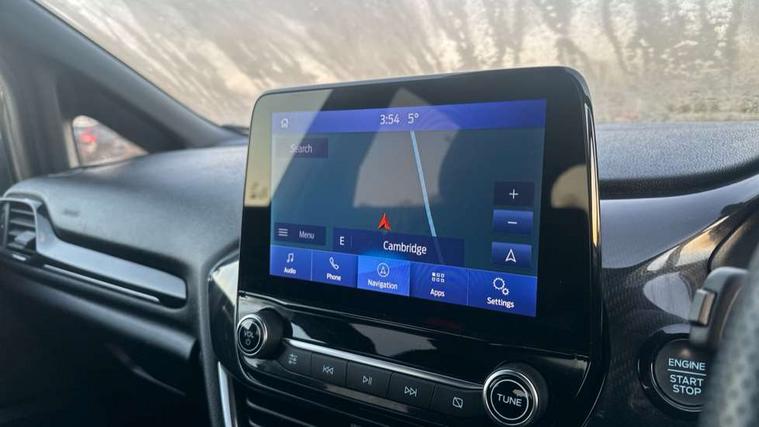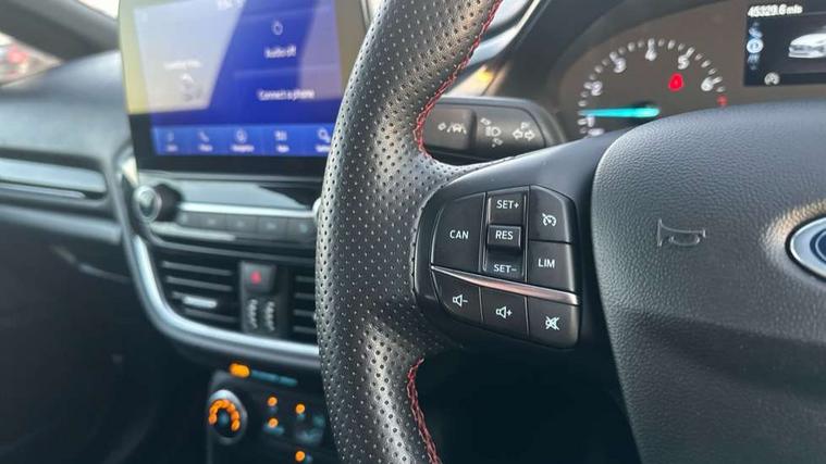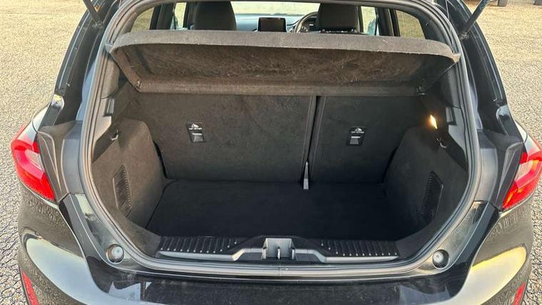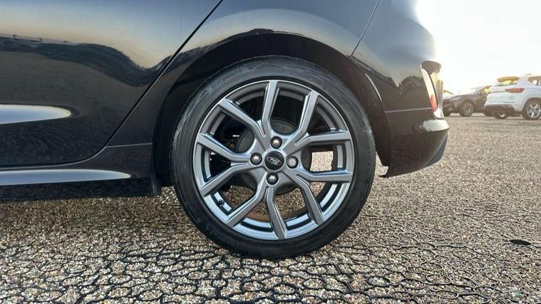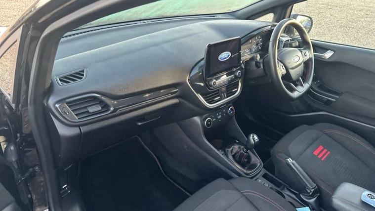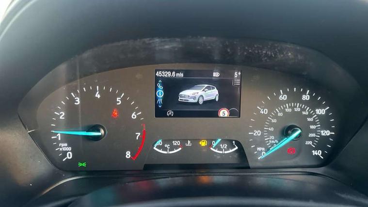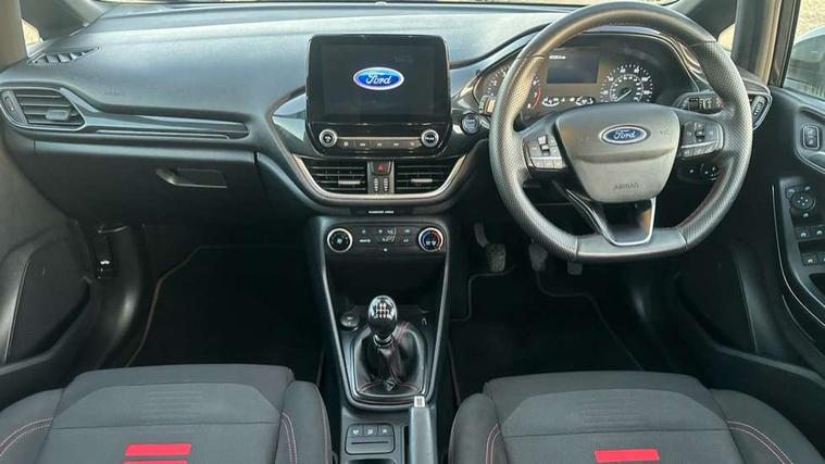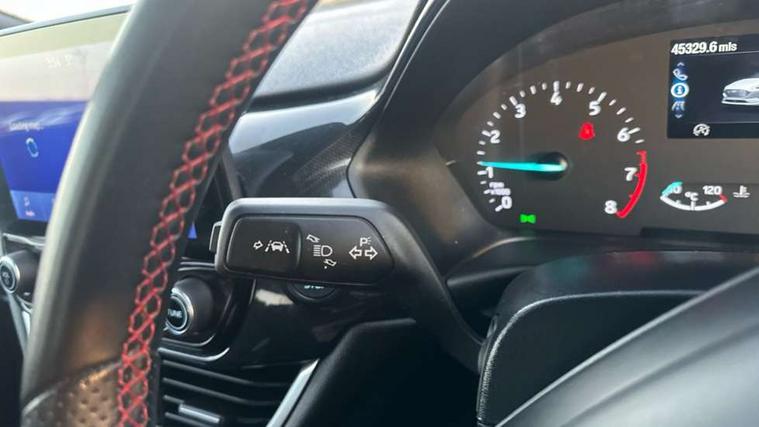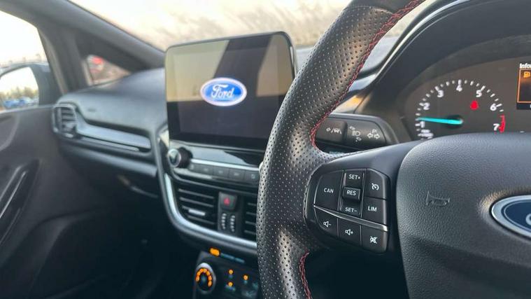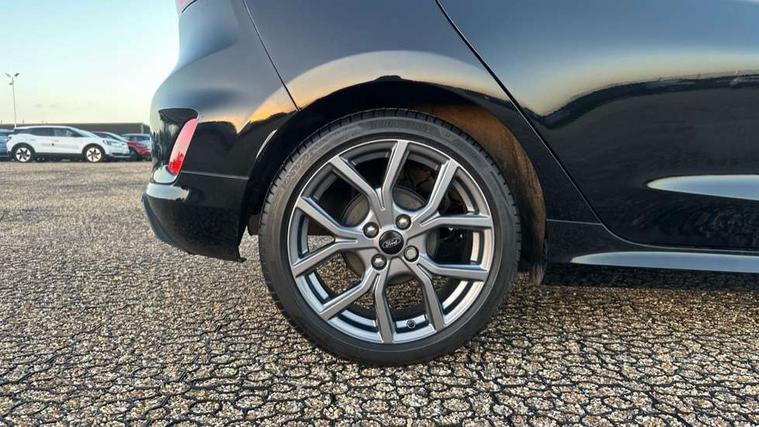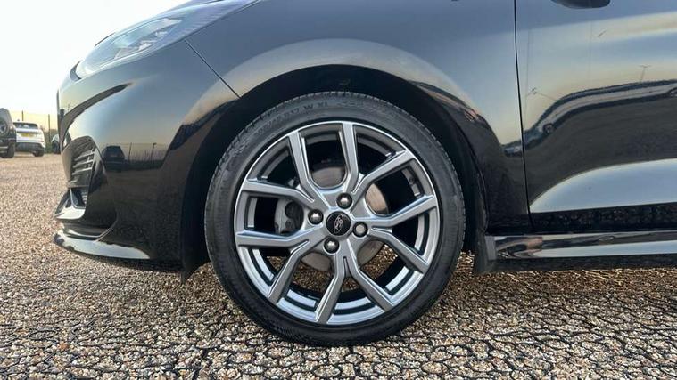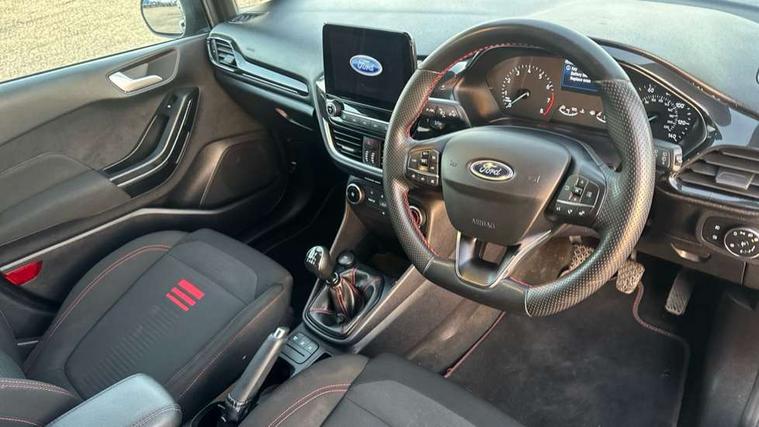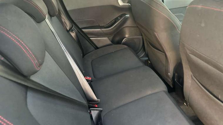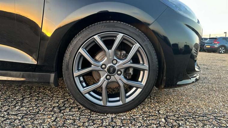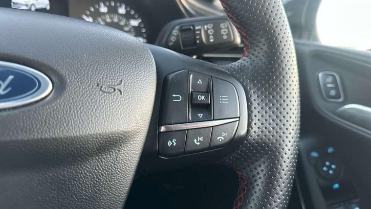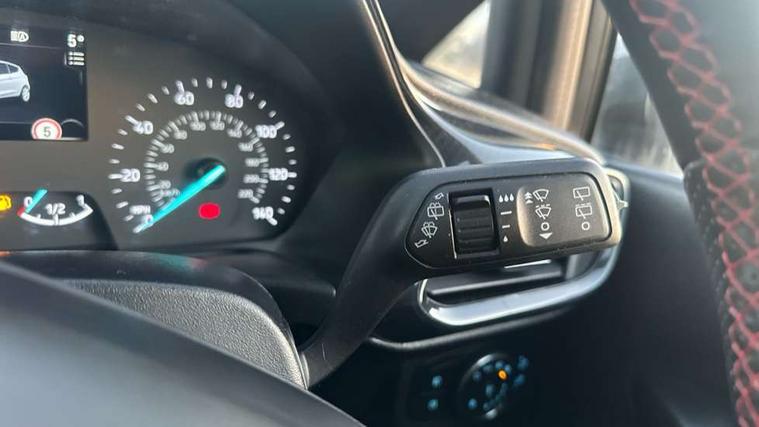 4.2" Colour TFT Ice blue illumination analogue cluster, Driver alert system, Electric power steering, Ford easy fuel, Lane keep assist, Lane keeping aid, Rear parking distance sensors, Selectable drive modes (Normal, Sport, Track), Trip computer, Sports suspension, 3rd brake light, Auto high beam, Automatic headlights, Body colour bumpers, Body colour large rear spoiler, Body coloured electrically operated with side indicators, Electric front windows/one touch facility, Electric rear windows, Quickclear heated windscreen, Rain sensing wipers and auto dimming rear view mirror, Rear privacy glass, Rear side wing doors, Rear wiper, Unique ST-Line grille, full bodystyling kit and large body coloured rear spoiler, 3 rear headrests, 3 seat bench in 2nd row, Adjustable head restraints, Black headlining, Centre console with opening armrest, 2x cupholders, 12v and USB, Cloth upholstery with red stitching, Leather gear knob, Manual 2 way passenger seat adjust, Manual 4-way driver seat adjust, Manual air conditioning, Premium floor mats, Sensico wrapped steering wheel, Single front passenger seat, 3 point seatbelts on all rear seats, Electronic stability control with hill start assist, Front and rear seat belt warning, Manual child lock in rear doors, Tyre pressure monitoring system, Keyless start with 'Ford Power' starter button, MyKey system, Remote central locking, Thatcham alarm with power door dead locks, 17" 5x2 spoke alloy wheels with rock metallic finish,