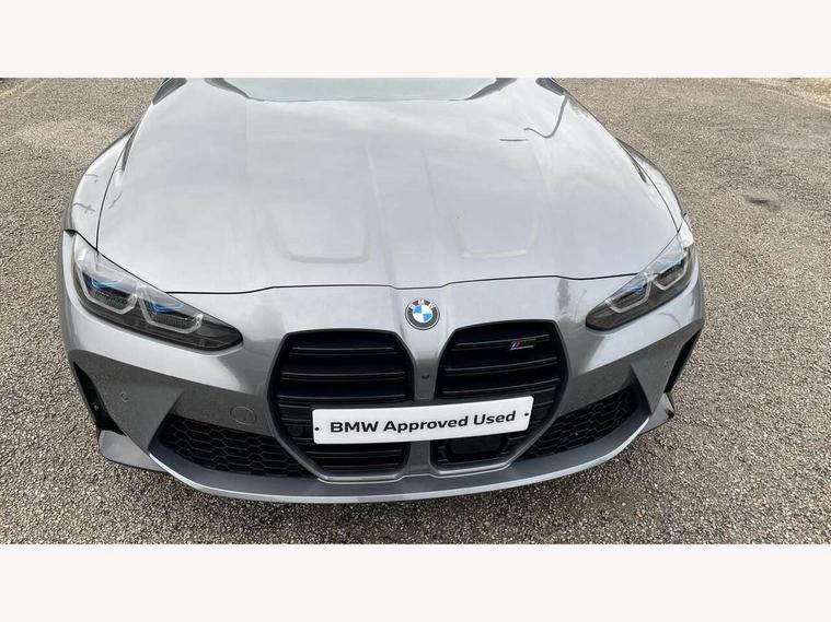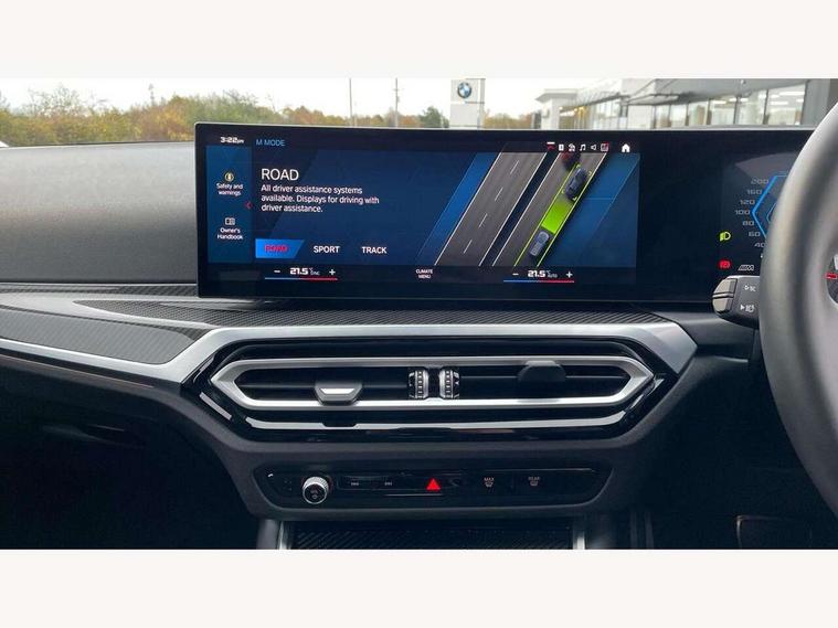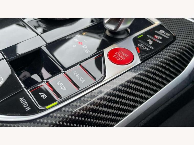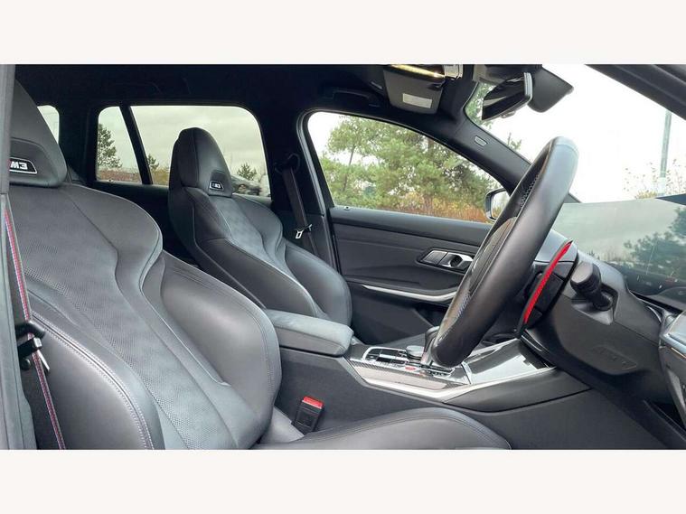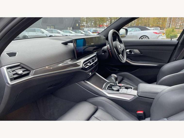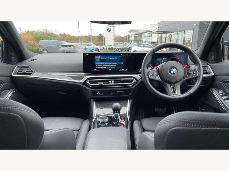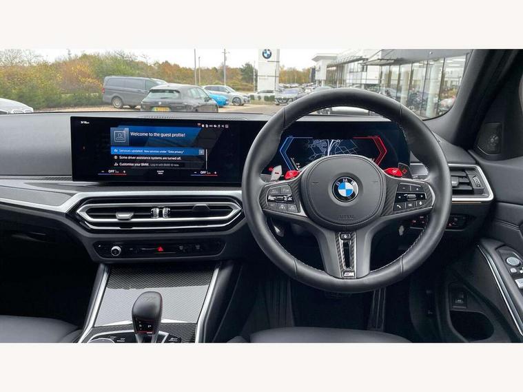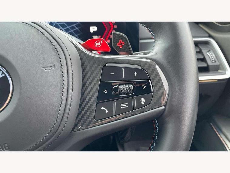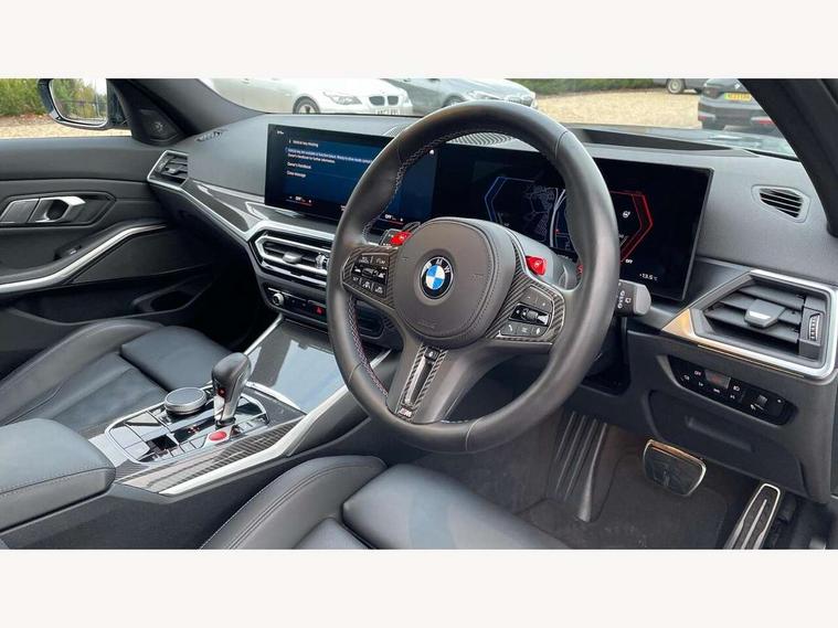Active guard plus, Automatic start/stop system, Bluetooth functionality with Apple CarPlay/Android Auto, BMW ConnectedDrive online services, BMW iDrive controller on centre console, BMW legal emergency call, BMW Live Cockpit Professional sat nav system with 12.3" instrument display and high resolution control display, BMW Online services, BMW Teleservices, Brake pad wear indicator warning light, Condition based service, Door/boot open warning light, Driving experience switch, Electric boot lid, Head up Display, Illuminated control elements, Instrument cluster with extended contents, Lights on warning, M drive buttons, Oil sensor for level and grade, warning by check control system, Oil temperature gauge, On board computer, On board diagnostics, Optimum shift indicator, Outside temperature display, Pull away assistant, Run flat indicator, Service interval indicator, Shifting point display, Speed limiter, Variable sport steering, Adaptive M Sport suspension, Double joint spring strut front axle, M Drive Professional including track mode, laptimer, traction control & Drift analyser, M Sport differential, M steptronic sport transmission with drivelogic, Safety battery terminal clamp, 8 programmable favourite buttons, Auxiliary point for auxiliary devices, DAB Digital radio, Harman/Kardon loudspeaker system, Personal eSim, 3rd brake light, Acoustic glazing, Auto dimming driver's door mirror, Auto dimming rear view mirror, Automatic headlights + automatic windscreen wipers, Automatic parking function on front passenger's exterior mirror, Black model designation badges, BMW emblem on engine compartment lid and tailgate, BMW high gloss shadow line with extended contents, BMW Individual shadowline lights, Body colour bumpers, Carbon fibre reinforced plastic (CFRP) roof with high gloss black roof aerial bulge and roof mouldings, Day time running light, Door mirror integrated indicators, Door sill finishers with aluminium inserts, Dynamic brake lights, Electric adjustable heated door mirrors, Electric folding door mirrors, Electric front and rear windows with one touch/convenient open/close function, Follow me home headlights, Front and rear apron plastic in body colour, Front and rear bumper system, Headlight beam throw control, Heat protection, sun protection glazing, Heated rear window with automatic switch off, Heated washer jets, High beam assistant, High gloss black frameless kidney grille with M badge, High gloss black lower bumper edges, side sills and diffuser edge binding, High gloss black M roof rails, Illuminated bow type door handles in body colour drivers side with door lock, LED number plate light, LED tail lights with 3D L-shaped LED light design, M designation, M Sport entry door sill strips, Mirror glass aspheric on driver's side, convex on passenger side, Rear fog lights, Rear reflectors, Rear right M3 competition inscription, Rear side wing doors, Rear wiper, Reversing light, Shark fin roof aerial, Strakes in front side panel, black matt/black high-gloss, with model badge, Visible VIN plate, Welcome lighting, 2 front cupholder in centre console with clamping elements and matt black inlay, 2 x 12 V Power sockets (luggage compartment and front centre console), 2 x USB Type C ports for charging and data transmission in front centre console, 3 folding rear headrests, 3 seat bench in 2nd row, Ambient inside door handle light, Ambient lighting for instrument panel, Ambient lighting for storage compartment, Ambient lighting front and rear, Ambient lighting in door panels, Anthracite headlining, Battery in luggage compartment, Carbon fibre centre console incl. cover for cupholders and storage compartment, Carbon fibre decorative steering wheel finishers, Carbon fibre shift paddles, Carbon fibre strip in instrument panel on front passenger side, Centre console armrest with storage compartment, Compartment in front of cupholder, Driver/passenger sunvisors with illuminated vanity mirrors + covers, Dynamic ambient interior lighting, Electric front seats + driver memory, English handbook, Floor mats in velour, Folding rear centre armrest with 2 cupholders, Front door storage bins with bottle holder, Front isofix attachment + airbag deactivation, Front seat backrest width adjustment, Front seats lumbar support, Front/rear door armrests, Gearshift lever with embossed M badge, Heated front seats, Height adjustable front headrests, Isofix on 2nd row outer seats, Lockable/illuminated glovebox, Luggage compartment lighting, Manual 40:20:40 split folding rear seat with two tilt positions for backrest, Multifunction steering wheel, Rake/reach adjustable steering wheel, Single front passenger seat, Storage compartment in rear doors, Three zone automatic air conditioning, Through loading system, Toolkit located in luggage compartment, Wireless charging tray, Additional storage compartment pack - M3, Connected package professional - M3, High gloss shadowline exterior trim pack - M3, 3 point seatbelts on all seats, Anti-lock braking system (ABS), Automatic Stability Control (ASC), Brake energy regeneration, Brake fade compensation, Compound structure brake discs, Cornering brake control (CBC), Crash sensor, Driver/Front Passenger airbags, Dry braking, Dynamic brake control, Dynamic stability control + (DSC+), Dynamic Traction Control - DTC, Electromechanical parking brake, Electronic differential lock control (EDLC), Front and rear head airbags, Front seat side impact airbags, Front seatbelt pretensioners + load limiters, Hill start assist, M Sport seat belts, Rear child proof door locks, Seat occupancy detection for driver and passenger side, Seatbelt warning, Side impact protection, Two tone horn, Tyre pressure sensor, Warning triangle and first aid kit, Centre lock switch, Closing system with central locking, Digital key, Electronic immobiliser, Thatcham cat 1 remote alarm, Vehicle Key with 4 buttons including the integrated key, Galvanic finish to control surrounds, High gloss black interior trim, T