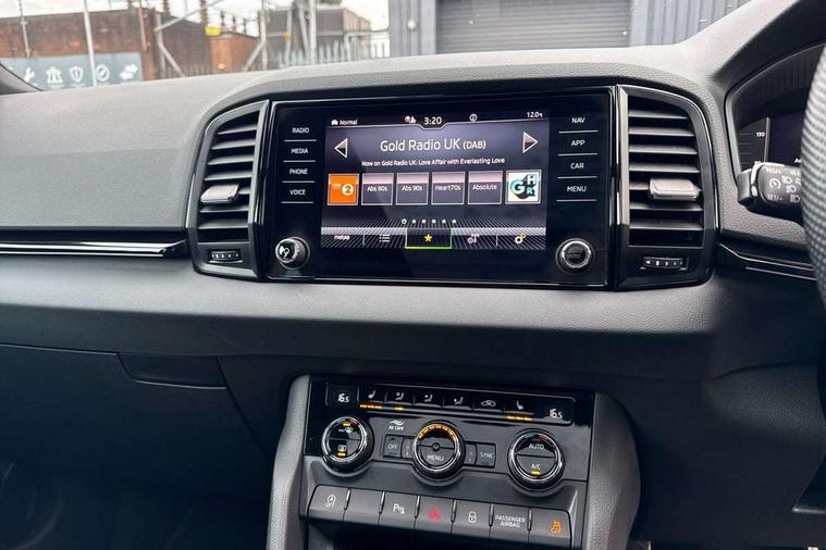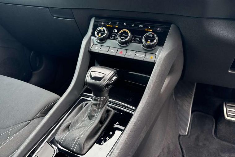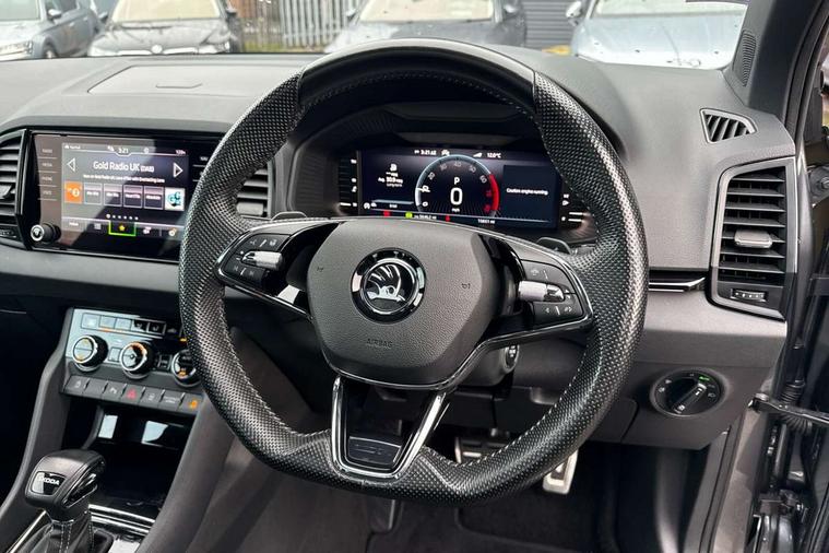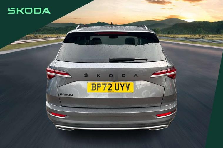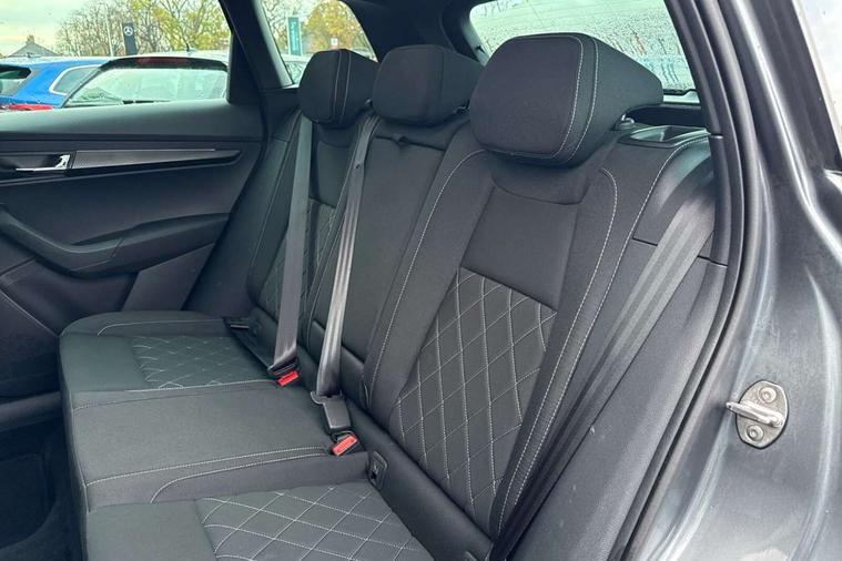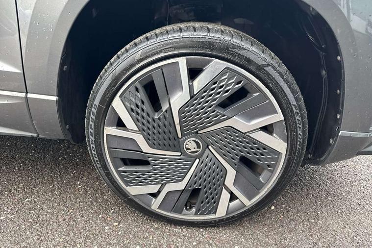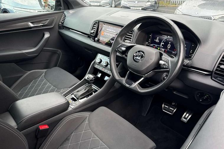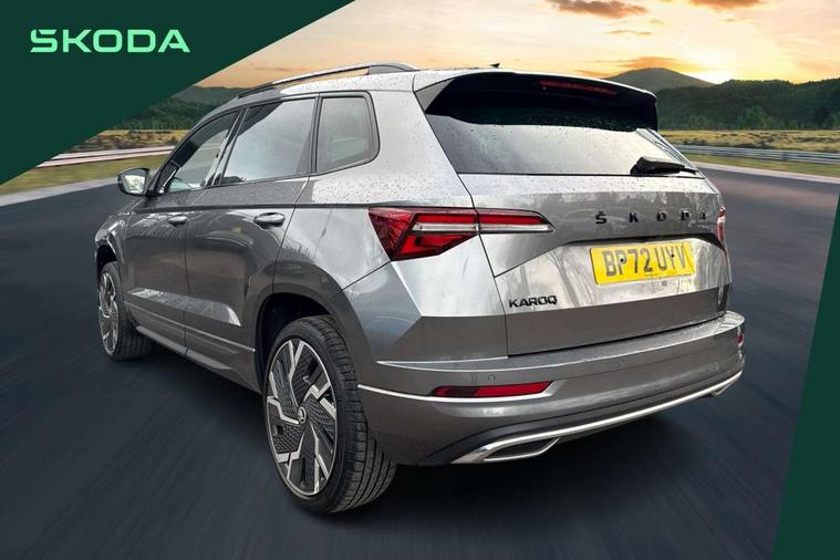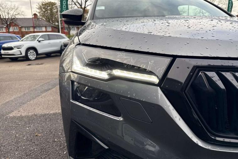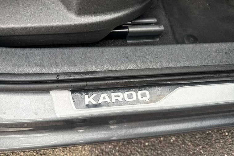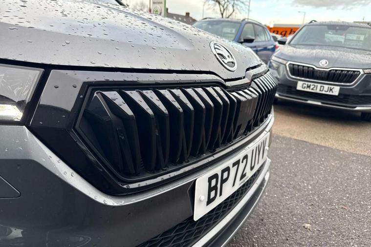 8" Digital display, Care connect, Driver fatigue sensor, Emergency services call system, Outside temperature gauge, Service interval indicator, SmartLink wireless for Apple and wired for Android, Start/stop system with regenerative braking, USB C Port x 2 in front centre console, Virtual pedal with electrically operated boot door, 8 Speakers, DAB radio with Bluetooth, USB connection, Acoustic glass, Aero front windscreen wipers with intermittent function, Auto dimming rear view mirror with light and rain sensors, Black door mirrors, Black electric window control buttons, Black radiator grille, Black roof rails, Body colour door handles, Dynamic headlight range control with cornering light function, Electric front and rear windows with child proof lock, Front door steps with SportLine logo, Heated rear windscreen, LED daytime running lights, LED rear lights with high functionality welcome effect and dynamic indicators, Light assistant (coming/leaving home/tunnel light), Panoramic sliding sunroof, Plastic scuff plates, Privacy glass, Protective door side sills in body colour, Rear diffuser, Rear side wing doors, Rear spoiler, Rear window wiper with washer system and intermittent control, Safety reflectors on front doors, Skoda lettering on tailgate in black, Sportline badge on front fender, Sportline decorative inserts with badging, Sports front and rear bumpers, 1.5 litre bottle holders in driver and front passenger door panels, 12V socket in boot, 12v socket in front centre armrest with storage compartment and rear air vents, 2 Folding hooks and nets in boot, 3 rear height adjustable headrests, 3 seat bench in 2nd row, 3 spoke leather sports multifunction steering wheel and silver stitching with gear shift paddles, 4 foldable roof handles with rear coat hooks, Black floor carpet, Black roof headlining, Chrome inner door handles, Double sided boot floor, Foldable hooks in the boot, Front head restraints, Height adjustable front three point seats belts with tensioners, Height/reach adjust steering wheel, Ice scraper, Illuminated glovebox, Illuminated luggage compartment, Isofix child seat preparation outer rear, Manual lumbar support for front seats, Pen holder, Pollen filter, Rear boot cover, Rear reading lights, Rear seats fixed folding and divided 60:40, Rubbish bin door, Safety vest holder, Single front passenger seat, Storage box in upper central dashboard closed, Sunvisors with illuminated vanity mirrors, Textile floor mats, Ticket holder, Titan black interior ceiling, Welcome animation with sportline logo, Light Pack - Karoq, Parking pack - Karoq, Automatic door unlocking in case of crash, Automatic fuel cut off in case of crash, Child locks on rear doors, Driver airbag, Electronic parking brake with auto hold function, Emergency rear braking signal, ESC including ABS, MSR, ASR, EDS, HBA, DSR, RBS, MKB and traction control, Front side airbags, Hill hold control, Knee airbags, Passenger airbag with switch-off function, Pedestrian monitor, Seatbelt reminder signalisation and pretensioner for all seats, Three point seatbelts rear, Two tone horn, Tyre pressure display, Tyre pressure monitor, Alarm with interior monitoring, back up horn and tilt sensor with safe function, Electronic engine immobiliser, Keyless entry and start/stop, Remote central locking with 2 remote folding keys, Black air vent surround, Black centre console, Satin black dashboard, Satin black door trim, 19" Vega black polished alloy wheels, Anti-theft wheel bolts protection, Matt black aero hub caps, Storage on wheel cover, Tool kit,