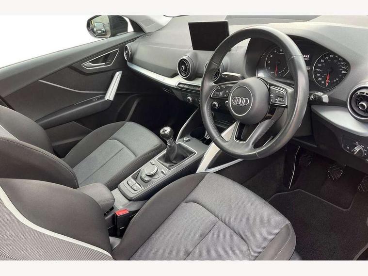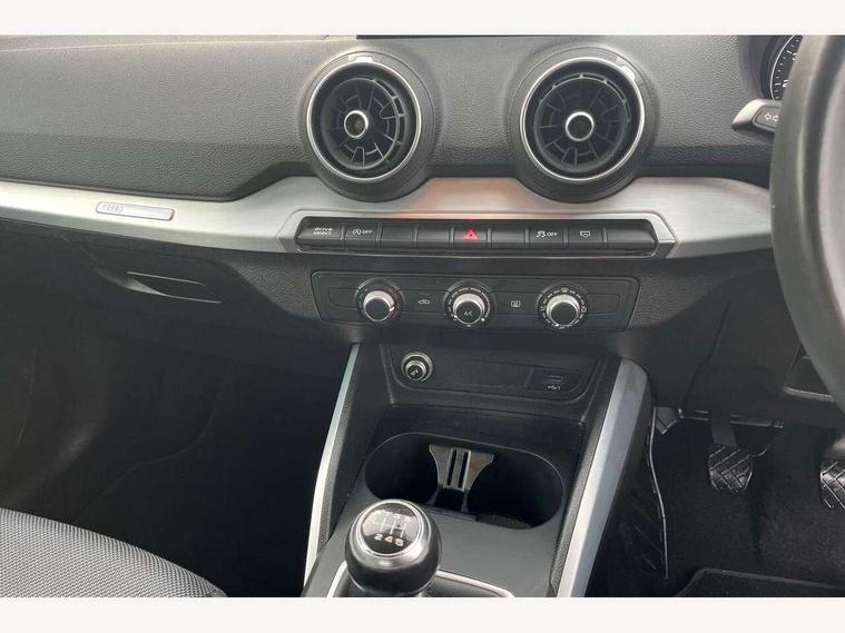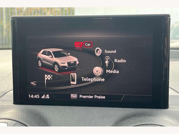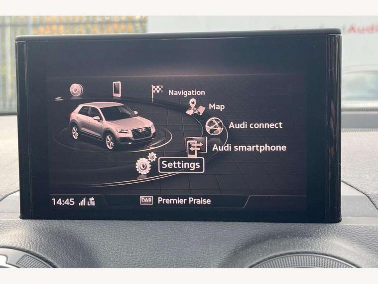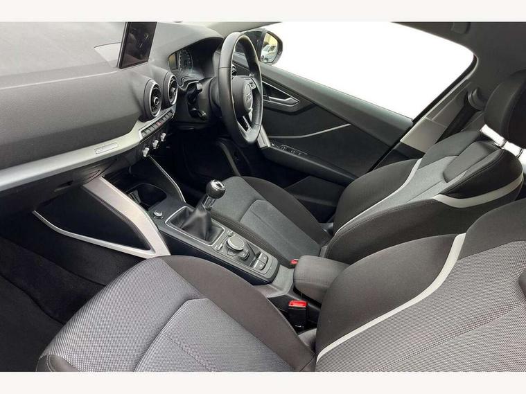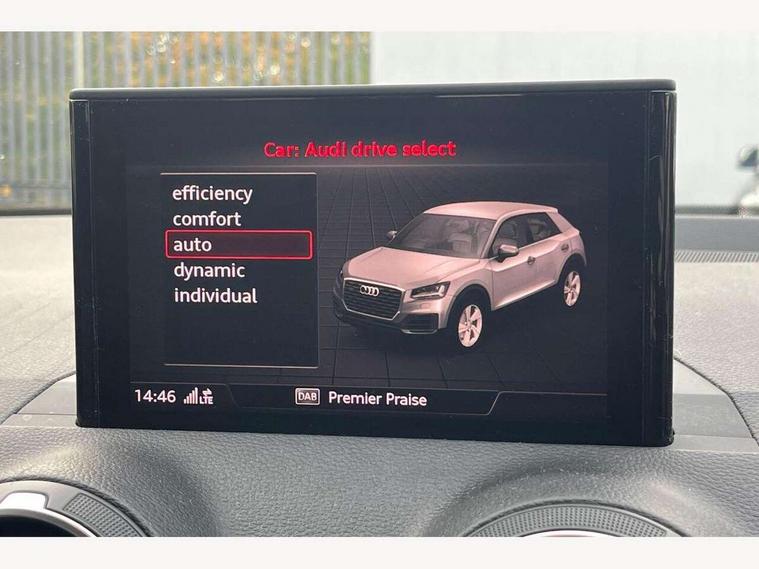 Audi drive select, Audi smartphone interface, Automatic start/stop system with recuperation, Bluetooth interface includes bluetooth audio streaming, Cruise control, MMI - Multi Media Interface control system, MMI SD card integrated nav with 3D map display, dynamic route guidance with TMC, MMI search, natural voice recognition and myAudi special destinations, Power operated tailgate, Progressive steering, Service interval indicator, Dynamic suspension, 2 x SDXC card reader, Audi music interface - apple iPod, apple iPhone, USB storage media, compatible MP3 players, 2 x USB charging points and 1 x Aux-in, CD Drive, DAB digital radio and AM/FM radio, MMI radio plus with 7" colour MMI screen and MMI controller, Air inlet in manhattan grey metallic, Black window trims, Body colour door mirrors, Chrome exhaust tailpipe, Electrically adjustable and heated door mirrors with integrated LED side indicators, Front and rear electric windows, Front underbody guard and rear diffuser trim in selenite silver, Front windscreen with grey tinted sunband, Halogen headlights including headlight range adjustment, High gloss black radiator grille, Interior mirror, LED indicator lights, Manual folding door mirrors, Rain and light sensors, Rear wiper, Side skirts in manhattan grey, Wheel arch trims in manhattan grey, 60/40 split folding rear seat bench, Door sill trims with aluminium inlay, Electronically operated child locks, Front centre armrest, Front headrests, Front sports seats, Front/rear floor mats, Height/reach adjust steering wheel, ISOFIX child seat mounting for front passenger with airbag deactivation and outer rear seat including top tether attachment point for outer rear seats, Manual seat adjustment including seat height adjustment for front seats, Storage compartments - Glovebox, cupholder compartment in centre console, storage compartment in rear centre console, front and rear door pockets, Three rear headrests, Titanium grey cloth headlining, Non smoking pack - Q2, 3x3 point rear seatbelts, 6 airbags - Front, curtain and front side airbags, Electromechanical parking brake, Electronic stabilisation control including ABS, ASR and EDL, Extended and proactive pedestrian protection, Hill hold assist, Multi collision brake assist, Pre-sense front with pedestrian recognition, Seatbelt monitoring, Tyre pressure warning light, Warning triangle and first aid kit, Anti theft alarm, Anti theft wheel bolts, Central locking system with remote control key, Aluminium interior element,