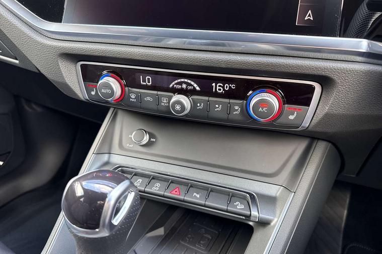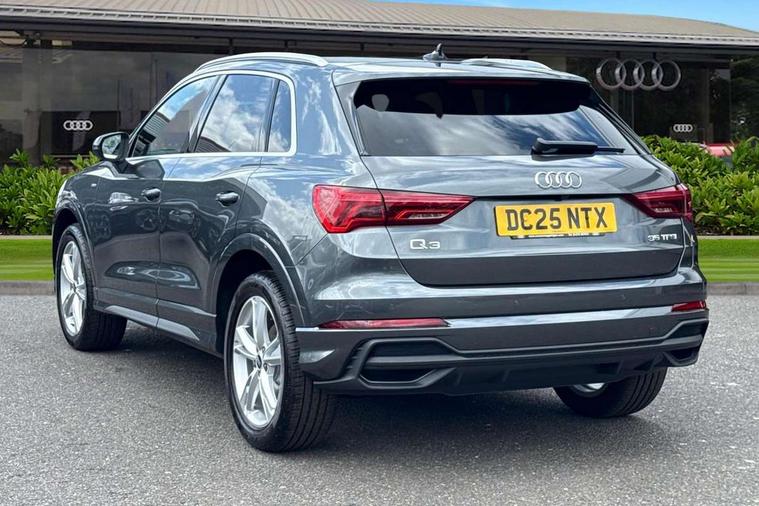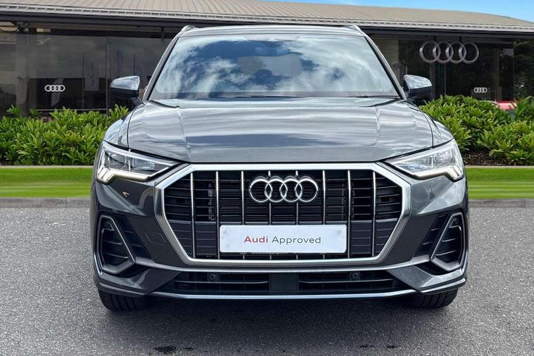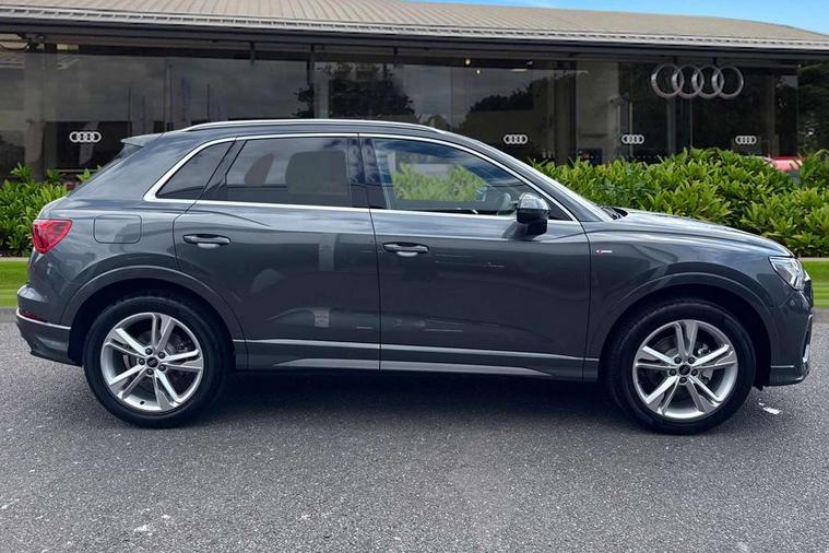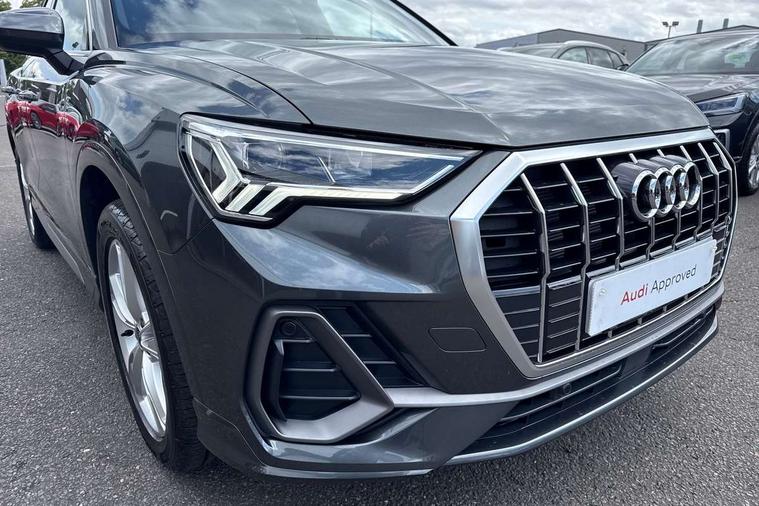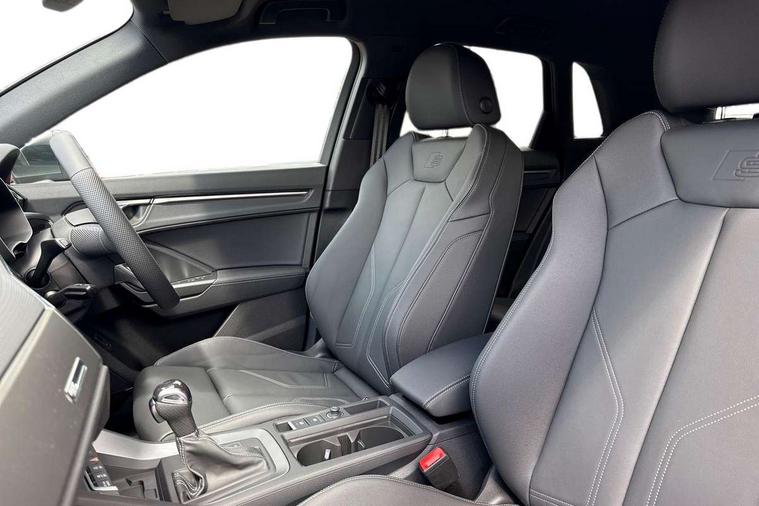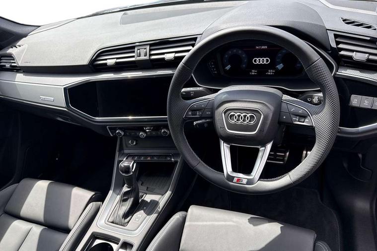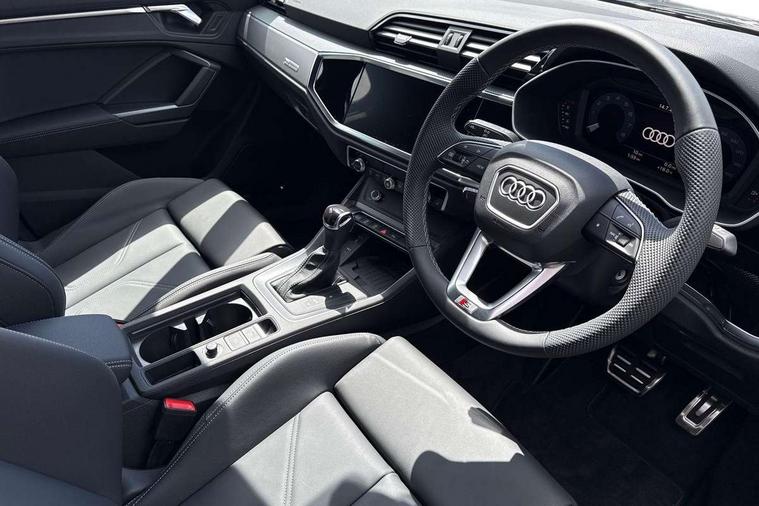 Amazon alexa Integration, Audi connect safety and service, Audi drive select, Audi lane departure warning, Audi Virtual Cockpit - 10.25" display, Bluetooth interface, Camera based traffic sign recognition, Distraction and Fatigue warning, Legal emergency call, MMI Navigation Plus with high resolution 10.1 inch touchscreen colour display, Power operated tailgate, Progressive steering, Service interval indicator, Smartphone interface includes wireless Apple carplay/Android Auto, Start stop system with recuperation, Voice control system with natural language interaction, Sports suspension, 2 USB-C ports with charge and data functions, 6 passive loudspeakers, DAB digital radio module, Acoustic windscreen, Aluminium roof rails, Aluminium window trim, Anthracite black radiator grille, Auto dimming door mirrors, Auto dimming frameless rear view mirror, Body colour front spoiler blade, Electrically folding, adjustable and heated door mirrors with integrated LED side indicators and kerb view function for passenger side, Front and rear electric windows, Front fog lights, Front side air inlets in matt platinum grey, Grille vertical bars in aluminium silver/Matt, High gloss black finish B and C pillars, LED Dynamic rear indicators, LED headlights with LED daytime running lights, LED rear lights, LED third brake light, Privacy glass dark tinted rear and rear-side windows (from B-pillar backwards), Rain and light sensors, Rear diffuser grille in grained matt black, Rear diffuser strip in matt anthracite black, Rear side wing doors, Rear wiper, S line badges on front wings, S Line front and rear bumpers and side skirts, Side skirt insert in matt Platinium grey, Variable front intermittent wipers, 12V socket in rear centre console, 3 seat bench in 2nd row, 3 spoke leather multifunction steering wheel features S badging and grips in perforated leather with contrast stitching, 40:20:40 folding with manual adjustment for 60:40 forwards/backwards position and backrest angle, Adjustable rear seat bench/backrest with centre armrest and cupholder, Black carpet mats, Black cloth headlining, Dual zone electronic climate control, Electric lumbar support, Front and rear black floor mats with contrast stitching in rock grey, Front and rear headrests, Front centre armrest, Height and reach adjustable steering wheel, Horizontal trim strip in matt platinum grey, Illuminated door sill trims with S logo, ISOFIX child seat mounting for front passenger with airbag deactivation and outer rear seat including top tether attachment point for outer rear seats, Luggage compartment sill protection in stainless steel, Manual front seats with height adjustment, Perforated leather gearknob, Single front passenger seat, Stainless steel pedals, Twin leather upholstery with front sport seats + S embossing, Non smoking pack - Q3, 3x3 point rear seatbelts, 6 airbags - Driver, front passenger, curtain and side windows, Audi pre-sense front with pedestrain and cyclist recognition, Electrically operated child locks on rear doors, Electromechanical parking brake, Electronic stabilisation control including ABS, ASR and EDL, Front seatbelt reminder, Hill descent control, Hill hold assist, Pre sense basic, Seatbelt monitoring, Tyre pressure warning, Warning triangle and first aid kit, Anti theft wheel bolts, Immobiliser, Remote central locking, Thatcham approved category 1 anti theft alarm, Aluminium look interior elements, Dark matt brushed aluminium inlay, Detail dashboard around MMI touch colour display in glass look, black with surround in aluminium look, Leatherette door armrest,