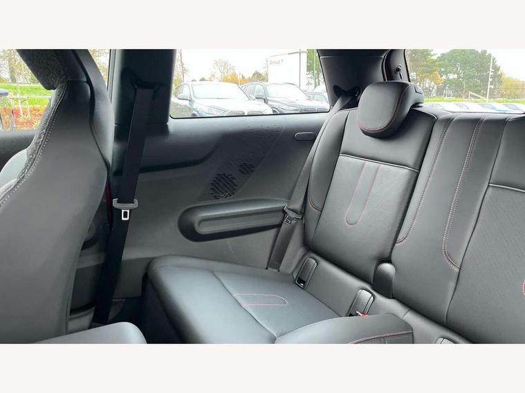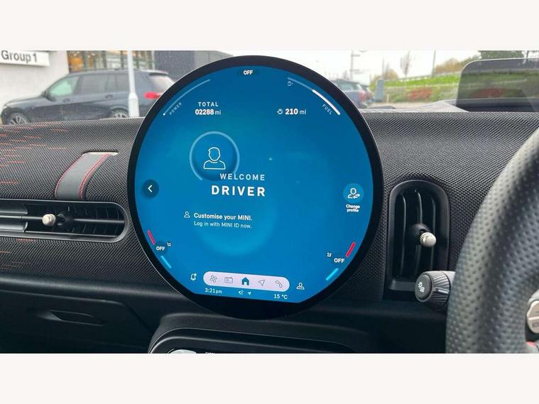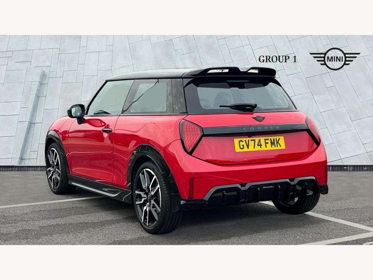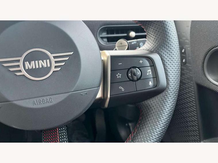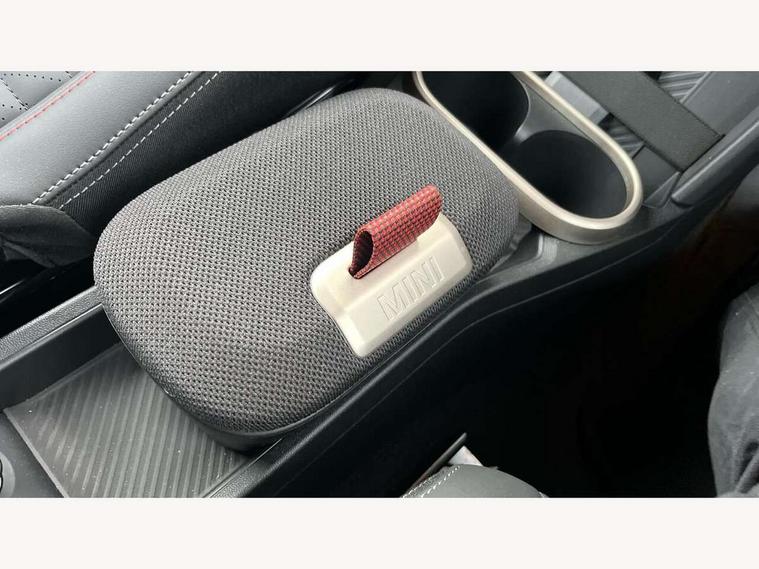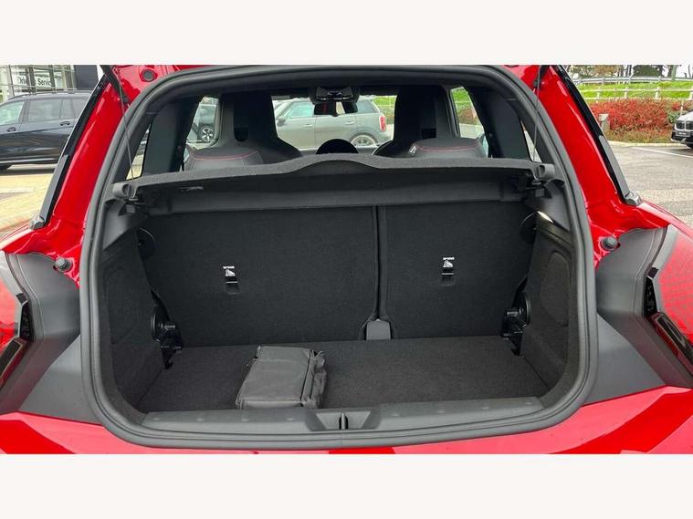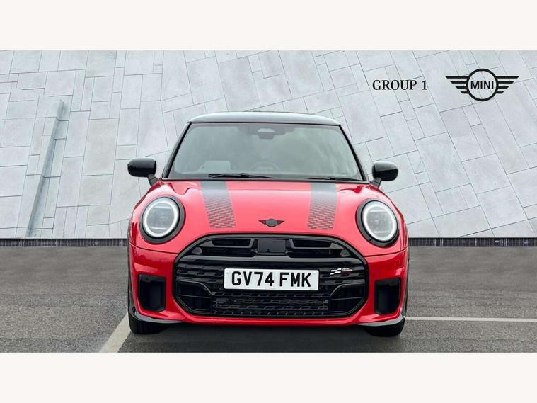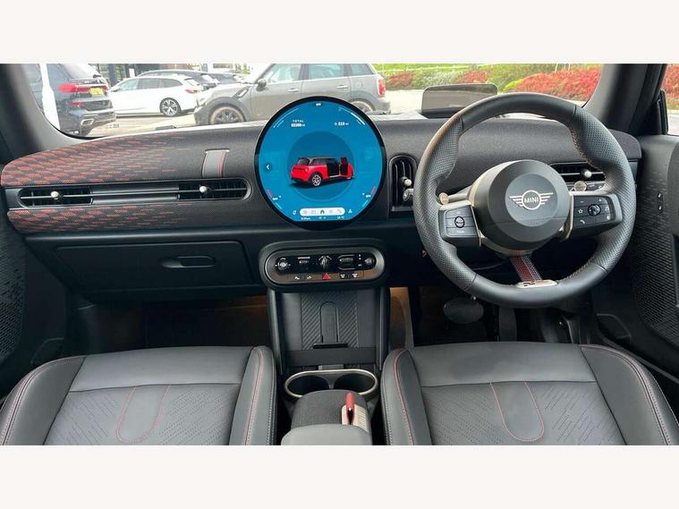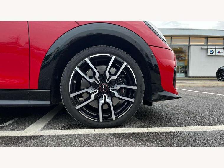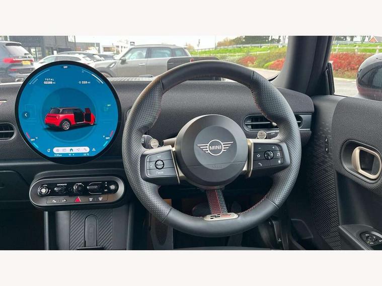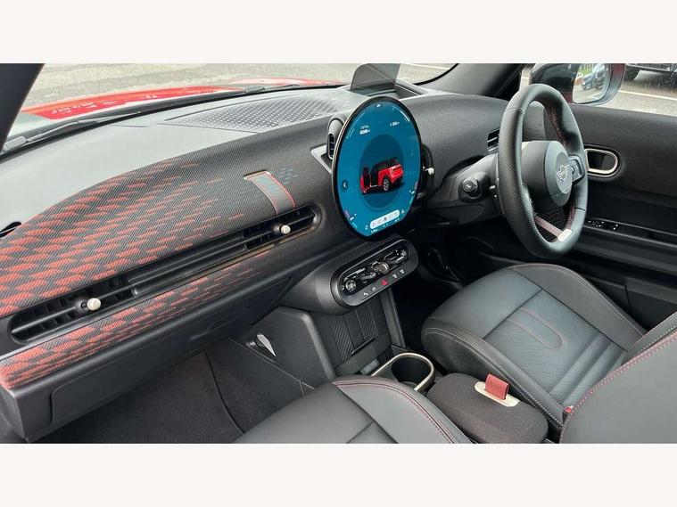 Central toggle bar, Circular OLED Screen, Compatible mobile phone bluetooth with audio streaming, Cruise control, Digital instrument cluster, Electro-mechanical speed dependant steering assistance, Emergency call service, MINI Experience Modes, Mini navigation system, On board computer, Service interval indicator, 7 speed steptronic sport transmission with double clutch, Adaptive suspension, DAB Digital radio, Personal eSim, Auto headlights, Electric adjustable heated door mirrors, Electric front windows, Front and rear apron, Heated rear window, Heated windscreen washer jets, High gloss black wheel arches, High gloss hexagonal patterned grille surround, JCW body kit, LED daytime running lights, LED Headlights, LED indicator lights, LED rear lights, Rain sensor window wipers, Rear fog lights, Rear roof spoiler with airblades, Rear window wiper, 2 seat bench in second row, 2 zone automatic air conditioning, 60/40 rear seat bench, Ambient lighting, Black lower band in high gloss, Cupholders, Dark headliner, Floor mats, Front and rear head restraints, Front compact armrest, Heated steering wheel, Height adjustable passenger seat, Lidded storage box in Black/Red knit, Luggage compartment lighting, Partially perforated vescin steering wheel with red accent, black/red decorative strap, Single front passenger seat, Steering wheel paddle shift, Sunvisors with vanity mirrors, Vescin/Cord upholstery, Driving assistant pack - Cooper Hatchback, Park assistant pack - Cooper Hatchback, 3 point seatbelts on all four seats, 6 Airbags - front, side, head and seat belt tensioners, Acoustic pedestrian protection, Anti-lock braking system (ABS), Brake caliper in Black with JCW badge, DSC - Dynamic Stability Control, Electronic parking brake, Front and rear disc brakes, Front ISOFIX (iSize), Front passenger airbag deactivation, JCW Sport Brakes, Traction control, Tyre pressure monitoring system, Alarm, Immobiliser, Remote central locking, Black/Red decorative dash strap, JCW Black/Red dashboard knit, Tyre repair kit,