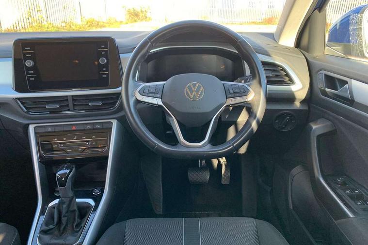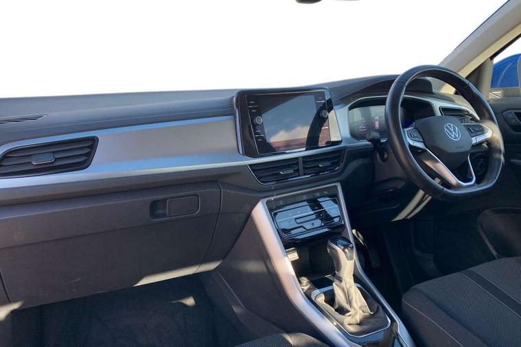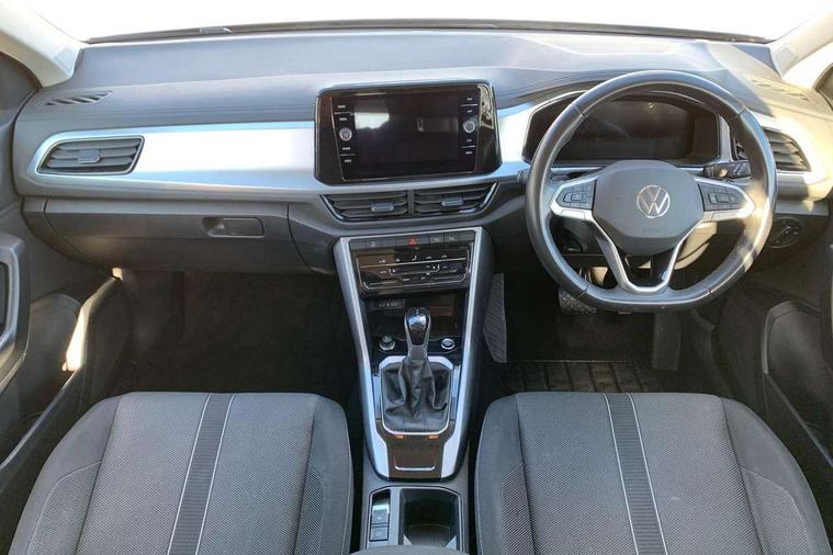 Bluetooth mobile phone interface, Driver alert system with fatigue detection, Driver tips and journey analysis, Emergency call service, Lane keeping system Lane Assist, Modified key software - reduce switch off time for key status change to Long no motion, Online services, Park assist including front and rear parking sensors, Power assisted speed sensitive steering, Service interval indicator, Tailgate/trunk lid release from outside, Think blue trainer driver tips and journey analysis, Warning sound and light for front seatbelts unfastened, Wireless app connect, Battery regeneration during braking, Front shock absorption, Rear shock absorption chassis with increased ride height, Start/stop function with battery regeneration, DAB Digital radio, Diversity antenna for FM reception, Front and rear 6 speakers, Music playback - MP3, WMA and AAC files, Premium USB cable in choice of either Apple or Android smartphone compatibility, SD card slot, Simultaneous pairing of 2 compatible mobile devices, Title and cover art display, We Connect and We Connect Plus functionality, 3rd brake light, Auto dimming interior rear view mirror, Automatic hazard lights activation under emergency braking, Automatic headlight control with LED separate daytime running lights with coming/leaving home function, Black roof rails, Body coloured bumpers and radiator grille with chrome trim and front fog lamps with chrome bezel, Body coloured exterior mirror housings and door handles, Extended roof spoiler, Exterior mirrors aspherical on driver side, convex on front passenger side, External USB type C socket and charging sockets, Front windscreen wiper with intermittent wipe and 4 position delay, Heated rear window, LED Headlights, LED rear combination lamps, LED rear number plate lights, LED tail lamp rear comination lamps, Power windows with comfort operation and circuit breaker, Rain sensor, Rear exhaust tailpipe, Rear fog light on one side and reversing lights on both sides, Rear side wing doors, Rear wash/wipe with intermittent wipe setting, Remote electrically foldable door mirrors, puddle lights and reverse activated passenger's door mirror, 12V power socket in centre console, 3 rear head restraints, 3 seat bench in 2nd row, 4 load lashing points in luggage compartment, Air care climatronic air conditoning system with active combination filter and 2-zone temperature control, Ambient lighting with mirror logo projection, Cloth upholstery, Door and side trim panel in cloth, Drawer under drivers seat, Driver/front passenger seat height adjustment, Front centre armrest, Front comfort sports seats, Front cupholders x 2, Front reading light, Instrument lighting, white adjustable panel illumination, Interior light delay, Isofix child seat preparation, Leather gearshift handle, Load-through provision with cup holder when folded down ('Unsplit rear seat bench, split folding backrest, with centre armrest), Luggage compartment lighting, Lumbar support for driver's and front passengers seat, Non-folding front passenger seat backrest, Single front passenger seat, Storage compartment in left and right luggage area, Storage compartment in rear doors, Storage compartments in driver and front passenger doors, Sunvisors with illuminated vanity mirrors, Variable boot floor, height adjustable and removable, Driver assistance pack without proactive passenger protection - T-Roc, 3 point height adj front seatbelts + pretensioners, 3 point seatbelts in outer rear with ECE label, ABS, Child locks on rear doors, Driver and front passenger airbag with front passenger airbag deactivation, Driver and front passenger safety-optimised head restraints, Drivers seatbelt reminder, Electronic parking brake, Electronic Stability Control (ESC) inc EDL (Electronic Differential Lock) and ASR (Traction Control), Front and rear passengers curtain airbag system including front side airbags, Front assist with city emergency braking and pedestrian monitoring, Front disc brakes, Front seat side impact airbags, Hill start assist, Predictive pedestrian protection, Rear disc brakes, Single tone horn, Tyre pressure loss indicator, Volkswagen roadside assistance, Alarm with interior protection, Anti-theft alarm system with interior monitoring, backup horn, and towing protection, Remote central locking with SAFELOCK, radio remote control with 2 remote control folding keys, Pewter matt decorative inserts for intrument panel, centre console and door panels at the front, Trims for alloy wheels,