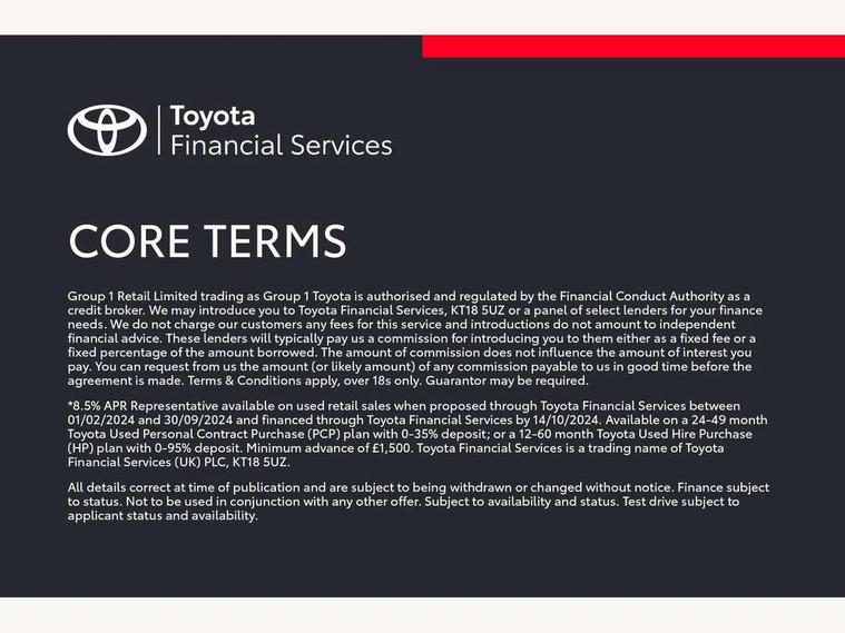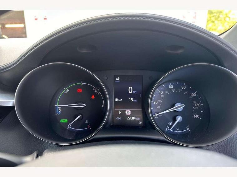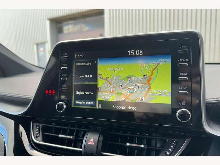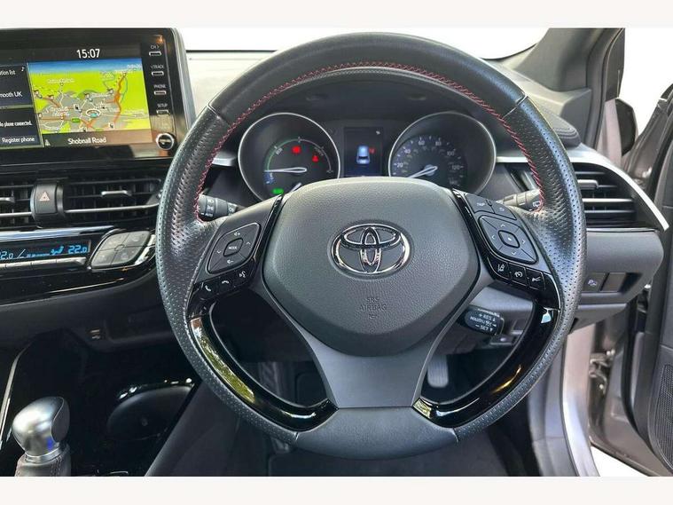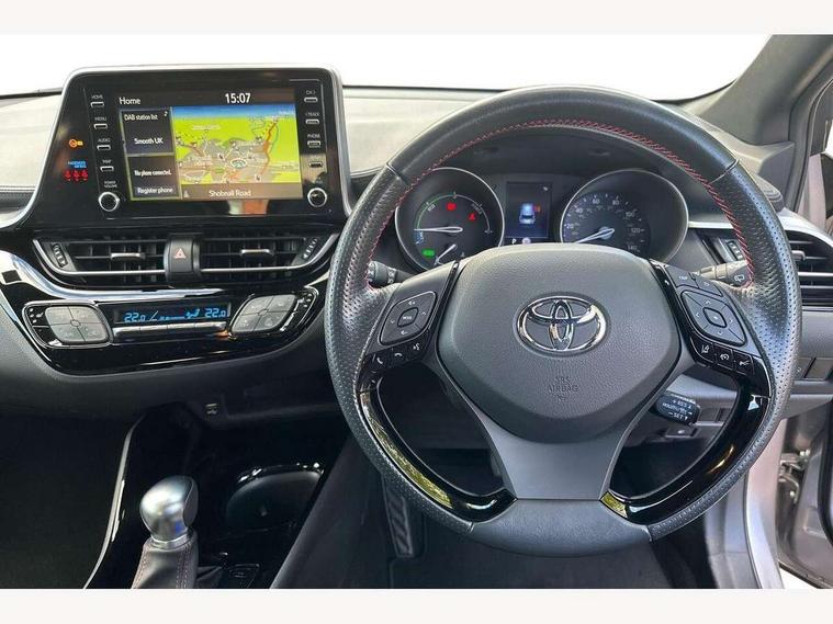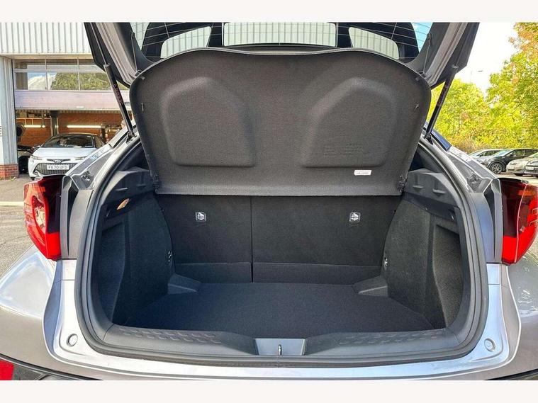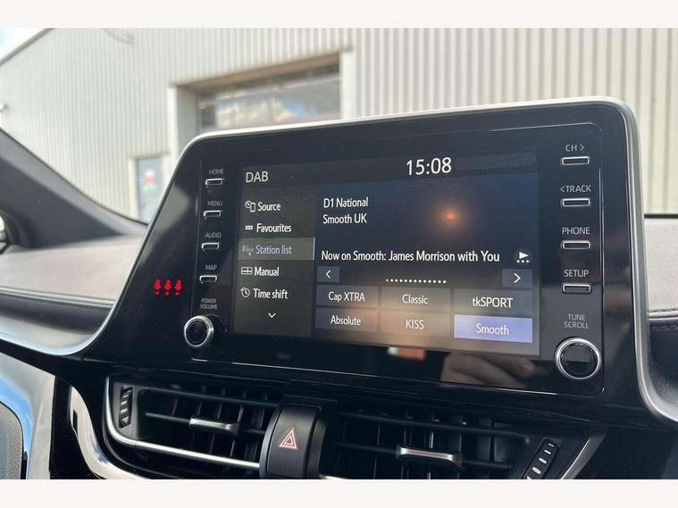 4.2" coloured TFT screen for multi-information display, Adaptive cruise control, Bluetooth connectivity, Electric power steering, Hybrid system indicator, Lane departure alert with steering control, Remote boot door release in cabin, Remote boot door release in key, Reversing camera, Road sign assist - RSA, Simple Intelligent parking assist, Touch 2 Go navigation system, Trip computer, Voice recognition, Vehicle Stability Control (VSC), 6 speakers, AM/FM radio, DAB Radio (Digital Audio Broadcasting), Toyota touch 2 multimedia system with 8" display, USB connector, Wi-fi connectivity, Adaptive front light system, Adaptive LED Headlights, Anti-jam protection on power windows, Auto high beam, Auto up and down function on all power windows, Automatic headlight levelling, Automatic headlights, Automatic headlights cut-off, Black and body coloured rear bumper, Black upper front grille, Body colour door handles, Body colour door mirrors, Body coloured front bumper, Boot door release with push button, Chrome front lower bumper, Electric heated door mirrors, Follow me home headlights, Front and rear power windows, Front spoiler lip in black, Honeycomb lower front grille, LED daytime running lights, LED fog lights, LED front light guide, LED High mounted stop light, LED rear brake lights, LED rear combination lights, Noise reduction layer on front windows and windscreen, Power adjustable door mirrors, Privacy glass, Rear sequential indicators, Rear spoiler, Rear tailgate, Rear window defogger, Rear window wiper, Shark fin antenna, UV-filter on driver and passenger windows, UV-filter on rear windows, 12v power outlet - front, 3 rear headrests, 3 spoke perforated leather steering wheel, 60/40 split folding rear seat, Adjustable rear headrests, Adjustable speed limiter switch on steering wheel, Assist grips front and centre pillar, Audio and telephone switches on steering wheel, Black front door assist grips, Blue ambient lighting on front cup holders, Blue ambient lighting on front doors, Boot light, Chrome interior door handles, Driver and front passenger personal light, Driver and front passenger Whiplash Injury Lessening seats, Driver and passenger seatback pockets, Dual zone automatic air conditioning, Fabric upholstery, Floor mats, Front cupholders, Front head restraints, Front sports seats, Glovebox with internal light, Hard tonneau cover, Heated driver and front passenger seats, Hooks for luggage holding net, Humidifying Nanoe air purifier, Illuminated entry system, Isofix attachments on outer rear seats, Leather gearshift, Light on driver sun visor, Light on passenger sun visor, Manual telescopic steering wheel, Manual tilt steering wheel, Manually height adjustable driver seat, Manually height adjustable front passenger seat, Manually reclining driver seat, Manually reclining front passenger seat, Manually sliding driver seat, Manually sliding front passenger seat, Microphone on front personal light, Mirror on driver sun visor, Mirror on passenger sun visor, Multimedia switches on steering wheel, Pollen filter, Power adjustable lumbar support on driver seat, Shopping bag hooks, Slow opening on lower glovebox, Voice recognition switch on steering wheel, Tech with parking sensor pack - C-HR, 16 Disk front wheel brake, 3x3 point rear seatbelts, ABS+EBD+Brake assist, Electronic parking brake, Front and rear seatbelt reminder, Front passenger airbag on/off switch, Hill start assist control (HAC), Pre collision system with pedestrian detection, Pre-tensioners and force limiters, Rear door child safety locks, SRS Airbags - Driver + Front passenger, front side, front and rear curtain and driver's knee airbags, Toyota safety sense, Tyre pressure monitoring system, Acoustic vehicle alert system (AVAS), Glass-breaking alarm sensors, Immobiliser, Intrusion alarm, Intrusion sensor, Motion sensor alarm, Power door locks, Power passenger window lock, Remote central locking, Black lower dashboard, Black upper dashboard, Piano black console, Silver deco line on upper dashboard, 19" Black machined alloy wheels, Tyre repair kit,