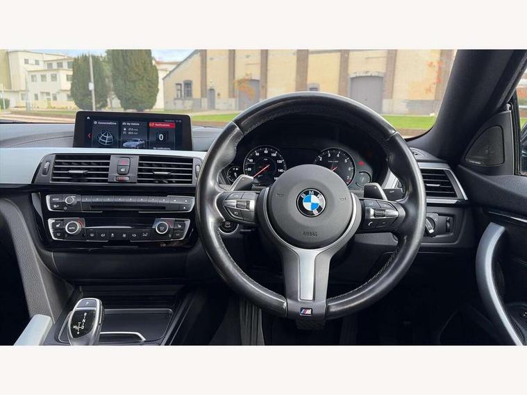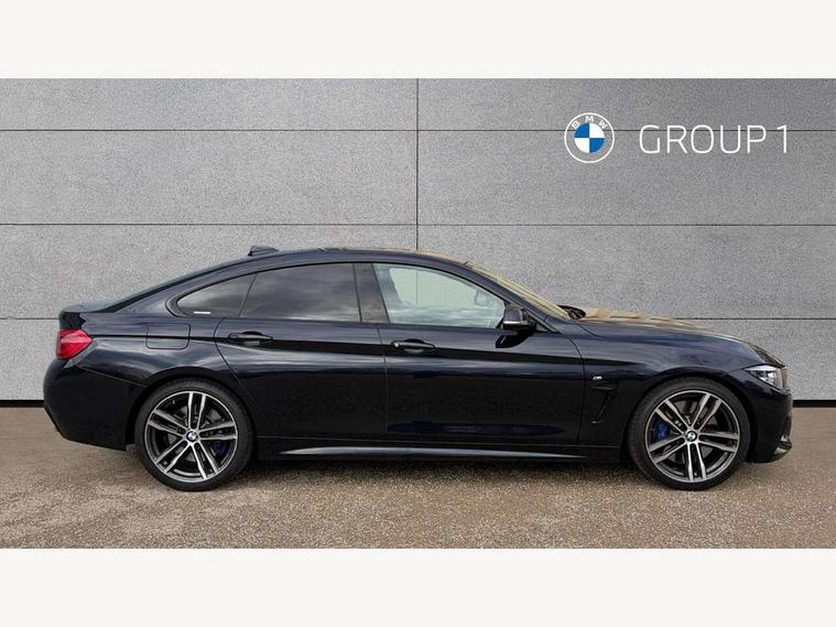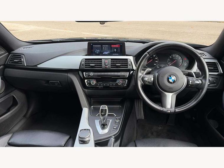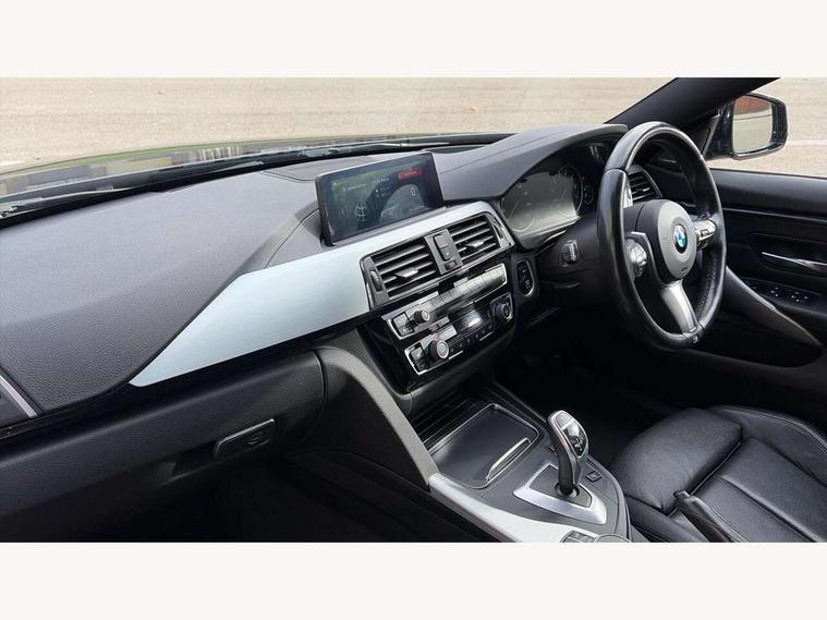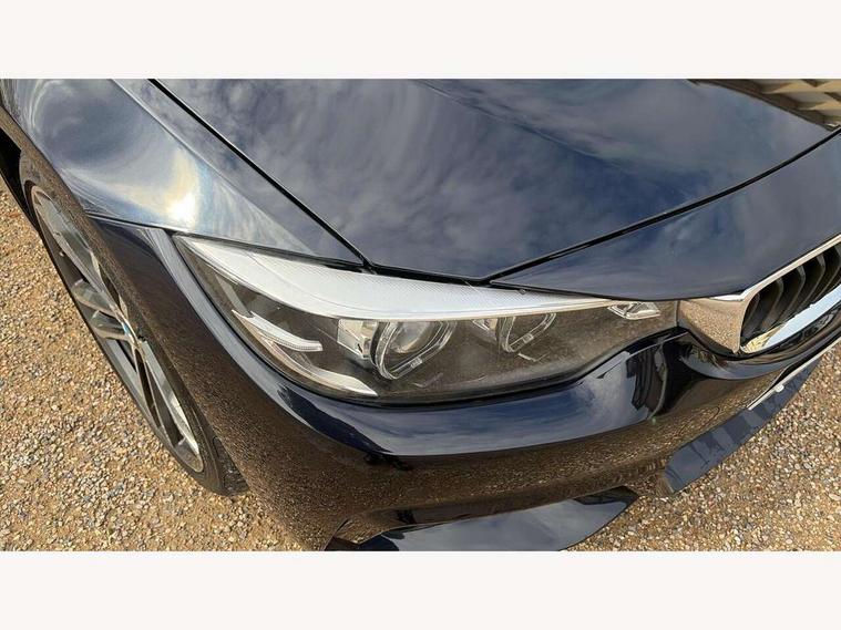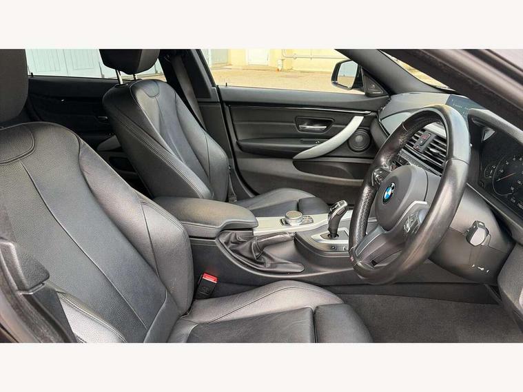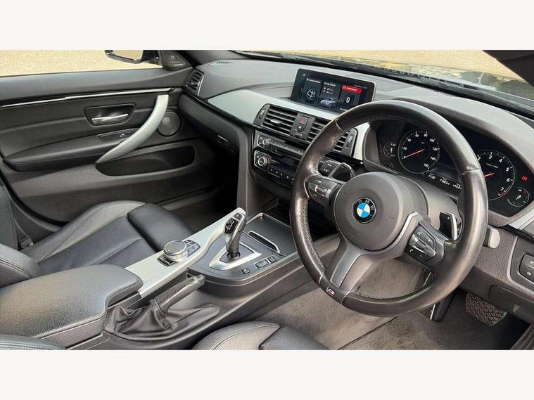 Auto start-stop, Automatic tailgate operation, BMW Online services, BMW remote services, BMW Teleservices, Brake pad wear indicator warning light, Check Control warning system for monitoring of lights and door/luggage compartment open warning, Control display - 6.5" colour display screen, Front/rear park distance control (PDC), iDrive Controller with 8 favourite buttons, Instrument cluster with speedometer with mph readout, tachometer, fuel gauge and oil temperature gauge, Lights on warning by audio warning signal when ignition is switched off, M Sport instrument cluster, Oil sensor for level and grade, warning by check control system, On board computer - average speed, fuel consumption, outside temp display with acoustic warning, clock/date, service interval, odometer/trip meter, Optimum shift indicator, Personal Profile - automatic lock when driving away selectable, Run flat indicator, Aluminium front suspension, Drive performance control with ECO PRO comfort + sport mode, Electronic differential lock, Five link rear suspension, Incorrect fuelling protection, Sport automatic transmission with steering-wheel mounted gearshift paddles and launch control, DAB tuner, Auto dimming rear view mirror, Body colour door handles, Body colour front bumper, Body colour mirror caps, Body colour roof mouldings, Chrome kidney grille with extra wide black, high gloss black vertical slats, Direction indicator, side repeaters, integrated in exterior mirrors, Door sill finishers with M designation, Dual exhaust tailpipes in left with chrome finisher, Dynamic brake lights, Electric front windows with fingertip open/close + anti-trap facility, Follow me home headlights, Front air inlet with high gloss black finish, Front and rear bumper system, Green tinted heat protection glazing, Heated windscreen washer jets, Heated, electrically adjustable exterior mirror aspheric on driver side, convex on passenger side, High gloss black rear bumper insert, High gloss shadow line, High level third brake light, LED daytime running lights, LED direction indicator lenses, LED eyebrow light, LED front fog lights, LED tail lights with 3D L-shaped LED light design, Lightweight engineering, M aerodynamic bodystyling, M designation side badges, Rain sensor including auto headlights activation, Shark fin antenna, Two speed adjustable intervals windscreen wipers, Visible VIN plate, Welcome lighting, Windscreen with grey shadeband, 12V sockets in front centre console and passenger footwell, 2 Rear seat headrests, 3 spoke leather M sport multifunction sports steering wheel, 4 grab handles, Air conditioning and radio control panel in high gloss black, Anthracite headlining, Automatic air conditioning with two zone control, Chrome centre console panel highlight, Driver and front passenger seat heating, Folding front centre armrest with storage compartment, Folding storage compartment with glasses holder + coin tray, Front and rear side armrests integrated into door trim, Front door storage with bottle holder, Front head restraints, Front sports seats with electric side bolster adjustment, Glove compartment, Glove compartment opener with chrome trim, Interior lighting, front centre over interior mirror and rear centre automatic interior light activation when door is opened, ISOFIX child seat preparation+airbag deactivation, Leather gearknob and handbrake lever, Load lashing eyes in luggage compartment, Reach + rake adjustable steering column, Rear centre armrest with 2 cupholders, Rear coded belt buckles, Storage compartment in rear centre console, Sunvisors with vanity mirrors and ticket pocket, Toolkit located in luggage compartment, Two front cup holders with a sliding lid, Velour floor mats, Extended lighting package - 4 Series Gran coupe, Media pack - Professional - 4 Series M Sport, Airbag - Front driver and passenger, front and rear head, front side, curtain head protection, manual deactivation of front passenger airbag possible, Anti lock braking system (ABS) with brake assist, Automatic Stability Control (ASC), Battery safety cut-off, BMW emergency call, Brake drying, Brake energy regeneration, Brake pretensioning, Cornering brake control (CBC), Crash sensor activating central locking release, hazard warning lights, Dynamic brake control, Dynamic stability control + (DSC+), Dynamic Traction Control - DTC, Front and rear ventilated brake disc, Front seatbelt force limiters, Hill start assistant, Pyrotechnically pre-tensioned front seatbelts, Seat belt security check for driver, Side impact protection, Twin horns, Tyre pressure monitoring with three level warning strategy, Variable torque distribution, Warning triangle and first aid kit, Central locking switch for all doors, fuel filler cap and luggage compartment, Electronic engine immobiliser, Remote control integrated key with blue inset, Start/stop button with Comfort Go keyless engine start and auto Start/stop deactivation button, Thatcham category 1 alarm, Reduced rolling resistance tyres, Run flat tyres,