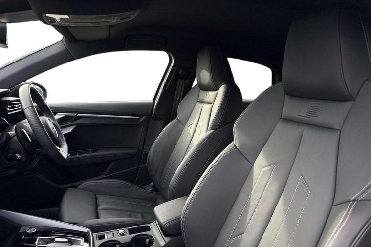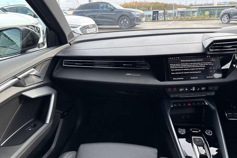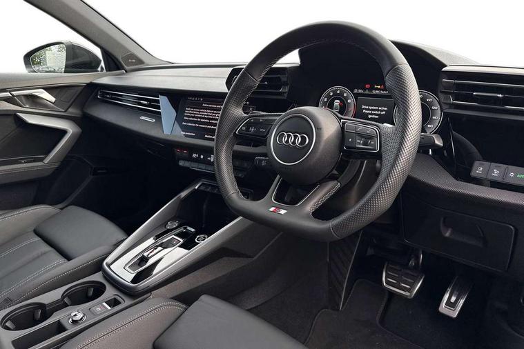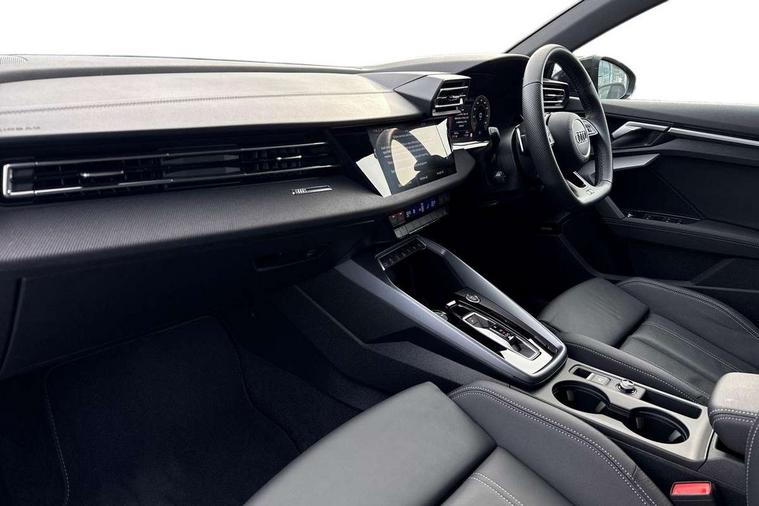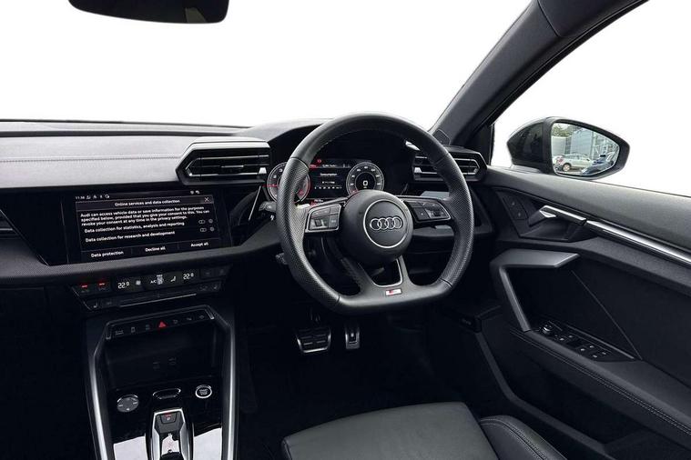 Adjustable speed limiter, Audi drive select, Audi smartphone interface with app store includes wireless Apple carplay, Android auto and Amazon alexa integration, Audi virtual cockpit plus - 12.3" full HD resolution dynamic digital instrument cluster, Automatic start/stop system with recuperation, Bluetooth interface, Camera based traffic sign recognition, Collision avoidance assistant, Cruise control, Distraction and Fatigue warning, e-Call (emergency call), Electromechanical power speed sensitive steering, Lane departure warning system, MMI Navigation Plus with high resolution 10.1" colour touch screen display, Park Assist with parking system Plus, Service indicator, Trip computer, Voice control system with natural language interaction, Sports suspension, Audi Phonebox light with wireless charging, Audi sound system - 10 loudspeakers including centre loudspeaker and subwoofer, DAB Digital radio, USB ports with charging function in the rear, Acoustic glass windscreen, Anthracite grey Audi rings (front and rear), Audi beam uses LEDs to project the Audi logo onto the ground as you exit your A3, Auto dimming frameless rear view mirror, Black accents front and rear bumpers, Black accents in the area of the Audi single frame grille, Black accents window trims strips, Electrically adjustable/heated/folding/auto dimming door mirrors with integrated LED indications + kerb view function for passenger side, Exterior model badging, Front electric windows, Heat insulating glass windscreen, Illuminated door sills with aluminium inserts at the front with S logo, LED 3rd brake light, LED daytime running lights, LED headlights with LED rear lights and dynamic rear indicators, Light and rain sensors, Privacy glass - dark tinted rear window, rear door and side windows, Rear boot, Rear electric windows, Rear side wing doors, 12V socket and storage compartment in front centre console, 3 seat bench in 2nd row, 3 spoke flat bottomed leather multifunction sport steering wheel with gear shift paddles, 3-zone deluxe automatic air conditioning, 4 way electrically adjustable lumbar support for driver and front passenger, 40/20/40 split folding rear seat bench, Black cloth headlining, Front and rear centre armrest in artificial leather, Front and rear centre armrest in artificial leather with contrasting stitching on armrests and instrument panel, Front and rear headrests, Front/rear floor mats, Heated front seats, Height and reach adjustable steering wheel, Manual boot compartment lid, Manually adjustable front seats, Rear cup holders, S badging on the steering wheel, Seat side bolsters, Single front passenger seat, Stainless steel pedals and front footrest in black, Twin leather upholstery with front sports seats S embossed logo, Aluminium interior elements pack - A3, Multi-coloured LED interior lighting package - A3 Black Edition, 3x3 point rear seat belts, Driver and front passenger airbag with passenger airbag deactivation, Electronic Stabilisation Control (ESC) including ABS, ASR and EDL, First aid kit with warning triangle and 2 safety vests, Front side airbags with head airbags and interaction airbag, Hill hold assist, Pre-sense front with pedestrian and cyclist detection, Seatbelt monitoring, Tyre pressure loss indicator, Anti theft alarm, Anti-theft wheel bolts, Electronically operated child locks, Immobiliser, Remote central locking with safelock, Inlays in black Impressum woven textile,