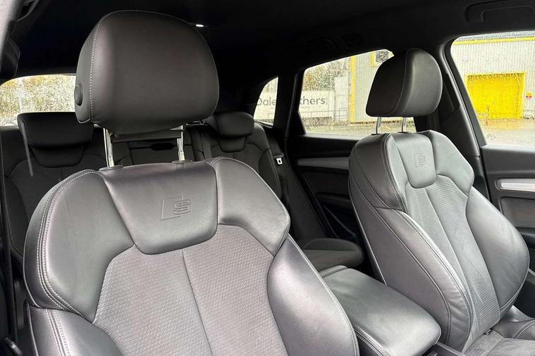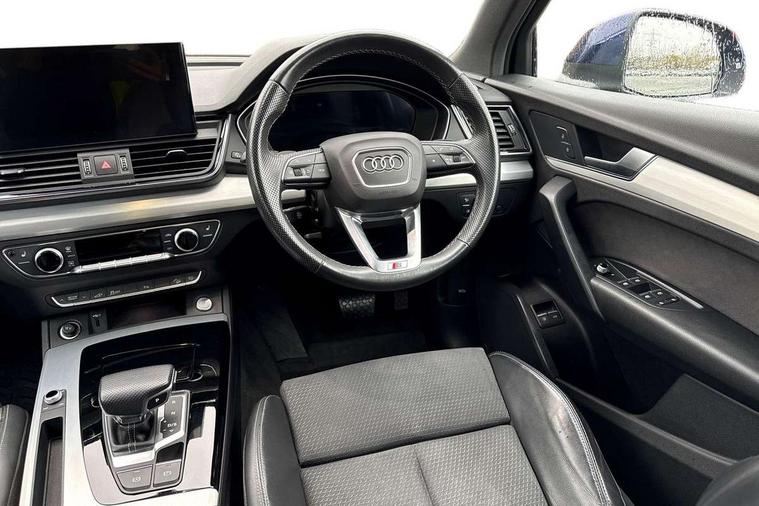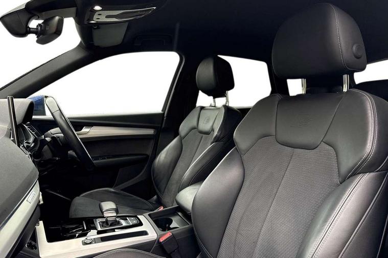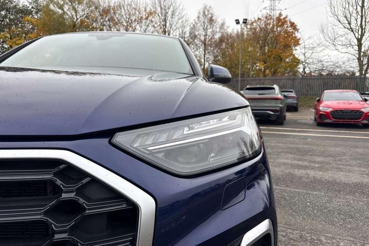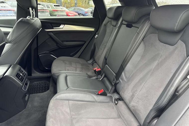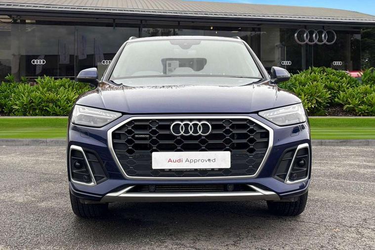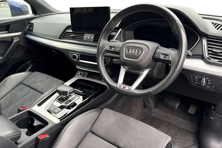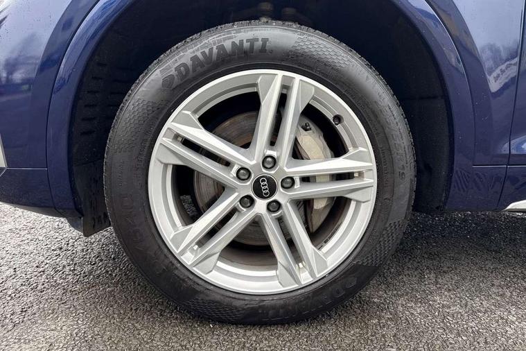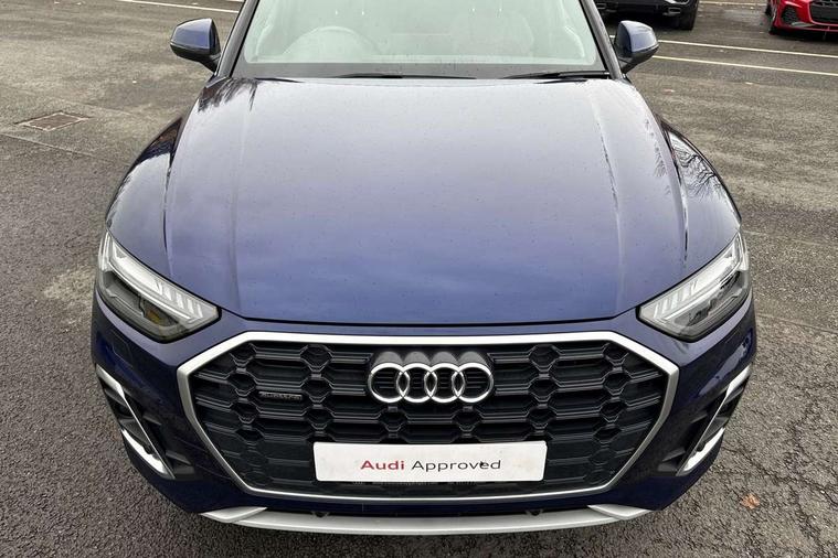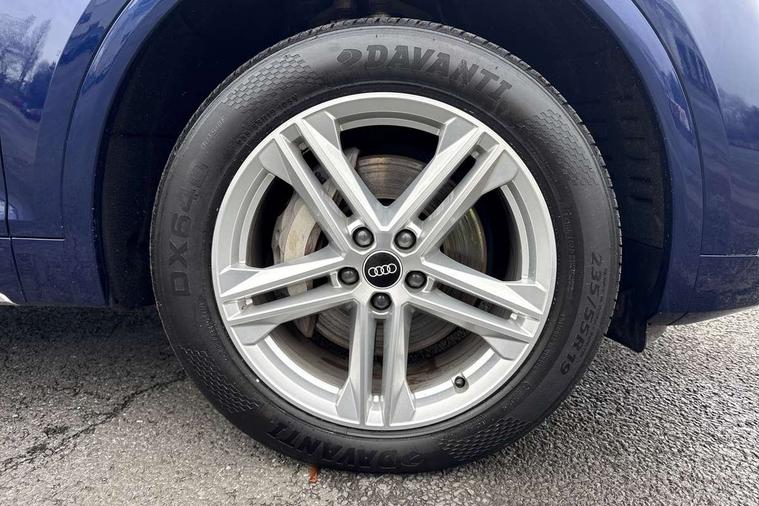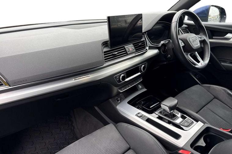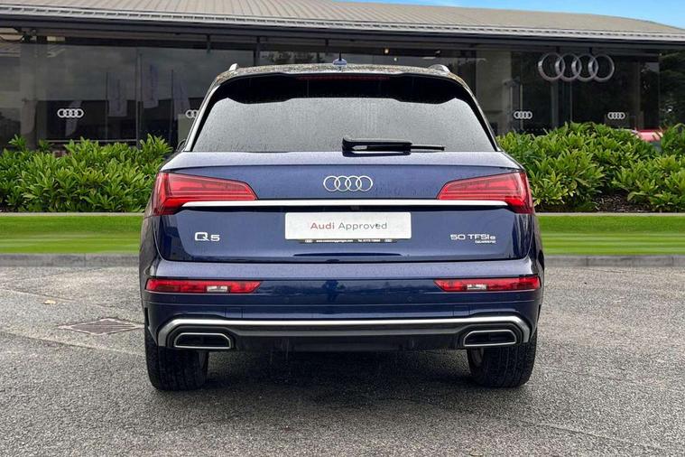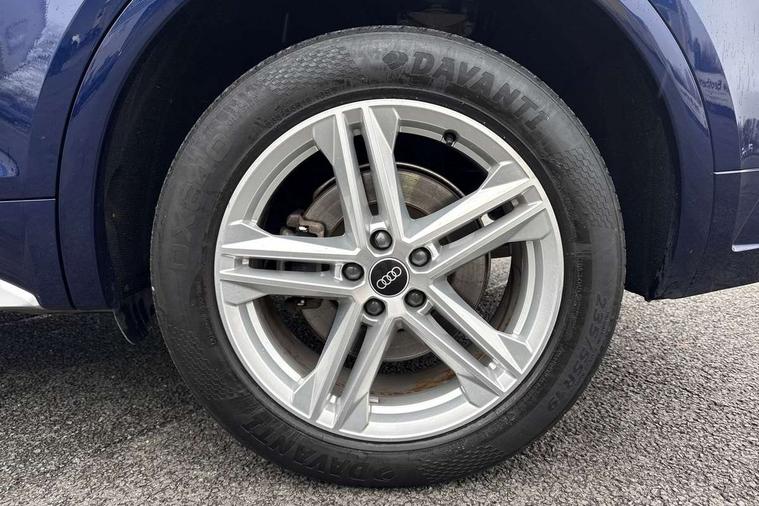 Audi connect safety and service (e-call), Audi connect with Amazon Alexa Integration, Audi drive select, Audi virtual cockpit plus with 12.3" screen and three different layout designs, Audi wireless smartphone interface, Automatic start-stop system with coasting functionality and efficiency programme, Bluetooth interface, Electro - mechanical power assisted steering, MMI navigation plus with 10.1" touch screen, Power tailgate, Reversing camera, Service interval indicator, Voice control system with Audi hotword activation "Hey Audi", 3 pin 10 amp domestic charging cable, Dynamic suspension, Quattro on demand, Type 2 mode 3 22kW 32 amp charging cable, Type 2 socket for AC charging, 2 x USB charging port with aux input socket, DAB Digital radio, Acoustic windscreen, Aluminium roof rails, Audi matrix LED headlights with dynamic front and rear indicators, Auto dimming rear view mirror, Automatic headlights and windscreen wipers, Body colour bumpers, Body colour door mirrors, Body colour rear diffuser with matt aluminium silver surrounds, Body colour underbody protection, Chrome plated exhaust trims, Door sills in Selenite silver, Electric adjustable/heated/folding door mirrors, Front air inlet surrounds in aluminium, Front and rear electric windows, Front radiator grille in honeycomb design, Headlight washers, Lower bumpers painted in contrast Manhattan grey, Rear chrome trim strip below lights, Rear privacy glass and rear side windows, Rear spoiler, Rear wiper, Roof bars, S Line badges on the front wings, S Line front and rear bumpers, S Line side skirts, 3 rear headrests, 40:20:40 split folding rear seat with rear centre armrest, Black cloth headlining, Comfort front centre armrest, Contrast stitching on seats, steering wheel and gear lever gaiter, Deluxe 3 zone electronic climate control, Front/rear floor mats, Gear lever in black leather, Heated front seats, Height adjustable front head restraints, Height/reach adjustable steering column, Illuminated door sill trims with S logo, ISOFIX child seat mounting and top tether, Manual seat adjustment with 4-way electric lumbar support, Rear seat bench plus, Sunvisors with vanity mirrors, Trunk roller cover, High gloss pack - Q5, LED interior light pack - Q5, 3 point seatbelts on all seats, 6 airbags - Driver, front passenger, curtain and side airbags, Electrically operated child locks on rear doors, Electromechanical parking brake, Electronic stabilisation control including ABS, ASR and EDL, Front passenger airbag deactivation, Hill descent control, Hill hold assist, Multi collision brake assist, Pop-up bonnet for pedestrian protection, Pre sense city, Seat belt force limiter, Seatbelt monitoring, Tyre pressure warning, Warning triangle and first aid kit, Anti theft alarm, Anti-theft wheel bolts, Keyless Go access/ignition system, Matt brushed aluminium inlays, Tool kit, Tyre repair kit,