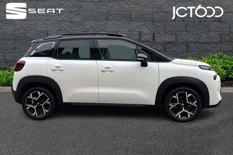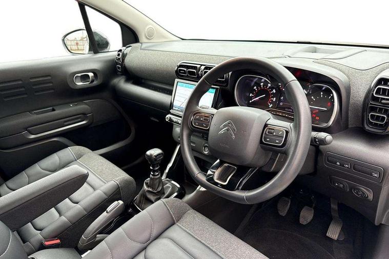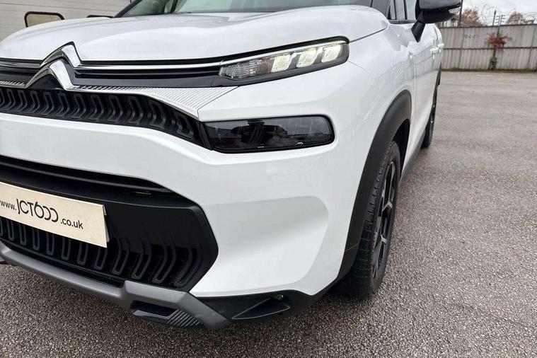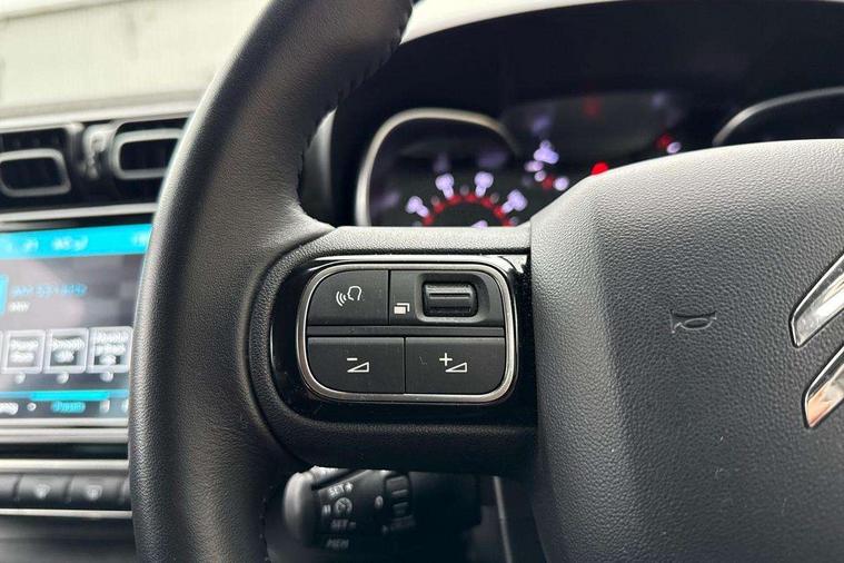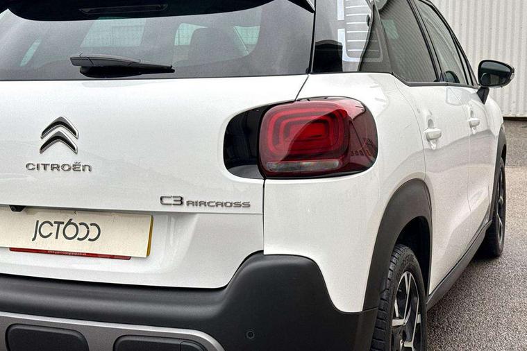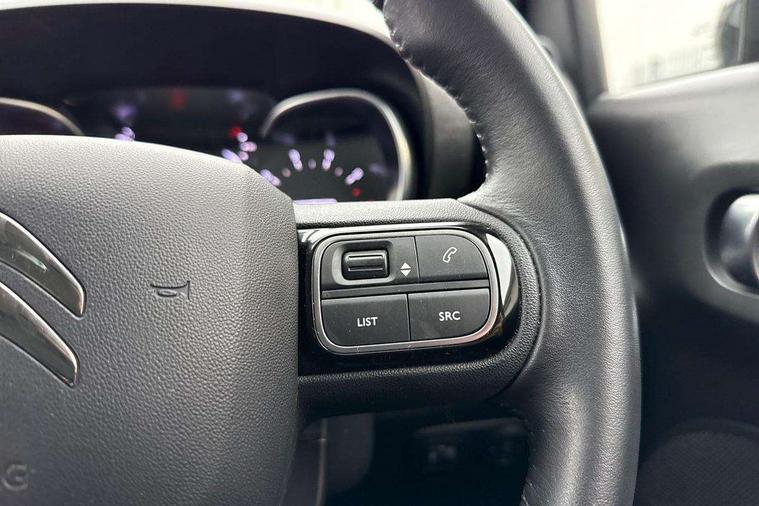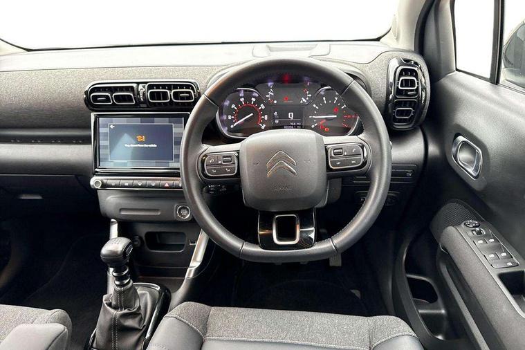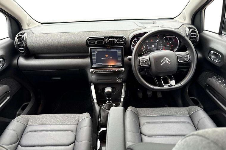 3.5" head up display, 9" Touchscreen display, Citroen connect box emergency and assistance system, Citroen Connect Nav with 3D navigation, Coffee Break Alert, Cruise control with speed limiter, Driver instrument cluster including trip computer and rev counter with white text LCD display and white needles and chrome decor, eCall emergency call system, Engine start button, Lane departure warning system, Mirror screen with Apple CarPlay and Android auto, Outside temperature sensor, Rear parking sensors, Tailgate, Top rear vision reversing camera, Traffic signs and speed limit recognition and recommendation, Variable assistance power steering, Voice recognition for radio, navigation and telephone features, Bluetooth hands free and media streaming with USB socket, Citroen connected DAB radio with 6 speakers, Steering wheel mounted controls for stereo and telephone, 3D effect LED rear lights, Automatic Eco LED headlights, Automatic lights and windscreen wipers, Black roof bars, Body colour painted door handles, Chrome chevrons front grille, Electric front windows + one touch + anti-pinch, Electric rear windows with one touch/anti-pinch, Electrically adjustable door mirrors, Electrically folding door mirrors, Electrochrome rear view mirror, Fog lights integrated into front bumper, Front and rear body coloured bumpers, Heated door mirrors, Integrated roof spoiler, LED daytime running lights, LED third brake light, Rear side wing doors, Rear wiper, Roof aerial, Tinted rear windows and rear quarterpanel glass, Variable front intermittent wipers, 12V socket in front, 12V socket in rear of vehicle, 60/40 split folding rear seats with sliding rear bench, centre armrest and ski flap, Automatic air conditioning, Boot light, Brasilia leather effect and flecked cloth upholstery with metropolitan graphite ambience, advanced comfort seats and wrapped dashboard, Central adjustable armrest on drivers seat, Centre console with closed storage and chrome insert, Driver and front passenger cup holders, Driver and passenger sunvisor with courtesy mirror, Flex load/Pull out boot floor, Front and rear courtesy reading lights, Front and rear door storage, Front head restraints, Front passengers seat flat folding, Glovebox with closable lid, Height adjustable driver's seat, Height and reach adjustable steering wheel, Leather steering wheel with satin chrome inserts and radio controls, Manual handbrake with chrome insert, Passenger compartment headlight adjustment, Rear isofix mounting points (outside seats) with top tether, Row 2 - Three seats with individually adjustable head rests, Satin chrome interior door handles, Single front passenger seat, Gloss black colour pack - C3 Aircross Max, 3 point, height adjustable, pre tensioned front seatbelts, ABS with Electronic brakeforce distribution and Emergency braking assistance, Active safety brake including Forward collision warning, Automatic illumination of hazard warning lights, Curtain airbags, Driver airbag, Drivers/passengers and rear seats unfastened seat belt warning, ESC (Electronic Stability Control), Front lateral airbags, Front passenger airbag, Front passenger airbag deactivation switch, Hill start assist function, Mono-tone horn, Rear door child safety locks, Three 3 point rear seatbelts, Tyre pressure monitor, Automatic door and boot locking when moving off with automatic unlocking in case of impact, Automatic locking of the vehicle (after 30 seconds if door or boot unopened), Immobiliser, Keyless entry and keyless start, Perimetric and volumetric anti theft alarm, Remote central locking + deadlocks, Vehicle locater function (headlights illuminate when button on key pressed), Gloss black centre console, Satin chrome air vent decors,
