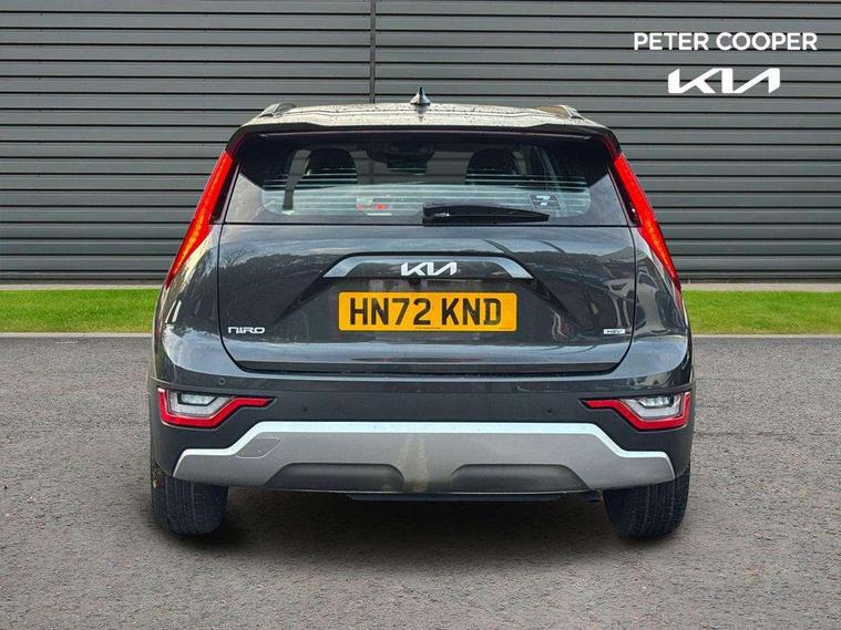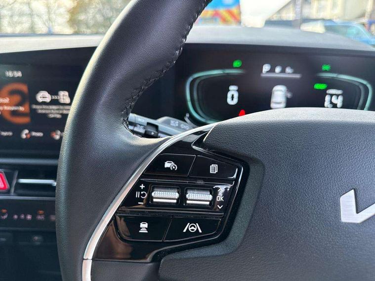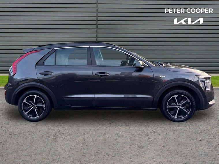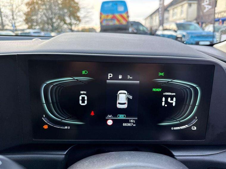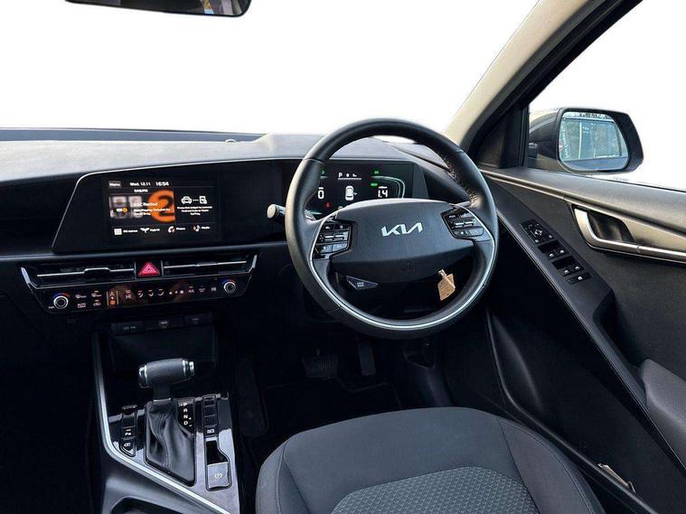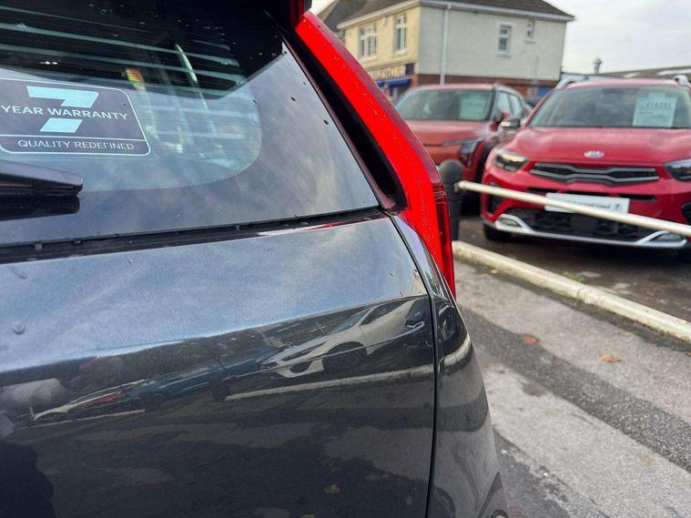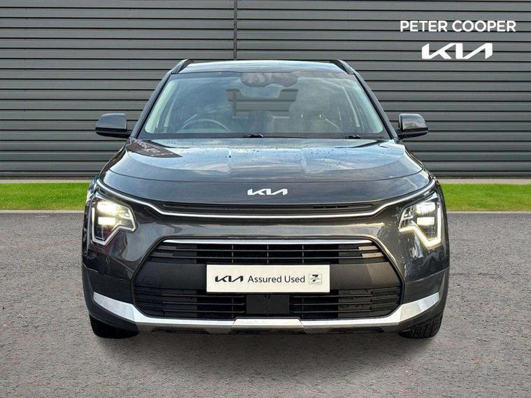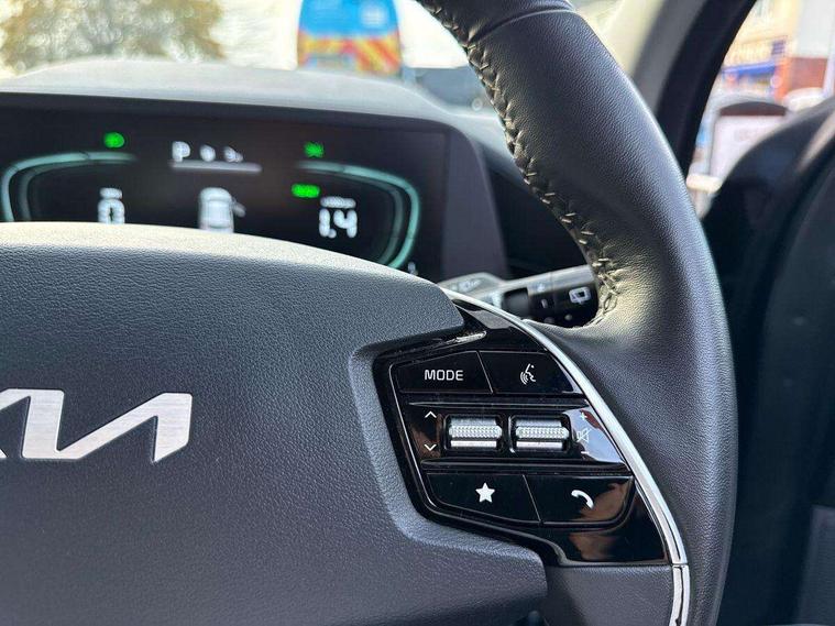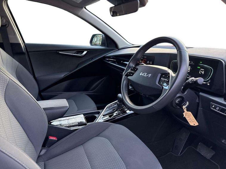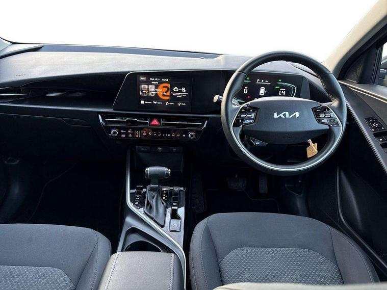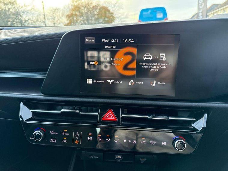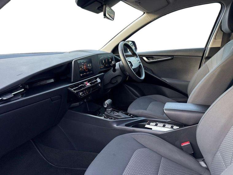 4.2" supervision colour cluster display, 8" touch screen, Adaptive smart cruise control function (SCC) with stop and go, Apple car play/Android Auto with voice control, Drive mode select (Eco, sport), E-call, Emergency stop signalling system, Forward Collision-Avoidance Assist (FCA) 1.5 - City/Pedestrian/Cyclist/Junction turning, Lane Following Assist (LFA), Lane keep assist, Motor driven power steering, Rear parking sensors, Reversing camera with dynamic guide lines, Speed limit assist, Tailgate, Trip computer with distance/fuel consumption/average speed, Sports H-Matic Automatic, 'Shark fin' mobile antenna, 2 type C USB ports on front seats, 2 USB ports in centre console including 1 type C, 6 speakers, Bluetooth with music streaming, DAB Digital radio, Steering wheel mounted controls, Acoustic windshield, All round electric windows with drivers auto up/down function, Auto dimming rear view mirror, Automatic defog system, Automatic headlight control system, Black beltline mouldings, Black embossed cladding, Body colour bumpers, Body colour door mirrors, Body colour exterior door handles, Dual LED headlights (low and high projection), Electric heated door mirrors, Front and rear silver skid plates, Heated rear window with timer, LED daytime running lights, LED rear combination lights, LED third brake light, Manual folding door mirrors, Rain sensor, Rear fog lights, Rear side wing doors, Rear spoiler, Rear wiper, Roof rails, Solar glass rear windows and tailgate, Solar glass windscreen, Welcome and follow-me home light functionality, Windscreen Washer Level Warning, 12V socket in front, 12V socket in luggage compartment, 3 seat bench in 2nd row, 60/40 split/folding 2nd row of seats, All-round height adjustable headrests, Artificial leather centre console storage box, Artificial leather steering wheel, Bulb type overhead console lamp with sunglasses case, Centre console cupholder, Cloth upholstery, Driver seat manual adjustment, Driver/passenger sunvisors with illuminated vanity mirrors, Dual zone automatic air conditioning, Front and rear door storage, H-Matic gear selection, Illuminated glovebox, Interior door lock/unlock function, ISOFIX Child seat top tethers and anchor fixings, Luggage area lamp, Luggage area load cover, Luggage board, Metal paint interior door handles, Passenger seat height adjuster, Rear armrest, Seatback pocket - driver, Single front passenger seat, Tilt/telescopic adjustable steering wheel, Towing pack - Niro, 3 point seatbelts on all seats, ABS, Automatic unlocking of doors in case of impact, Centre side front airbags, Curtain and side airbags, Drivers knee airbag, Dual shell horn, Electric parking brake with auto hold function, Electronic stability control, Front passenger airbag deactivation, Height adjustable front seatbelts, Hill start assist control (HAC), Manual rear child locks, Rear seat alert system, Traction control, Tyre pressure monitoring system, Alarm system and engine immobiliser, Deadlocks, Locking wheel nuts, Remote central door locking with fold away key, Visible vehicle identification number, Warranty - 7 Years/ 100, 000 miles, Graphite paint centre fascia, 16" alloy wheels, Tyre mobility kit,