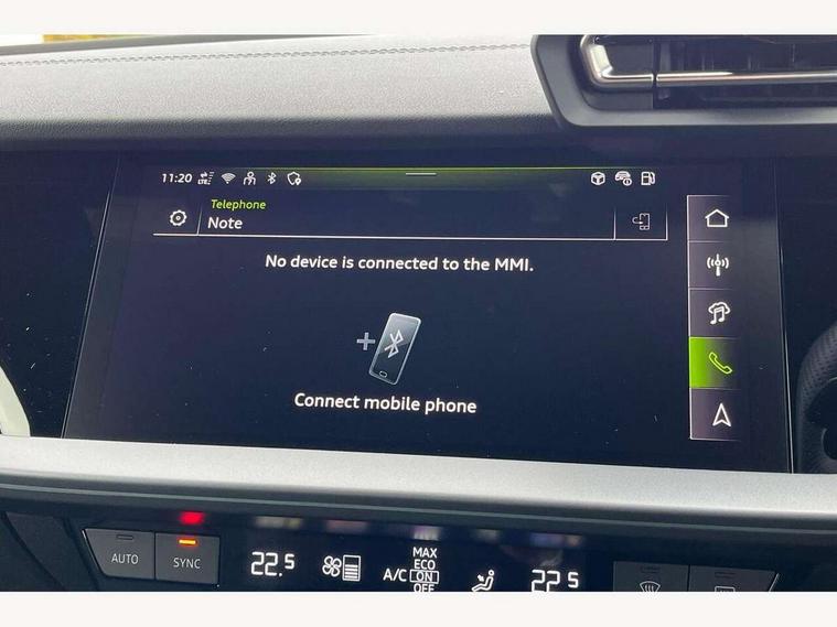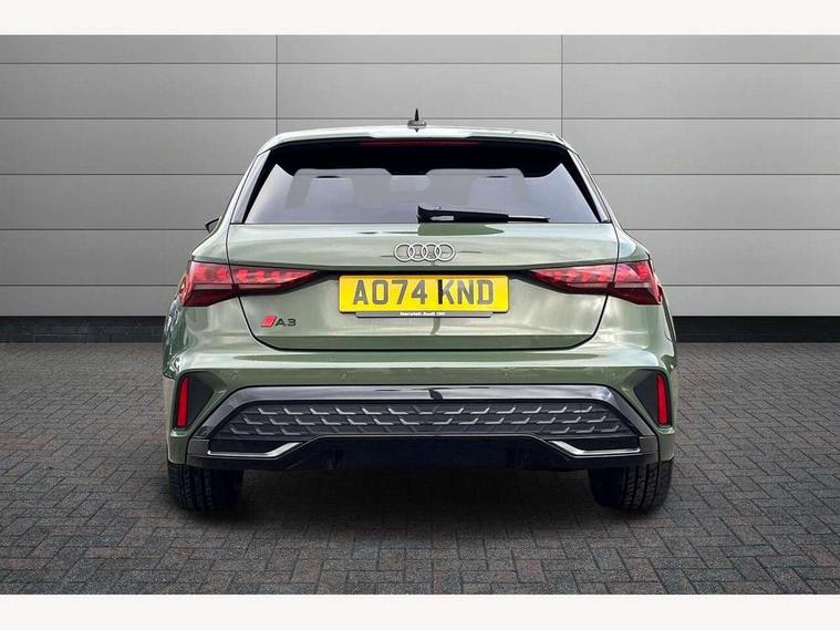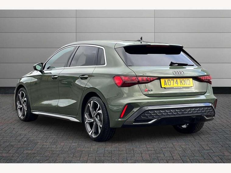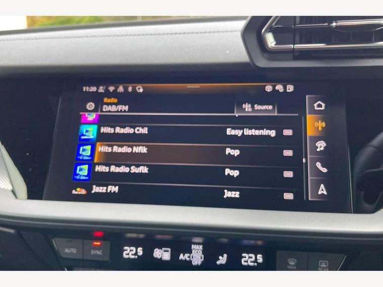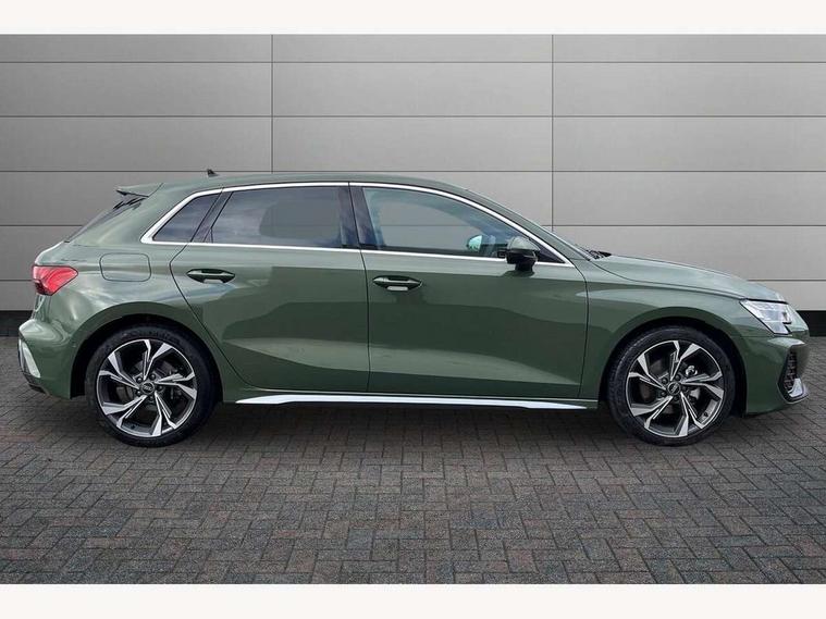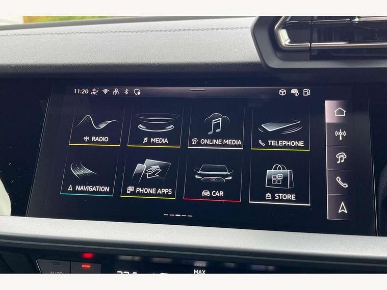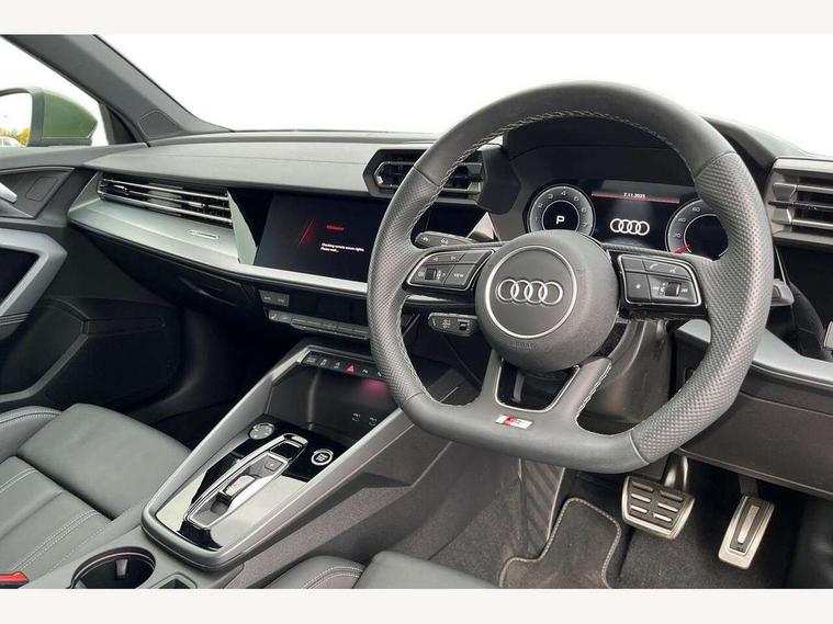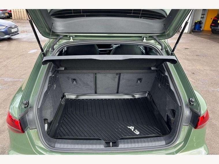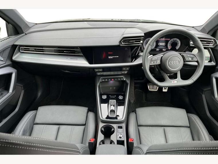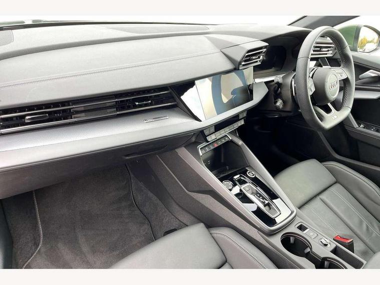 Adjustable speed limiter, Audi drive select, Audi smartphone interface with app store includes wireless Apple carplay, Android auto and Amazon alexa integration, Audi virtual cockpit plus - 12.3" full HD resolution dynamic digital instrument cluster, Automatic start/stop system with recuperation, Bluetooth interface, Camera based traffic sign recognition, Collision avoidance assistant, Cruise control, Distraction and Fatigue warning, e-Call (emergency call), Electromechanical power speed sensitive steering, Lane departure warning system, MMI Navigation Plus with high resolution 10.1" colour touch screen display, Park Assist with parking system Plus, Service indicator, Tailgate, Trip computer, Voice control system with natural language interaction, Sports suspension, Audi Phonebox light with wireless charging, Audi sound system - 10 loudspeakers including centre loudspeaker and subwoofer, DAB Digital radio, USB ports with charging function in the rear, Acoustic glass windscreen, Aluminium window trim, Auto dimming frameless rear view mirror, Body colour exterior mirrors, Chrome exhaust tailpipes, Electrically adjustable/heated/folding/auto dimming door mirrors with integrated LED indications + kerb view function for passenger side, Exterior model badging, Front and rear side air inlets in grained matt black with dark liquid chrome frame, Front electric windows, Front radiator grill in high gloss dark chrome, Heat insulating glass windscreen, Illuminated door sills with aluminium inserts at the front with S logo, LED 3rd brake light, LED daytime running lights, LED headlights with LED rear lights and dynamic rear indicators, Light and rain sensors, Privacy glass - dark tinted rear window, rear door and side windows, Rear diffuser and grill in grained matt black with inlay in dark liquid chrome, Rear electric windows, Rear side wing doors, Rear wiper, S line bumpers, S roof spoiler, Side S line emblems on front wings, Side sill trim in dark liquid chrome, 12V socket and storage compartment in front centre console, 3 seat bench in 2nd row, 3 spoke flat bottomed leather multifunction sport steering wheel with gear shift paddles, 3-zone deluxe automatic air conditioning, 4 way electrically adjustable lumbar support for driver and front passenger, 40/20/40 split folding rear seat bench, Black cloth headlining, Front and rear centre armrest in artificial leather, Front and rear headrests, Front/rear floor mats, Heated front seats, Height and reach adjustable steering wheel, Manual boot compartment lid, Manually adjustable front seats, Rear cup holders, S badging on the steering wheel, Seat side bolsters, Single front passenger seat, Stainless steel pedals and front footrest in black, Twin leather upholstery with front sports seats S embossed logo, Aluminium interior elements pack - A3 Sportback, Multi-coloured LED interior lighting package - A3, 3x3 point rear seat belts, Driver and front passenger airbag with passenger airbag deactivation, Electronic Stabilisation Control (ESC) including ABS, ASR and EDL, First aid kit with warning triangle and 2 safety vests, Front side airbags with head airbags and interaction airbag, Hill hold assist, Pre-sense front with pedestrian and cyclist detection, Seatbelt monitoring, Tyre pressure loss indicator, Anti theft alarm, Anti-theft wheel bolts, Electronically operated child locks, Immobiliser, Remote central locking with safelock, Dash & door Inlay in dark aluminium Spectrum,