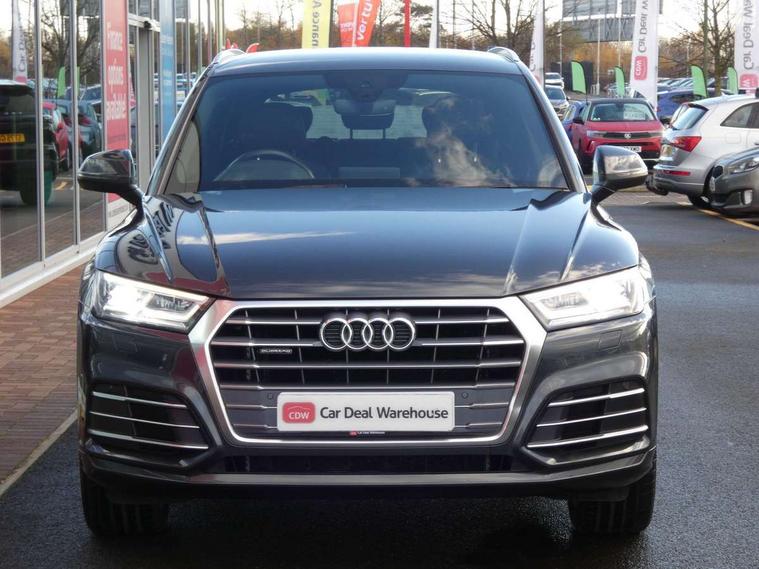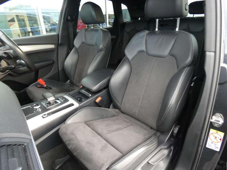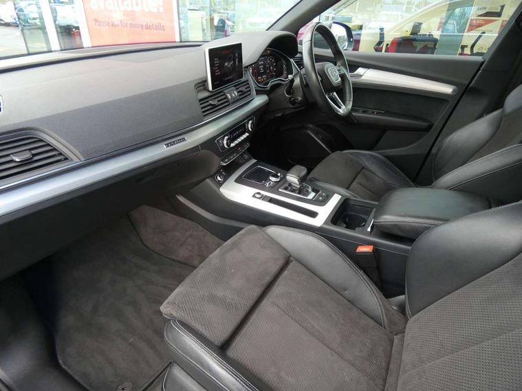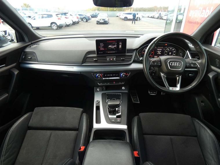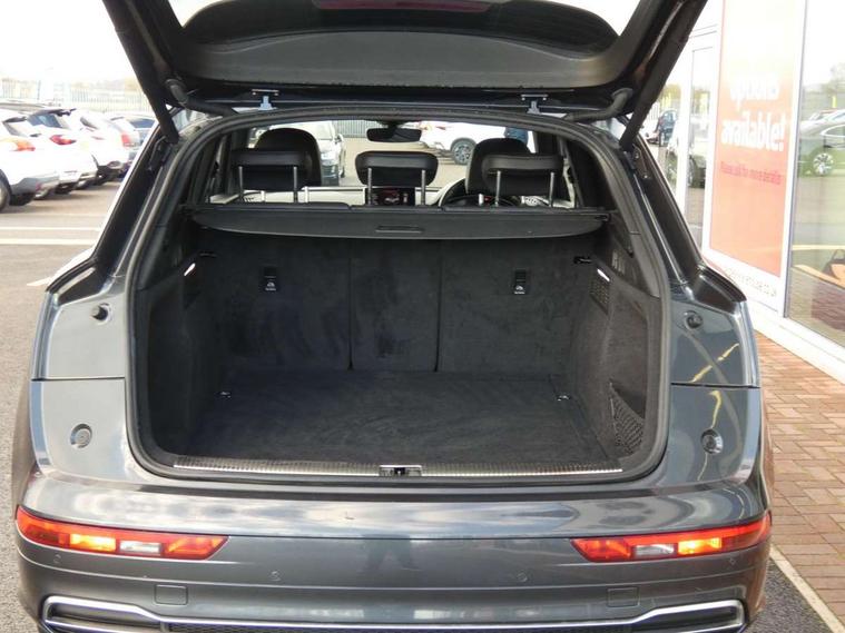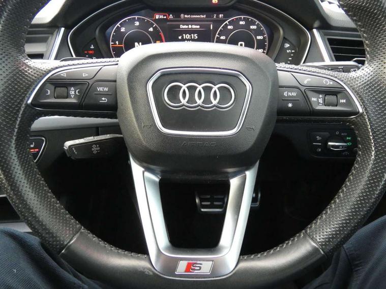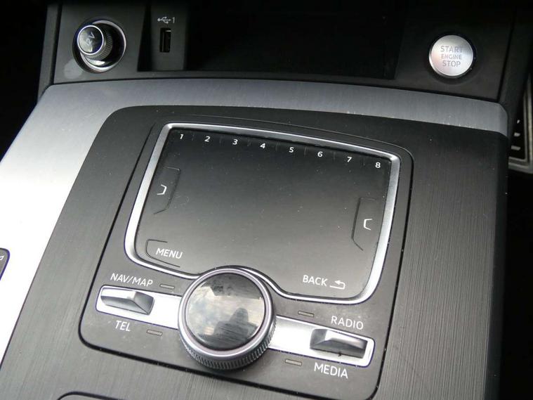 7" Colour driver information system, Audi drive select, Audi parking system plus with front and rear sensors, Audi smartphone interface, Electro - mechanical power assisted steering, MMI Navigation, Mobile telephone preparation - bluetooth interface, Power tailgate, Service interval indicator, Voice control system, Diesel particulate filter, 2x SD card slot, CD player, DAB Digital radio, MMI radio plus with 7" colour MMI screen and MMI controller, Acoustic windscreen, Air inlets in matt titanium black with blades in matt aluminium silver, Aluminium roof rails, Auto dimming rear view mirror, Automatic headlight levelling, Body colour bumpers, Body colour door mirrors, Body colour rear diffuser with matt aluminium silver surrounds, Body colour S Line side skirts, Body colour underbody protection, Chrome exhaust tailpipe, Front and rear electric windows, High beam assistant, Light and rain sensor for auto activation of lights and windscreen wipers, Loading sill protector in stainless steel, Privacy glass with front acoustic glazing, Rear wiper, S Line badges on the front wings, S Line front and rear bumpers/side air inlets and diffuser, S Line rear spoiler, Twilight grey matt radiator grille with matt aluminium horizontal chrome struts, 2 x USB charging port with aux input socket, 3 rear headrests, 3 zone climate control, 4 way electric lumbar support for driver and front passenger, 40:20:40 split folding rear seat with rear centre armrest, Black cloth headlining, Contrast stitching on seats, steering wheel and gear lever gaiter, Front centre armrest, Front sport seats with S embossed logo, Front/rear floor mats, Height adjustable front head restraints, Illuminated door sill trims with S logo, ISOFIX child seat mounting and top tether, Luggage compartment carpet, Perforated leather gearknob, Removable luggage compartment floor, Stainless steel pedals, Sunvisors with vanity mirrors, Tool kit, Trunk roller cover, High gloss pack - Q5, Non Smokers pack, 3 point seatbelts on all seats, 6 airbags - Driver, front passenger, curtain and side airbags, Electromechanical parking brake, Electronic stabilisation control including ABS, ASR and EDL, Front passenger airbag deactivation, Hill descent control, Hill hold assist, Multi collision brake assist, Pop-up bonnet for pedestrian protection, Pre sense city, Seat belt force limiter, Seatbelt monitoring, Tyre pressure warning, Warning triangle and first aid kit, Anti theft alarm, Anti-theft wheel bolts, Keyless Go access/ignition system, Remote central locking,