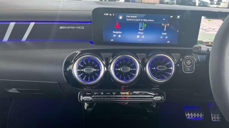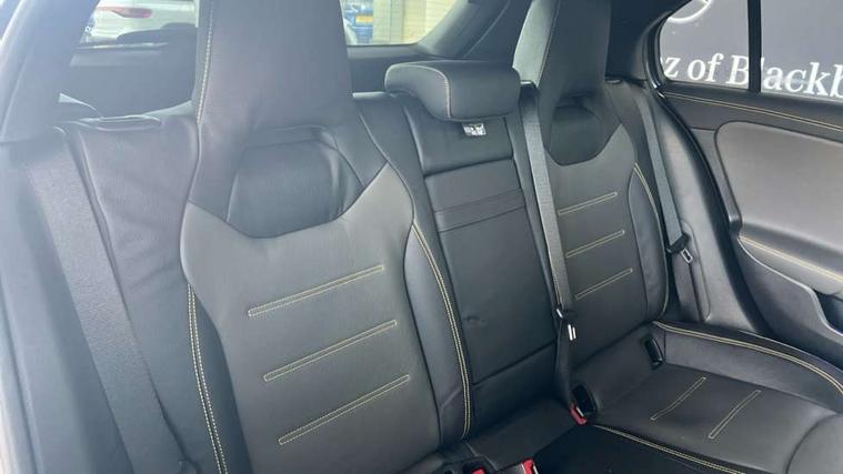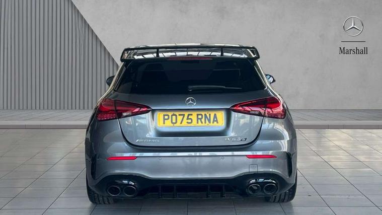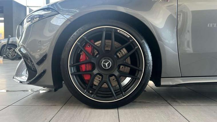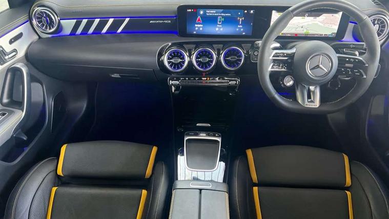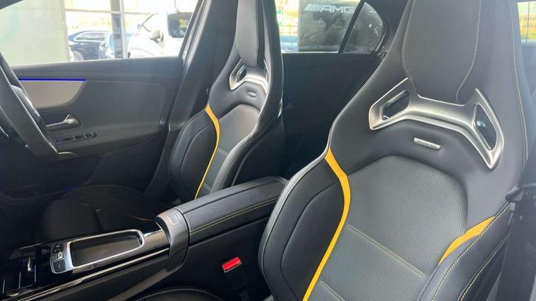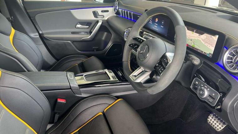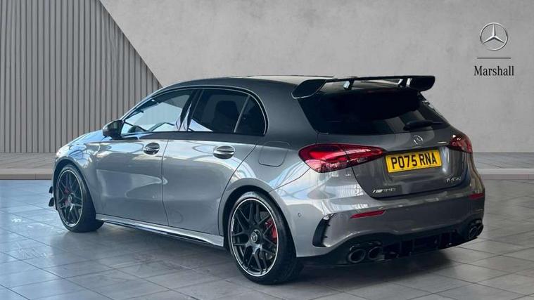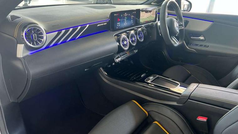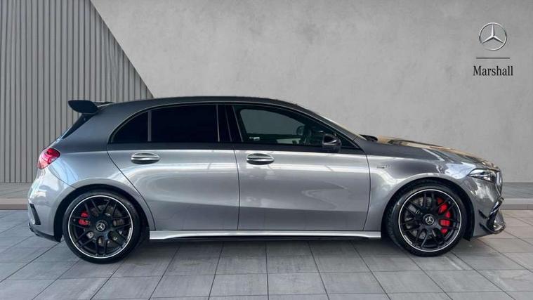 10.25 inch touchscreen central media display with AMG specific, AMG start up logo, visualisation of the AMG drive programs, vehicle and engine data, 10.25" Digital instrument cluster display screen, AMG DYNAMIC SELECT with drive modes(Slippery, Comfort, Sport, Sport+, Individual and Race) incl drift mode via steering wheel shift paddles+Race Start, AMG menu with sporty additional information - Gear indicator with yellow M symbol manual mode, Warm Up menu and Set Up menu, AMG speed sensitive steering with two sets of steering characteristics, Attention assist, Brake pad wear indicator warning light, Car wash mode, Direct steering, Dual bluetooth interfaces, ECO start/stop function, Engine start/stop button, Fluid level warning indicator for fuel, oil, coolant and washer fluid, Fluorescent jacket for driver, Hard-disk navigation, Head up Display, Hey Mercedes Voice activation, Lamp failure indicator, MBUX augmented reality for navigation, Mercedes me connect including emergency call system, accident recovery, breakdown and maintenance management, Mercedes me remote services, Outside temperature gauge, Owners manual in English, Pre-installation of private car share, Remote boot closing, Service indicator (ASSYST), Smartphone integration with Apple CarPlay and Android auto, Tailgate, Traffic sign assist, Trip computer in multifunction display with current consumption indicator, Wireless charging, AMG performance 4MATIC+ with torque control, AMG suspension including AMG specific axles and sporty spring/damper setup, Suspension with adaptive damping system, Burmester surround sound system (590W) with Dolby atmos, speakers - 1 center+4 doors+2 in C pillars, tweeter, subwoofer, DSP amp, burmester lettering, DAB Digital radio, MBUX multimedia system, 4 Electric Front and Rear windows, Adaptive brake lights, AMG A45 S bodystyling -rear apron, four vertical fins, side sill panels, roof spoiler lip, specific front apron, diffuser look and S label on boot lid, AMG real performance exhaust sound system, AMG specific radiator grille in high gloss chrome with AMG lettering, Beltline strips in High gloss Black, Body colour bumpers, Body colour door handles with chrome inserts, Body colour side skirt, Electric adjustable and heated door mirrors with integrated LED side indicators, Headlamp assist automatic headlamp activation, Heated glass rear windscreen + timer control, LED daytime running lights, LED High level third brake light, LED tail lamp, Multibeam LED headlamps with adaptive highbeam assist and cornering function, Panoramic sliding sunroof, Privacy glass, Radio aerial, Rain sensing windscreen wipers with two sensitivity settings, Rear fog lights, Rear side wing doors, Rear windscreen wiper, Surround lighting with logo projection, Two round twin tailpipe trim elements each measuring 90 mm in diameter and AMG lettering plus ribbing on the inside of the pipe, Valve control dependent on drive program, Wider wheel arches for AMG wheels, Window line trim strip in black, 3 seat bench in 2nd row, 3 Spoke flattened lower section sporty design AMG Performance steering wheel in nappa leather/microcut microfibre, 40:20:40 split folding rear seats, Air conditioning - Two zone thermotronic luxury automatic climate control with display, AMG brushed stainless steel sports pedals with rubber studs, AMG centre console finished with trim in silver chrome, AMG floor mats, AMG performance seats, AMG sporty centre console with raised front section and integral control switched for manual transmission mode, AMG steering wheel buttons, Automatic child seat recognition sensor, Black air vents with surround in silver chrome, Black roof lining, Electrically adjustable front memory seats including lumbar support and backrest inclination, Front centre armrest with stowage, Front seat head restraints, Height/reach adjustable steering column, Illuminated AMG front door sills with changeable cover, Interior lighting - 64 colour Ambient lighting, Interior mirror with reading lamps in black and frameless, Rear armrest with 2 cupholders, Rear head restraints, Seat occupancy sensor for front passenger seat, Silver coloured aluminium gear shift paddles on steering wheel, Single front passenger seat, Stowage compartment in centre console with retractable cover, Sunvisors with illuminated vanity mirrors, Twin front cupholders, Aerodynamic pack - A Class, AMG Driver's pack - A Class, AMG night pack - A Class, AMG performance high-end seat pack - A Class, Light and sight package - A Class, Mirror package - A Class, Multi-contour seat pack - A Class, Parking pack with 360 degree camera - A Class, Seat comfort pack - A Class, USB pack plus - A Class, Winter pack - A Class, 3 rear 3 point seatbelts, 3 stage electronic stability programme, ABS with Brake Assist, Active bonnet, Adaptive brake assist with hold function and hill start assist, AMG high performance brake system with red painted brake callipers and black AMG lettering at the front, ventilated and perforated brake discs, Black seatbelts, Bonnet with power domes, Childproof locks manually operated for rear doors and electrically operated for rear power windows, Crash responsive emergency lighting, Driver and passenger head and side airbags, Drivers knee airbag, Dual stage driver/passenger airbags, Electronic parking brake, ESP curve dynamic assist, ESP with ASR, Exit warning, Front and rear seatbelt reminder, ISOFIX and top tether child seat fixing points in two outer rear seats, Tyre pressure monitoring system, Warning triangle and first aid kit, Window airbags, Alarm system/interior protection/immobiliser, Guard 360 degree vehicle protection, Keyless entry lock/unlock, Keyless Go, Remote central locking and crash sensor with emergency opening function, Aluminium AMG design black/silver interior trim, 19" AMG cross spoke forged wheels painted in matt black with high sheen rim flange, Summer tyres, Tirefit sealant kit, Wheel arches with flared AMG wings with TURBO 4MATIC+ letterin