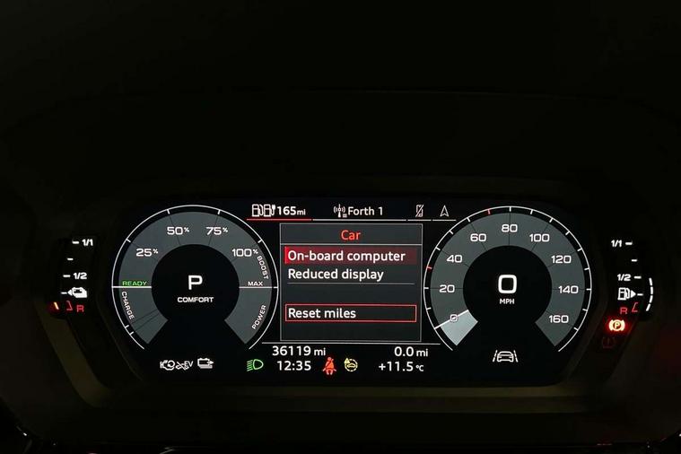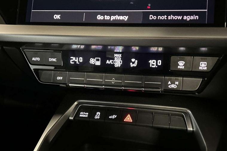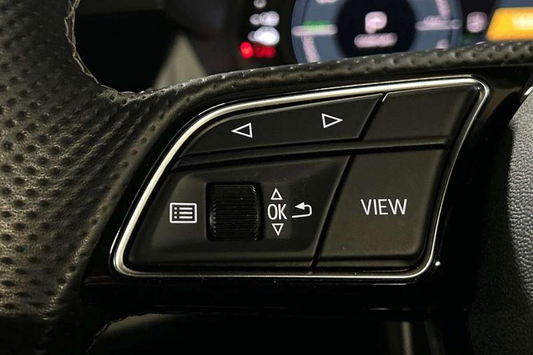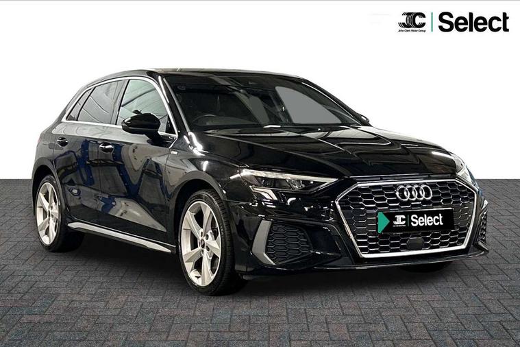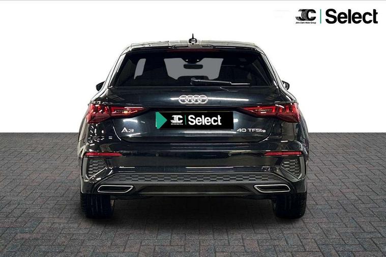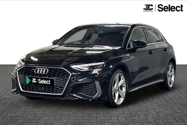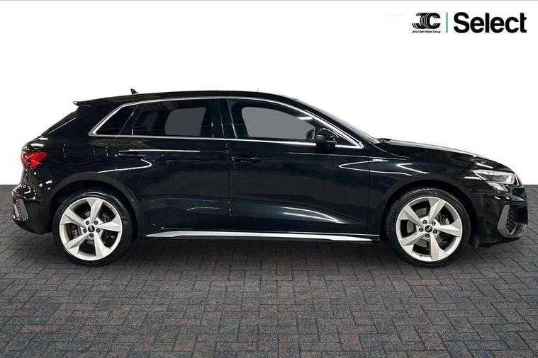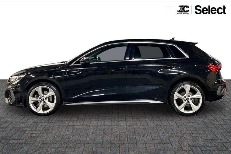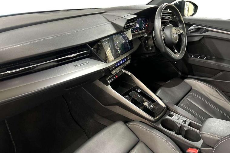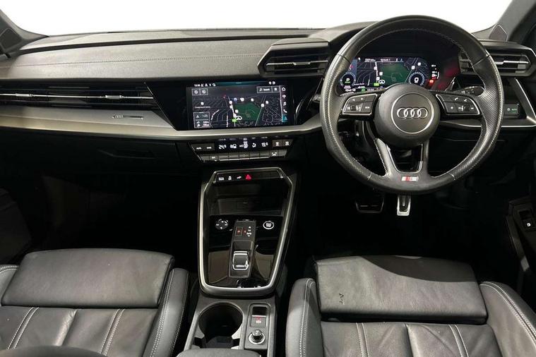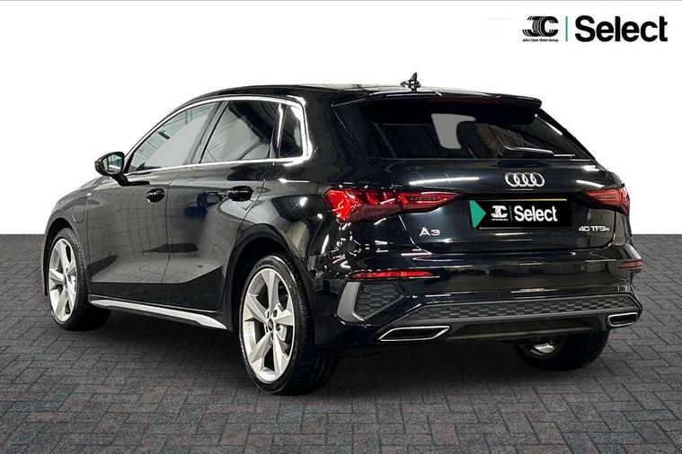 Audi drive select (Auto, Comfort, Dynamic, Efficiency and Individual), Audi smartphone interface, Audi Virtual Cockpit - 10.25" digital and colour instrument cluster, Automatic start/stop system with recuperation, Bluetooth interface, Collision avoidance assistant, e-Call (emergency call), Electromechanical power speed sensitive steering, Lane departure warning system, MMI Navigation Plus with high resolution 10.1" colour touch screen display, Service indicator, Trip computer, Voice control system with natural language interaction, 3 pin 10 amp domestic charging cable, 3.6 kw On-board charger, Standard suspension, Type 2 mode 3 32 amp charging cable, Type 2 socket for AC charging, 2xUSB-C connection with data and charging functions, 6 passive loudspeakers, DAB Digital radio, 3rd brake light, Acoustic glass windscreen, Aluminium window trim, Auto dimming frameless rear view mirror, Electrically adjustable/heated/folding/auto dimming door mirrors with integrated LED indications + kerb view function for passenger side, Front electric windows, Illuminated aluminium inserts front door sills with S logo, LED daytime running lights, LED headlights with LED rear lights and dynamic rear indicators, Light and rain sensors, Privacy glass - dark tinted rear window, rear door and side windows, Rear electric windows, Rear side air outlets in grained matt black, Rear side wing doors, Rear wiper, S line bumpers, S roof spoiler, 12V socket and storage compartment in front centre console, 3 seat bench in 2nd row, 40/20/40 split folding rear seat bench with cupholder, Black cloth headlining, Dual zone electronic climate control, Front and rear centre armrest in leather, Front and rear headrests, Front/rear floor mats, Height and reach adjustable steering wheel, Illuminated vanity mirror, Interior lighting - glove compartment light and right hand side, Luggage compartment floor covering, Manual boot compartment lid, Manually adjustable front seats, Seat side bolsters, Single front passenger seat, Stainless steel pedals and front footrest in black, Twin leather upholstery with front sports seats S embossed logo, Aluminium interior elements pack - A3 Sportback, S line styling pack - A3 Sportback, 3x3 point rear seat belts, Audi pre sense front, Driver and front passenger airbag with passenger airbag deactivation, Electronic Stabilisation Control (ESC) including ABS, ASR and EDL, First aid kit with warning triangle and 2 safety vests, Front side airbags with head airbags and interaction airbag, Pre-sense front with pedestrian and cyclist detection, Seatbelt monitoring, Tyre pressure loss indicator, Anti theft alarm, Anti-theft wheel bolts, Immobiliser, Manual child locks, Remote control central locking, Accent surfaces in the dashboard and centre console in platinum grey silk effect paint finish, Dark spectrum aluminium inlays, Tool kit, Tyre repair kit,