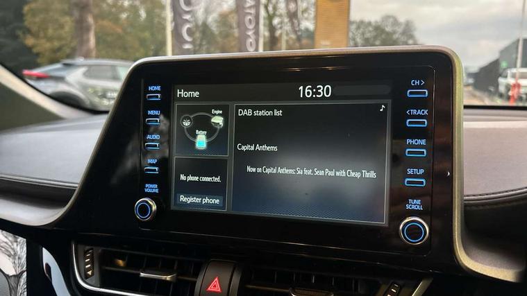 4.2" coloured TFT screen for multi-information display, Adaptive cruise control, Bluetooth connectivity, E-call, Electric power steering, Hybrid system indicator, Lane departure alert with steering control, Lane trace assist, Push button start, Push button tailgate release, Remote boot door release in cabin, Remote boot door release in key, Reversing camera, Road sign assist - RSA, Smart voice assist, Trip computer, Voice recognition, Vehicle Stability Control (VSC), 6 speakers, AM/FM radio, DAB Radio (Digital Audio Broadcasting), Toyota touch 2 multimedia system with 8" display, USB connector, Wi-fi connectivity, Anti-jam protection on power windows, Auto high beam, Auto up and down function on all power windows, Automatic headlights, Automatic headlights cut-off, Black and body coloured rear bumper, Black lower front grille, Black upper front grille, Body colour door handles, Body colour door mirrors, Body colour front spoiler lip, Body coloured front bumper, Boot door release with push button, Electric heated door mirrors, Follow me home headlights, Front and rear power windows, Front fog lights, Headlight cut off reminder, Honeycomb lower front grille, LED daytime running lights, LED High mounted stop light, LED rear brake lights, LED rear combination lights, Manual headlight levelling, Manually retractable door mirrors, Noise reduction layer on front windows and windscreen, Power adjustable door mirrors, Rear side wing doors, Rear spoiler, Rear tailgate, Rear window defogger, Rear window wiper, Reflective LED headlights, Shark fin antenna, UV-filter on driver and passenger windows, UV-filter on rear windows, 12v power outlet - front, 3 rear headrests, 3 seat bench in 2nd row, 3 spoke leather steering wheel, 60/40 split folding rear seat, Adjustable rear headrests, Adjustable speed limiter switch on steering wheel, Assist grips front and centre pillar, Audio and telephone switches on steering wheel, Black front door assist grips, Boot light, Chrome interior door handles, Cloth upholstery, Driver and front passenger personal light, Driver and front passenger Whiplash Injury Lessening seats, Dual zone automatic air conditioning, Floor mats, Front cupholders, Front head restraints, Front sports seats, Glovebox with internal light, Hard tonneau cover, Hooks for luggage holding net, Humidifying Nanoe air purifier, Illuminated entry system, Isofix attachments on outer rear seats, Leather gearshift, Light on driver sun visor, Light on passenger sun visor, Manual telescopic steering wheel, Manual tilt steering wheel, Manually adjustable lumbar support on driver seat, Manually height adjustable driver seat, Manually height adjustable front passenger seat, Manually reclining driver seat, Manually reclining front passenger seat, Manually sliding driver seat, Manually sliding front passenger seat, Microphone on front personal light, Mirror on driver sun visor, Mirror on passenger sun visor, Multimedia switches on steering wheel, Pollen filter, Shopping bag hooks, Single front passenger seat, Slow opening on lower glovebox, Voice recognition switch on steering wheel, 16 Disk front wheel brake, 3x3 point rear seatbelts, ABS+EBD+Brake assist, Electronic parking brake, Front and rear seatbelt reminder, Front passenger airbag on/off switch, Hill start assist control (HAC), Pre collision system with pedestrian detection, Pre-tensioners and force limiters, Rear door child safety locks, SRS Airbags - Driver + Front passenger, front side, front and rear curtain and driver's knee airbags, Toyota safety sense, Tyre pressure monitoring system, Tyre pressure warning system, Acoustic vehicle alert system (AVAS), Glass-breaking alarm sensors, Immobiliser, Intrusion alarm, Intrusion sensor, Motion sensor alarm, Power door locks, Power passenger window lock, Remote central locking, Black lower dashboard, Black upper dashboard, Grey deco line on upper dashboard, Matte black centre console, Tyre repair kit,