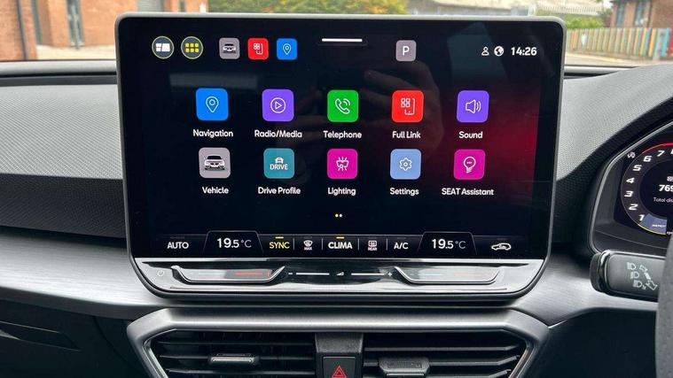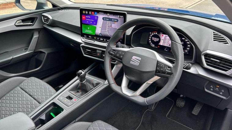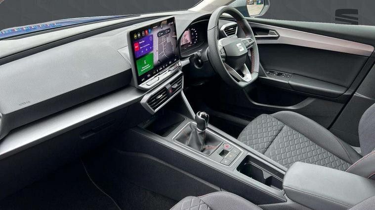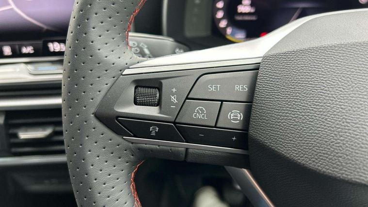 Digital cockpit, E-call, Four x USB Type C ports, Front assist with forward collision warning braking reaction to vehicles, pedestrians and cyclists, Full link smartphone integration with Mirror Link, wireless Apple CarPlay and wired Google Android Auto, Lane assist, Lockable tailgate, Park assist (inc front/rear parking sensors), Power assisted speed sensitive electro-mechanical steering, Rear view camera, RPM, trip computer, outside temp gauge, instrument light brightness, low fuel warning light, lights on reminder, gearshift indicator, SEAT drive profile with 4 modes (Eco/Normal/Sport/Individual), throttle response, Service interval indicator, Start/stop system with regenerative braking, Sports suspension, XDS electronic differential lock and dynamic traction support, 7 speakers, Auxiliary input socket, Auto dimming rear view mirror, Body colour door handles, Body coloured bumpers, Cosmo grey exterior mirrors with integrated LED indicators, Dark tinted rear windows, Dynamic headlight range control, Electric front/rear windows, Electrically adjustable, heated and folding door mirrors, FR sports bumper, Illuminated front door sill, LED front fog lamps, LED Headlights with dynamic turn signals, LED tail lights and rear fog lights with rear coast to coast lighting, Rear side wing doors, Rear wash/wipe, Separate daytime running light with automatic headlight control and coming home feature, Third brake light, Welcome light silhouette from exterior mirrors, Windshield wiper intermittent control with light/rain sensor, 12v power point in centre console, 3 seat bench in 2nd row, 60/40 split rear bench seat with armrest, Ambient lighting with glovebox, footwell and single monocolour, Driver/passenger manual seat height adjustment, Dust/pollen filter, Flat bottomed perforated leather steering wheel with red stitching and FR logo and leather gear stick, Folding boot cover, Front and rear height adjustable headrests, Front and rear reading lights X 4, Front centre armrest, Front seatback storage pockets, Height/reach adjust steering wheel, ISOFIX points in outer rear seats with top tether anchorage points, Luggage tie-down hooks, Lumbar adjustment for front seats, Single front passenger seat, Sunvisors with covered illuminated mirror, Three zone climate control, Two tone cloth upholstery, Media system plus with navigation - Leon, 3 point seatbelts on all rear seats, ABS, Brake control system - ESC and brake booster, Child proof door locks, Driver and front passenger airbags with front passenger airbag de-activation, front side and curtain airbags, Electronic parking brake, Extended safety system - seat belt tensioner, window closure and hazard lights, Hill hold control, Rear disc brakes, Seat belt reminder for front and rear seats, Tiredness recognition system, driver alert system, Tyre pressure monitoring system, Anti theft alarm system with interior monitoring in cab, backup horn and towing protection, KESSY Go (Keyless start), Locking wheel bolts, Wireless phone charging, Chrome interior detailing, 17" Dynamic Bi-spoke alloy wheels with 91W tyres, Tool kit,