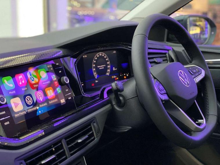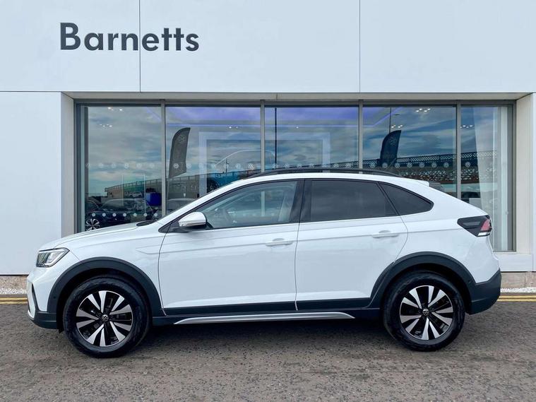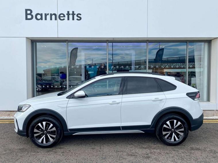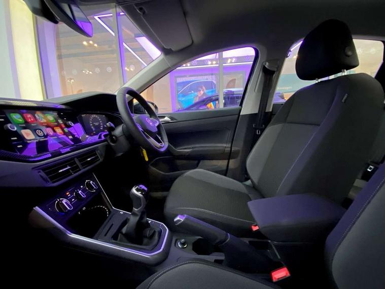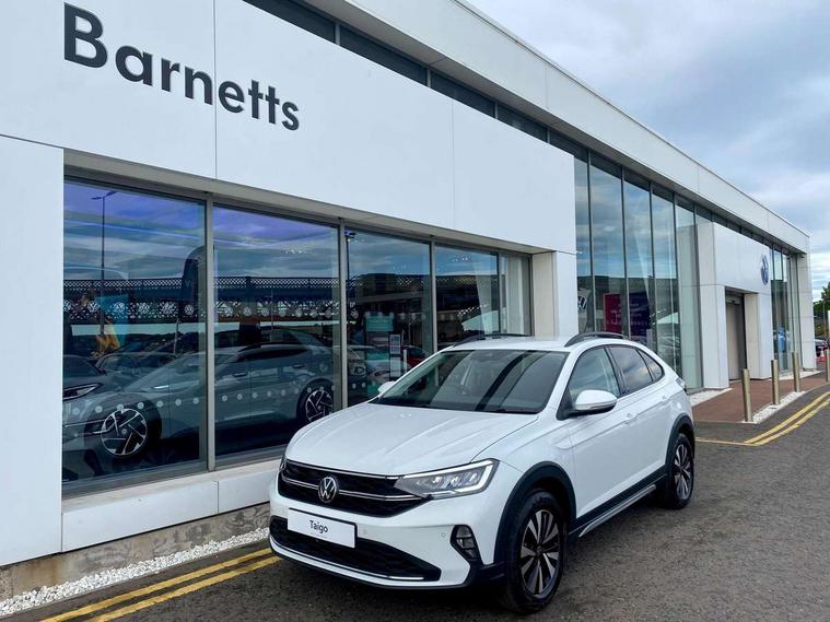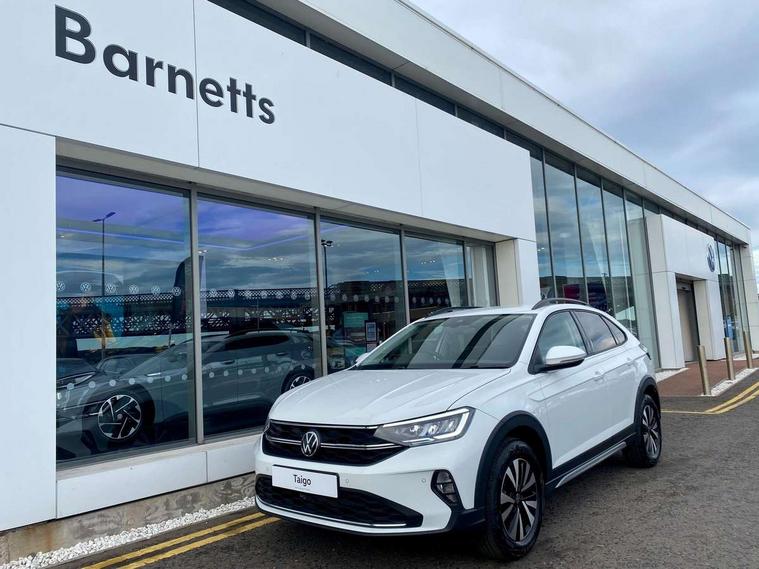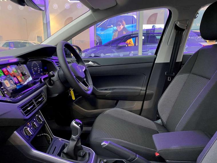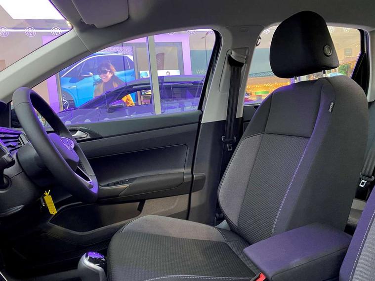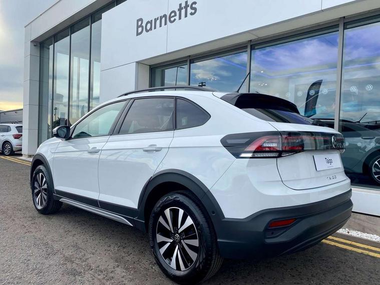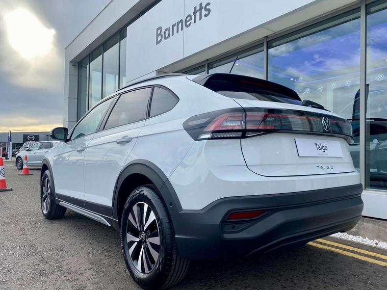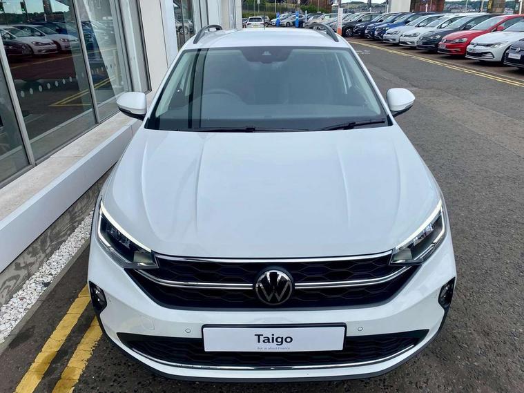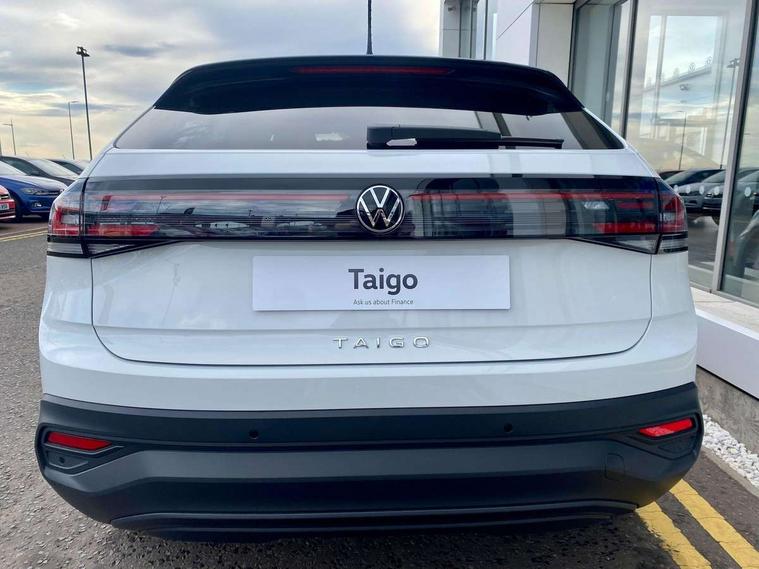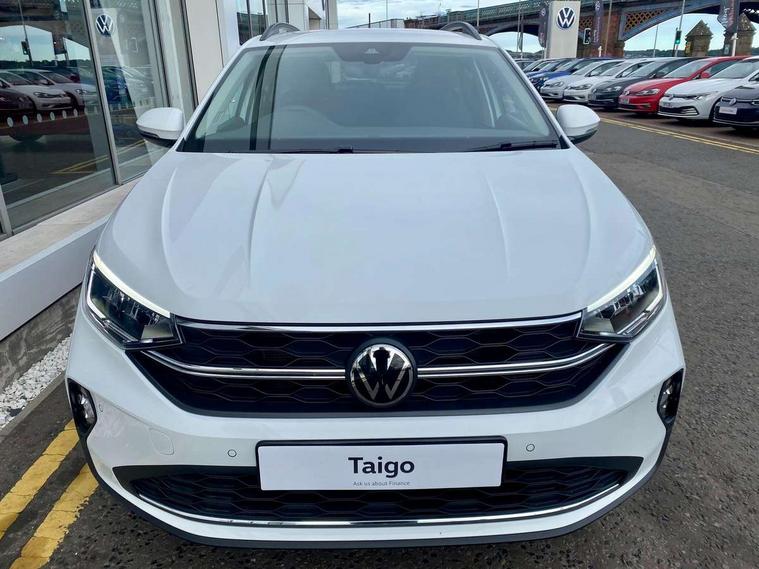 Driver alert system, e-Call (emergency call), Power Steering, Travel assist including emergency assist, Washer fluid level indicator, Wireless Charging including Bluetooth, Start-stop system with battery regeneration (recuperation - energy recovery during braking), WeConnect plus, Ambient lighting with logo projection, Aspherical driver's exterior mirror, Auto headlights, Body coloured bumpers, Body coloured exterior mirror housings and door handles, Electric windows, External USB type C socket and charging sockets, Front fog lamps with cornering function, Headlight range control, Heat insulating glass windscreen, LED headlamps, LED rear combination lamp, LED third brake light, Left convex exterior mirror, Power folding adjustable/heated exterior mirrors and front passenger exterior mirror lowering function, Rear fog light on one side, reversing light on both sides, Rear side wing doors, Rear wash/wipe with intermittent wipe setting, 'Slash/ Austin' Cloth upholstery, 12V socket in centre console, 2 front reading lights, 3 rear head restraints, 3 seat bench in 2nd row, Black carpets, Child seat anchor for child seat system i-Size, 2x top tether and child seat anchor in front on front passenger side, Door and side trim panels in titan black, Driver and front passenger seat height adjustment, Front centre armrest, Handbrake lever handle in leather, Height and reach adjustable steering wheel, Leather trimmed gear knob, Leather wrapped multifunction steering wheel, Luggage compartment floor, Luggage compartment light, Lumbar support for driver's and front passengers seat, Seat covers in titanium black, Single front passenger seat, Split folding backrest with centre armrest and unsplit rear seat bench, Storage compartment under front seats, Sun visors with illuminated vanity mirrors, Chrome Package - Taigo, Drivers assistance pack - Taigo, Light and Sight pack including High beam assist - Taigo, 2 x 3-point seatbelts/outer rear seats with ECE label, 3-point seat belts in front with pretensioner and height adjustment, 3-point seatbelt for centre rear seat, Driver and front passenger airbags with front passenger airbag de-activation, front side and curtain airbags, Driver and front passenger safety-optimised head restraints, Electronic stability control, Extended and predictive pedestrian/ cyclist protection, Front and rear disc brakes, Front curtain and side airbags with center airbag, Hill start assist, Manual rear child locks, Single tone horn, Tyre pressure loss indicator, Anti-theft alarm system with interior monitoring, backup horn, and towing protection, Anti-theft wheel bolts, Lava stone black gloss/matt decorative inserts in dash and front door panels, Low rolling resistance tyres,