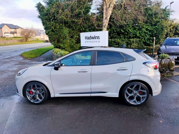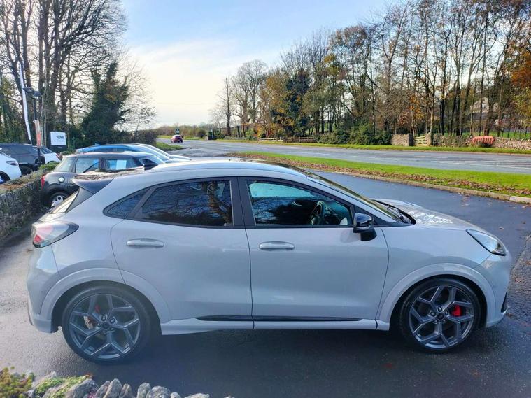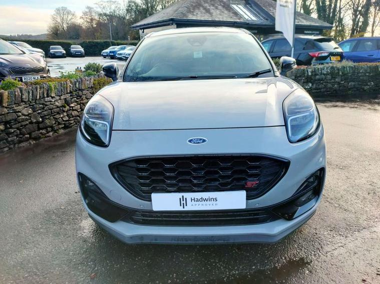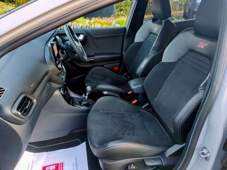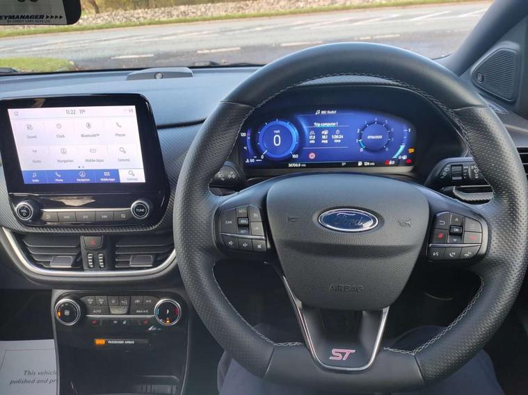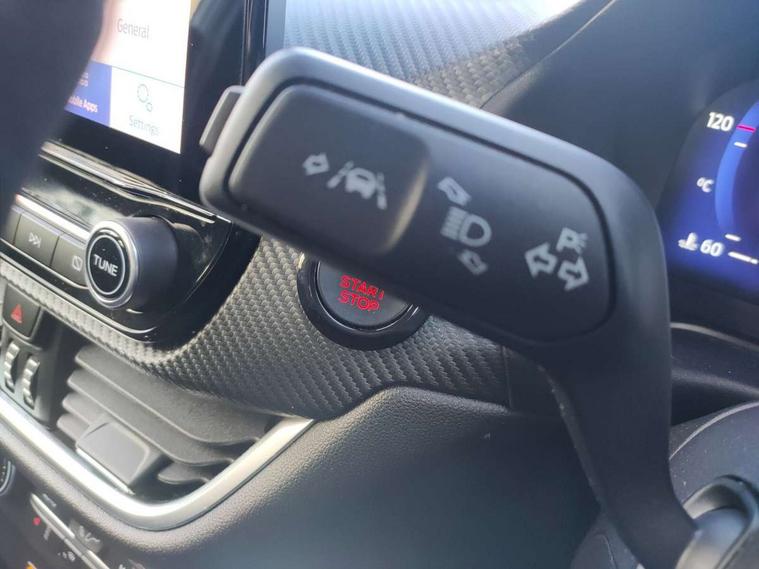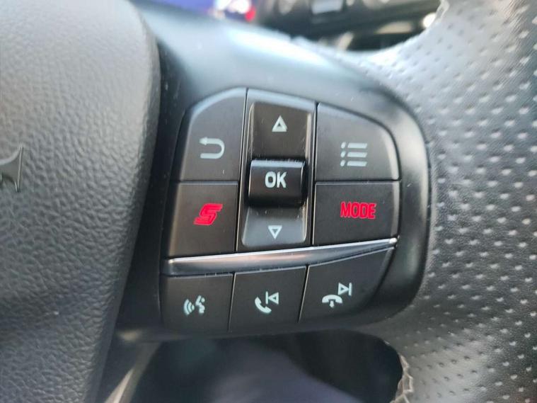 Cruise control, Ford easy fuel, Front parking sensor, Full digital 12.3" instrument cluster, Lane keeping aid with lane departure warning, Power assist steering, Power start button, Rear parking sensor, Selectable drive modes (normal, sport, eco, track), Wireless charging pad, Engine sound enhancer, ST suspension, Automatic headlights with rain sensing wipers and auto high beam, Black door mirrors, Dual chrome exhaust, Fixed LED headlamps, Front fog lights with cornering lights and LED rear lamps, Gloss black with chrome elements on front and rear bumpers, High chrome waistline, LED daytime running lights, Power foldable heated door mirrors with puddle lamps, Privacy glass to side rear windows and tailgate glass, Quickclear heated windscreen, Rear wiper, ST scuff plates, Unique ST elements to front and rear body styling kit including Ford Performance embossed splitter, Alloy sports pedals, Centre console with armrest and stowage, Ford megabox extended bootspace, Front and rear floor mats, Front and rear head restraints, Heated front seats, Heated steering wheel, Lumbar massage for driver and passenger, Manual air conditioning, Premium sensico wrapped instrument cluster, Recaro sport seats partial leather upholstery, ST flat bottomed steering wheel with metal grey stitching, ST logo projection, Unique ST gear shift knob, Wireless charging pad with electronic air temperature control (EATC), B&O Premium Audio system + Ford SYNC 3 navigation pack - Puma, 3 rear seatbelts, Electronic stability control (ESC) and hill start assist, Pre-collision assist with autonomous emergency braking, pedestrian/cyclist detection & post-collision braking, Red brake calipers, Tyre pressure monitoring system (TPMS), Thatcham alarm, Carbon look interior deco spears, Tyre inflation kit,