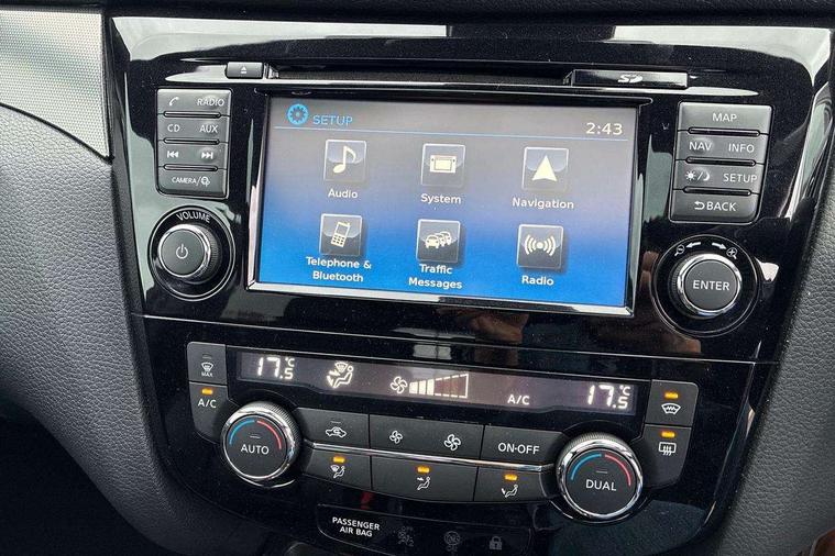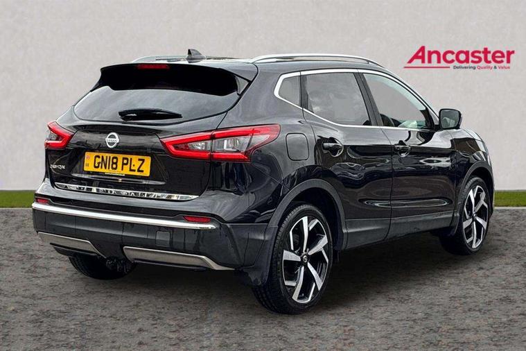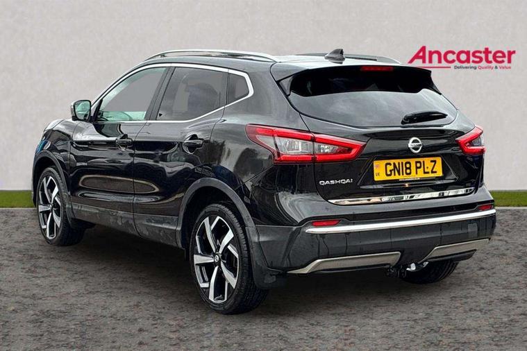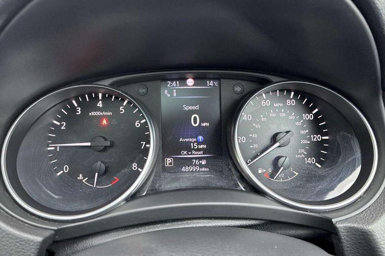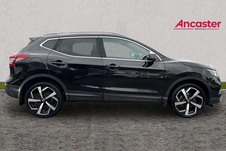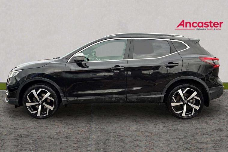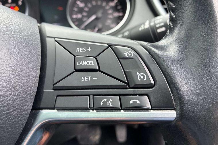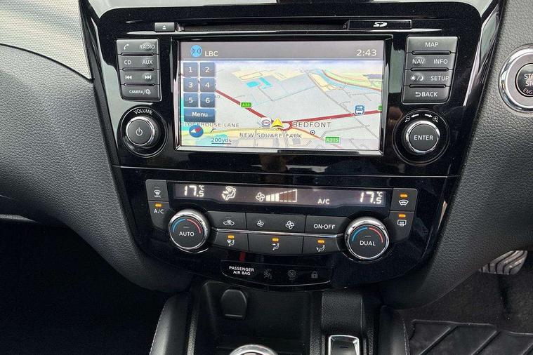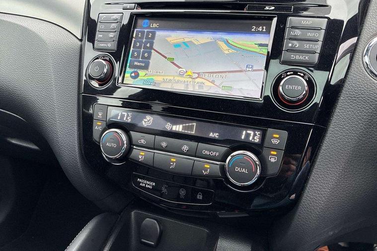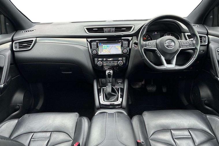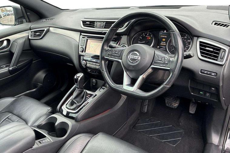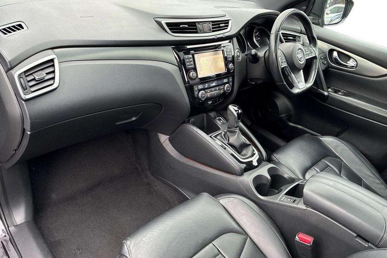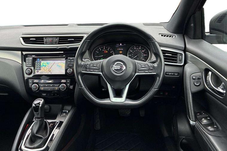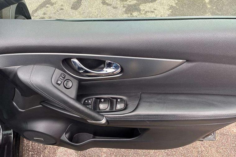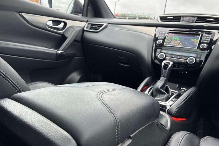 Graphite interior trim, Heat package - Qashqai, LED pack - Qashqai, Tyre puncture repair kit, Alarm, Immobiliser, Intelligent Key, Remote central locking, 'Shark fin' mobile antenna, Bose premium 8 speaker system, DAB Digital radio, Radio/CD, Smartphone apps, Steering wheel mounted audio controls, USB/aux input socket, ABS, brake assist and EBD, Child locks on rear doors, Curtain airbags, Driver/front passenger airbag, Electronic parking brake, ESP + traction control, Forward emergency braking, Front passenger airbag deactivation, Height adjustable front seatbelts, Hill start assist, Seatbelt warning, Side airbags, Three 3 point rear seatbelts, Tyre pressure monitoring system, Automatic headlamp activation, Body colour bumpers, Body colour door handles, Chrome window surround, Electric folding and heated door mirrors, High beam assist, Interior mirror with auto anti dazzle, LED indicators in door mirrors, One touch electric front/rear windows, Panoramic sunroof with one touch shade, Privacy glass, Rain sensor windscreen wipers, Rear roof spoiler, Rear wiper, Silver door mirrors, Silver roof rails, 2 X front 12v power sockets, 4 way lumbar support with memory function, 60/40 split folding rear seat, Ambient interior lighting, Centre console with armrest, Chrome interior door handles, Configurable luggage board system, Dark headlining, Dual zone climate control, Electric adjust driver's seat, Electric front passenger seat, Front and rear door pockets with bottle holders, Front headrests, Front seat belt pre-tensioners with load limiters, Illuminated electric window switch, Isofix child seat preparation, Leather gearknob, Leather interior door handles, Leather knee rest, Leather steering wheel, Luggage compartment lighting, Map reading lamp, Parcel shelf, Pollen filter, Rake/reach adjustable steering wheel, Rear headrests, 5" TFT driver information centre, Around View Monitor, Blind spot monitoring, Bluetooth phone integration system, Cruise control, Electric speed sensitive power steering, Front and rear parking sensors, Intelligent parking assist, Lane departure warning system, Nissan connect sat nav system, Outside temperature display, Push button starter, Rear view camera, Service interval indicator, Speed limiter, Traffic sign recognition, Trip computer,