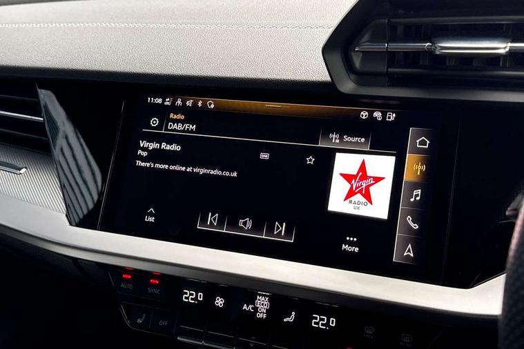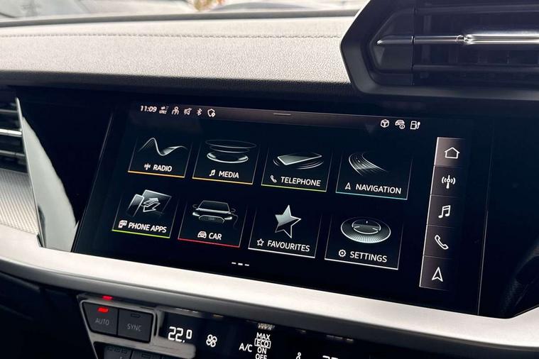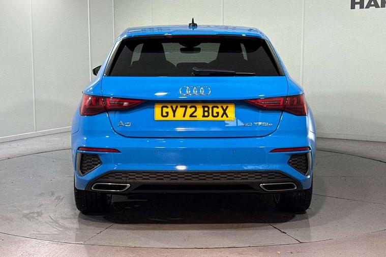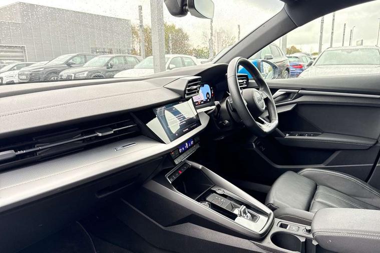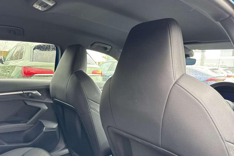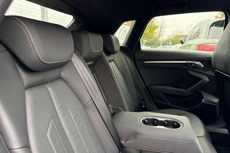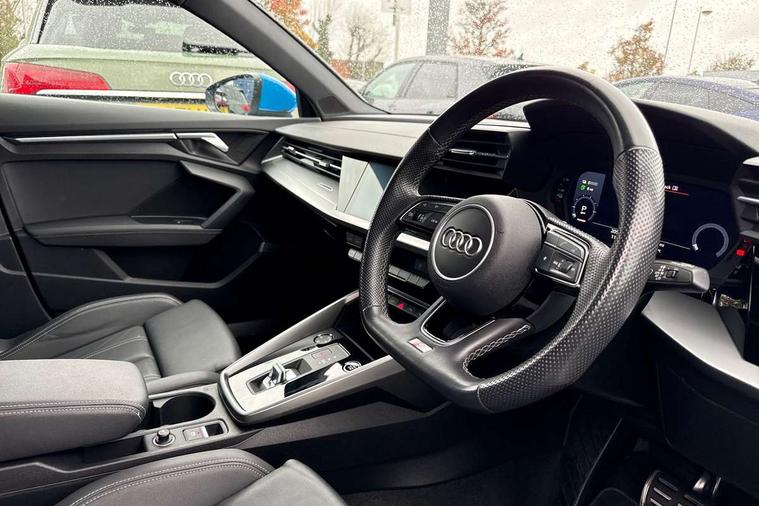 Audi drive select (Auto, Comfort, Dynamic, Efficiency and Individual), Audi smartphone interface, Audi Virtual Cockpit - 10.25" digital and colour instrument cluster, Automatic start/stop system with recuperation, Bluetooth interface, Collision avoidance assistant, e-Call (emergency call), Electromechanical power speed sensitive steering, Lane departure warning system, MMI Navigation Plus with high resolution 10.1" colour touch screen display, Service indicator, Trip computer, Voice control system with natural language interaction, 3 pin 10 amp domestic charging cable, 3.6 kw On-board charger, Standard suspension, Type 2 mode 3 32 amp charging cable, Type 2 socket for AC charging, 2xUSB-C connection with data and charging functions, 6 passive loudspeakers, DAB Digital radio, 3rd brake light, Acoustic glass windscreen, Aluminium window trim, Auto dimming frameless rear view mirror, Electrically adjustable/heated/folding/auto dimming door mirrors with integrated LED indications + kerb view function for passenger side, Front electric windows, Illuminated aluminium inserts front door sills with S logo, LED daytime running lights, LED headlights with LED rear lights and dynamic rear indicators, Light and rain sensors, Privacy glass - dark tinted rear window, rear door and side windows, Rear electric windows, Rear side air outlets in grained matt black, Rear side wing doors, Rear wiper, S line bumpers, S roof spoiler, 12V socket and storage compartment in front centre console, 3 seat bench in 2nd row, 40/20/40 split folding rear seat bench with cupholder, Black cloth headlining, Dual zone electronic climate control, Front and rear centre armrest in leather, Front and rear headrests, Front/rear floor mats, Height and reach adjustable steering wheel, Illuminated vanity mirror, Interior lighting - glove compartment light and right hand side, Luggage compartment floor covering, Manual boot compartment lid, Manually adjustable front seats, Seat side bolsters, Single front passenger seat, Stainless steel pedals and front footrest in black, Twin leather upholstery with front sports seats S embossed logo, Aluminium interior elements pack - A3 Sportback, LED interior lighting pack - A3 Sportback, S line styling pack - A3 Sportback, 3x3 point rear seat belts, Audi pre sense front, Driver and front passenger airbag with passenger airbag deactivation, Electronic Stabilisation Control (ESC) including ABS, ASR and EDL, First aid kit with warning triangle and 2 safety vests, Front side airbags with head airbags and interaction airbag, Pre-sense front with pedestrian and cyclist detection, Seatbelt monitoring, Tyre pressure loss indicator, Anti theft alarm, Anti-theft wheel bolts, Electronically operated child lock, Immobiliser, Remote control central locking, Accent surfaces in the dashboard and centre console in platinum grey silk effect paint finish, Dark spectrum aluminium inlays, Tool kit, Tyre repair kit,