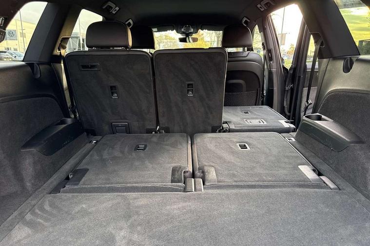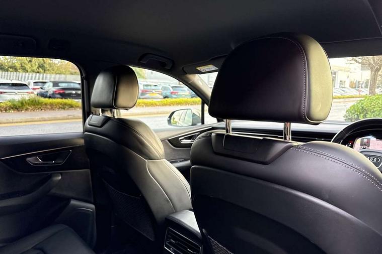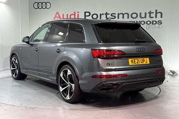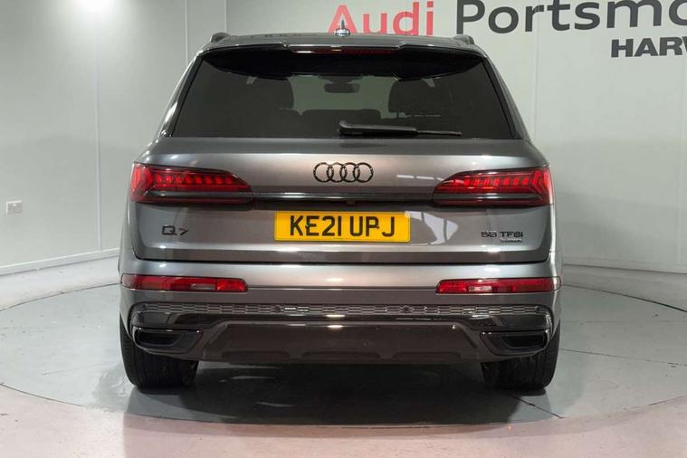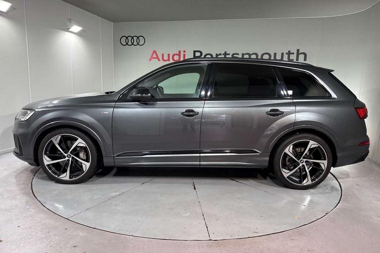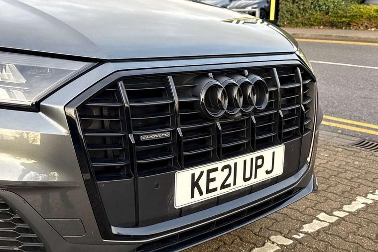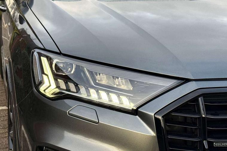 Audi connect safety and service (e-call), Audi drive select (Auto, Comfort, Dynamic, Efficiency, Individual, Off-road and All road), Audi phone box with wireless charging, Camera based traffic sign recognition, Electromechanical steering, MMI navigation plus with MMI touch screens includes 10.1" and 8.6" screens with haptic feedback, Natural voice recognition, Parking system plus with 360 degree display (front, rear and side sensors) - acoustic and visual park assist system, Power operated tailgate, Rear view camera, Smartphone interface includes wireless Apple carplay/Android Auto, Start/stop system, 48V Mild hybrid technology, 85 litre fuel tank, Adaptive air sports suspension, Quattro all wheel drive with self locking centre differential, Audi music interface - front 2 USB-C ports with charger and data functions, Audi sound system with 6 channel amplifier, 180 watt amplifying capacity and 10 loudspeakers including subwoofer, DAB digital radio module, Audi matrix LED headlights with dynamic front and rear indicators, Auto dimming frameless rear view mirror, Black roof rails, Bumpers in contrast paint scandium grey finish includes door trim and wheel arch trim strips, inlays in door strip contain quattro embossing, Electrically adj heated/folding + automatically dimming exterior mirrors with memory + automatic kerb side function for passenger side exterior mirror, Heat insulating glass in windshield, Integrated LED indications in door mirrors, LED daytime running lights, LED rear tail lights, Privacy glass - dark tinted rear and rear side windows from B-pillar backwards, 4 zone deluxe automatic climate control, 7 seat layout with ISOFIX points for the front passenger seat and rear passenger seat, Black cloth headlining, Comfort front centre armrest, Folding rear seats, Front head restraints, Front/rear floor mats, Heated front seats, Illuminated door sill trims with S logo, LED interior ambient lighting, Luggage compartment cover, Luggage compartment sill protection in stainless steel, Rear head restraints, Stainless steel pedals, Sunvisors with illuminated vanity mirrors, Titanium black styling pack - Q7/SQ7, 3 point seatbelts on all rear seats, Audi pre sense front, Driver and front passenger, front side and curtain airbags, Electromechanical parking brake, Electronic Stabilisation Control (ESC) including ABS, ASR and EDL, Extended pedestrian protection measures, Hill hold assist, Seatbelt monitoring, Tyre pressure loss indicator, Warning triangle and first aid kit, Anti theft alarm, Anti-theft wheel bolts and wheel loosening detection, Keyless Go, Remote central locking, Polished oak trim with grey finish inlay, Tool kit, Tyre repair kit,